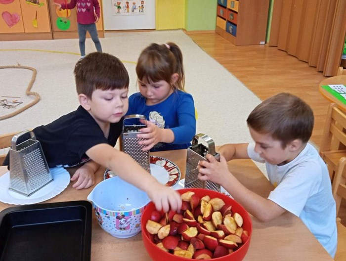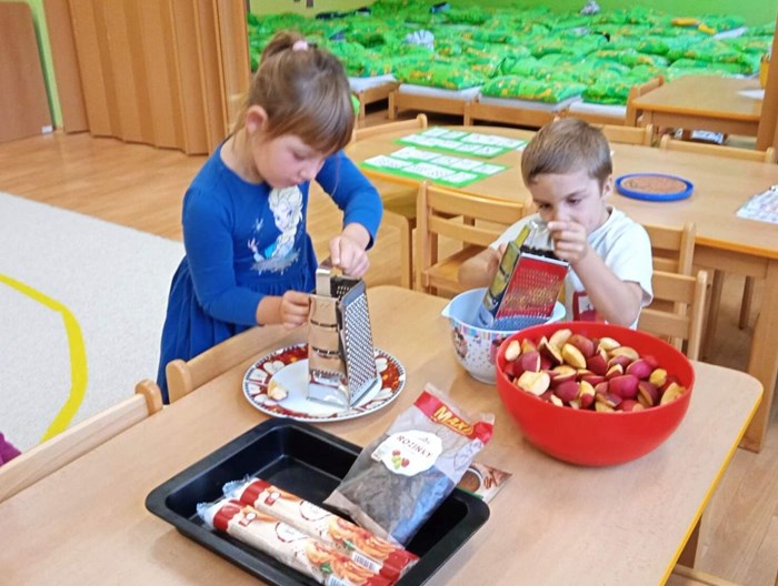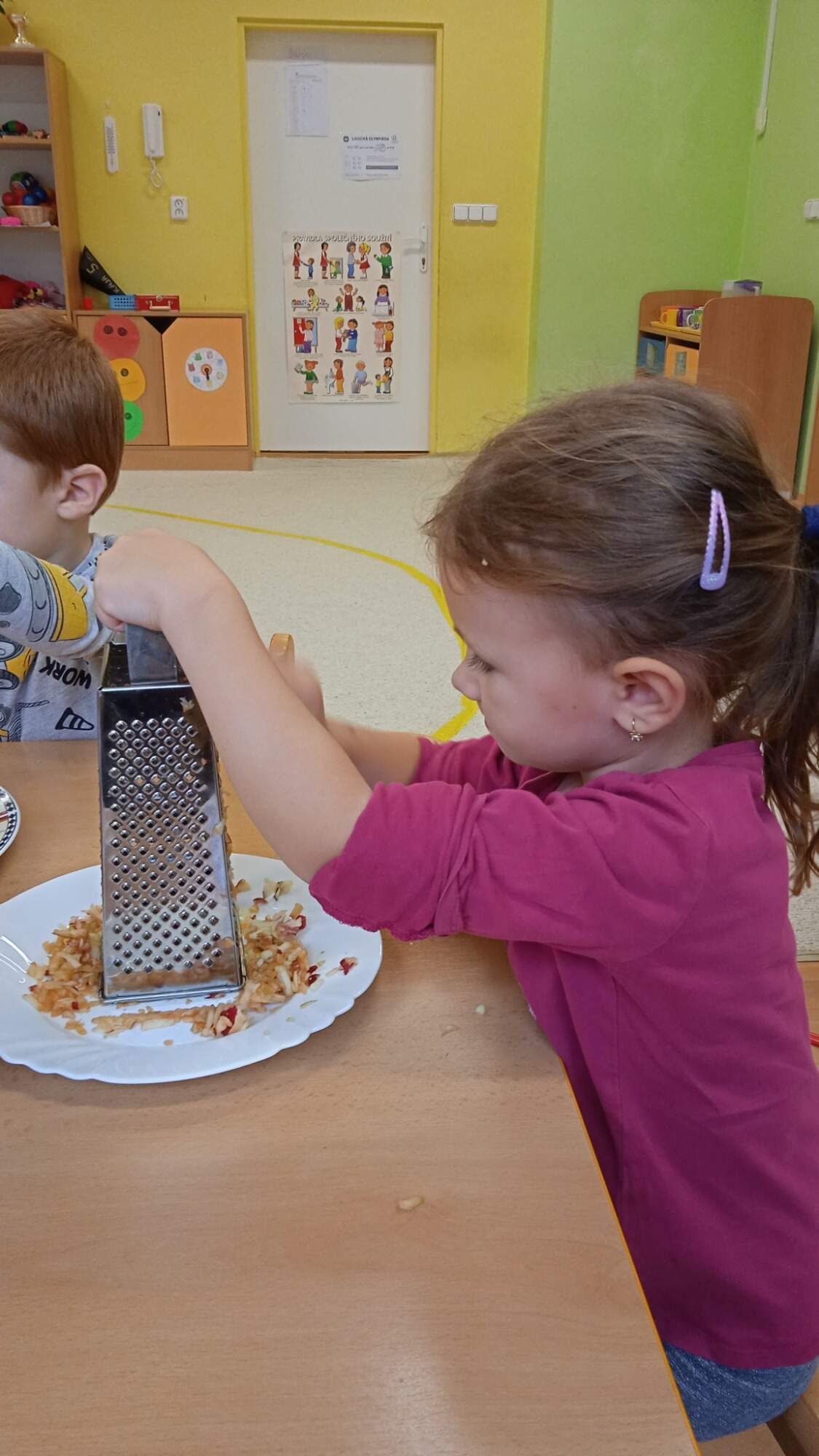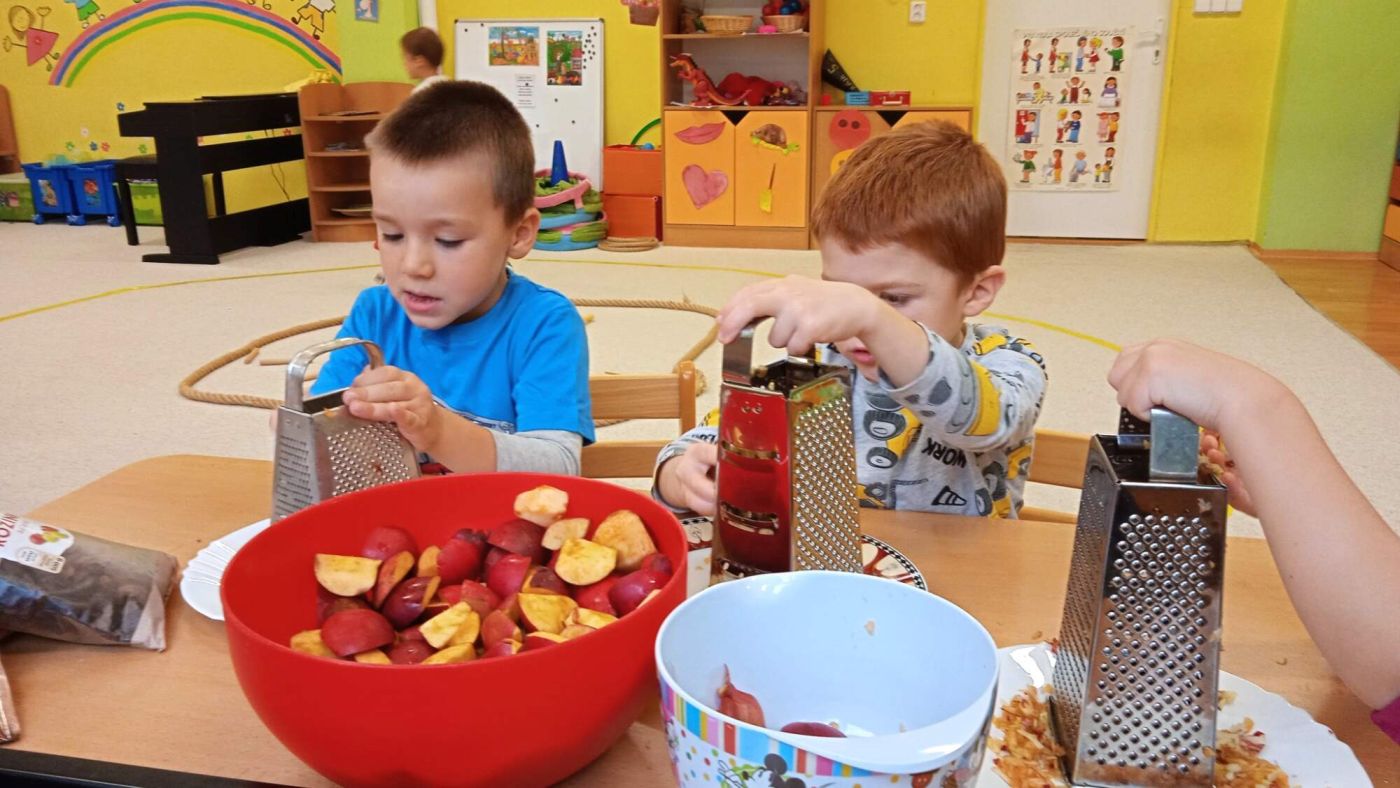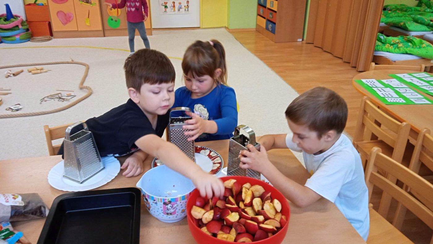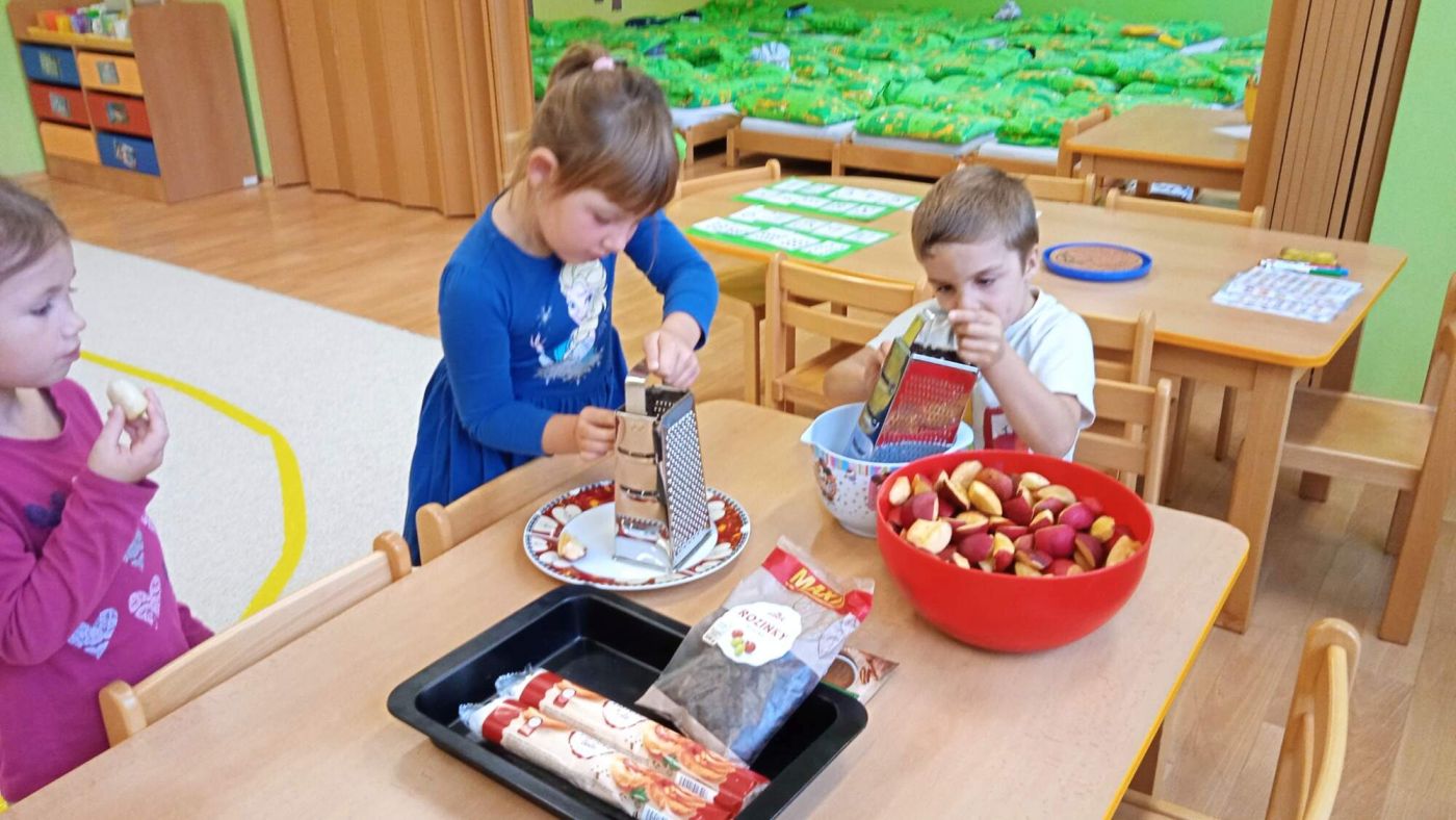 Děti uvolnily ruku při velkoformátové grafomotorice. Upekli jsme jablečný závin, byl výtečný.