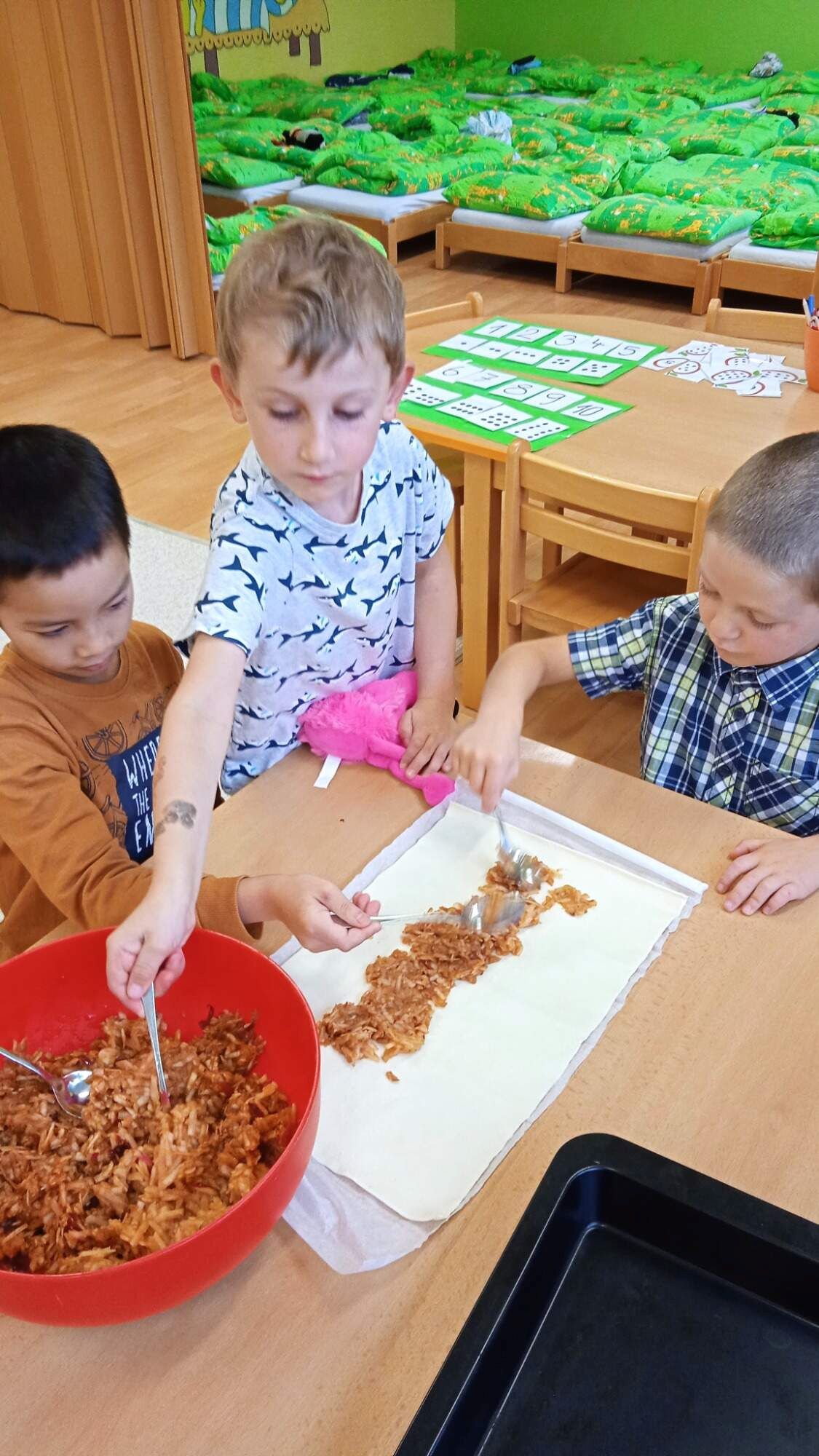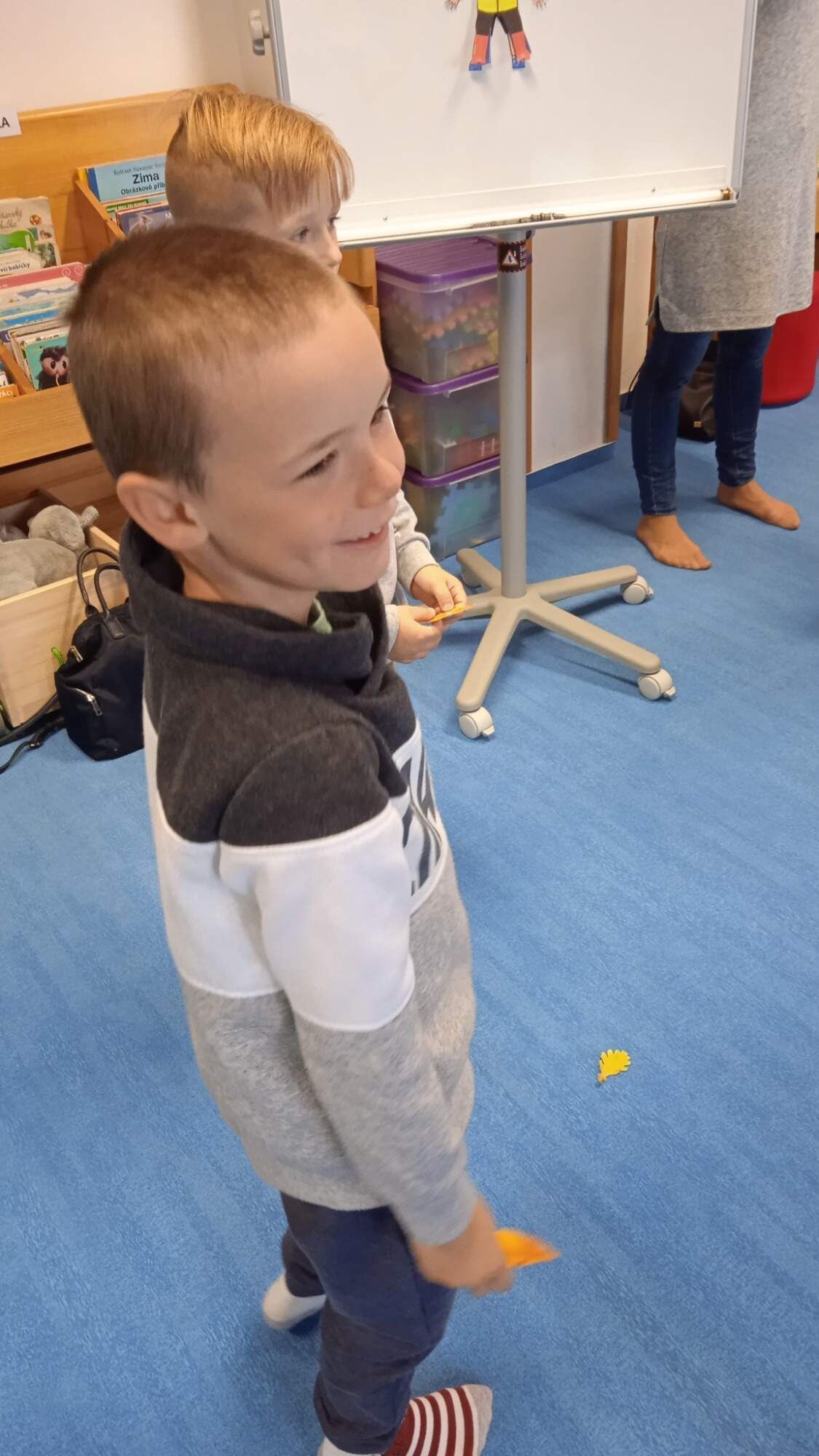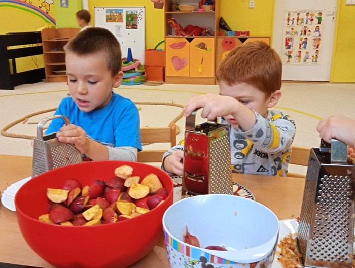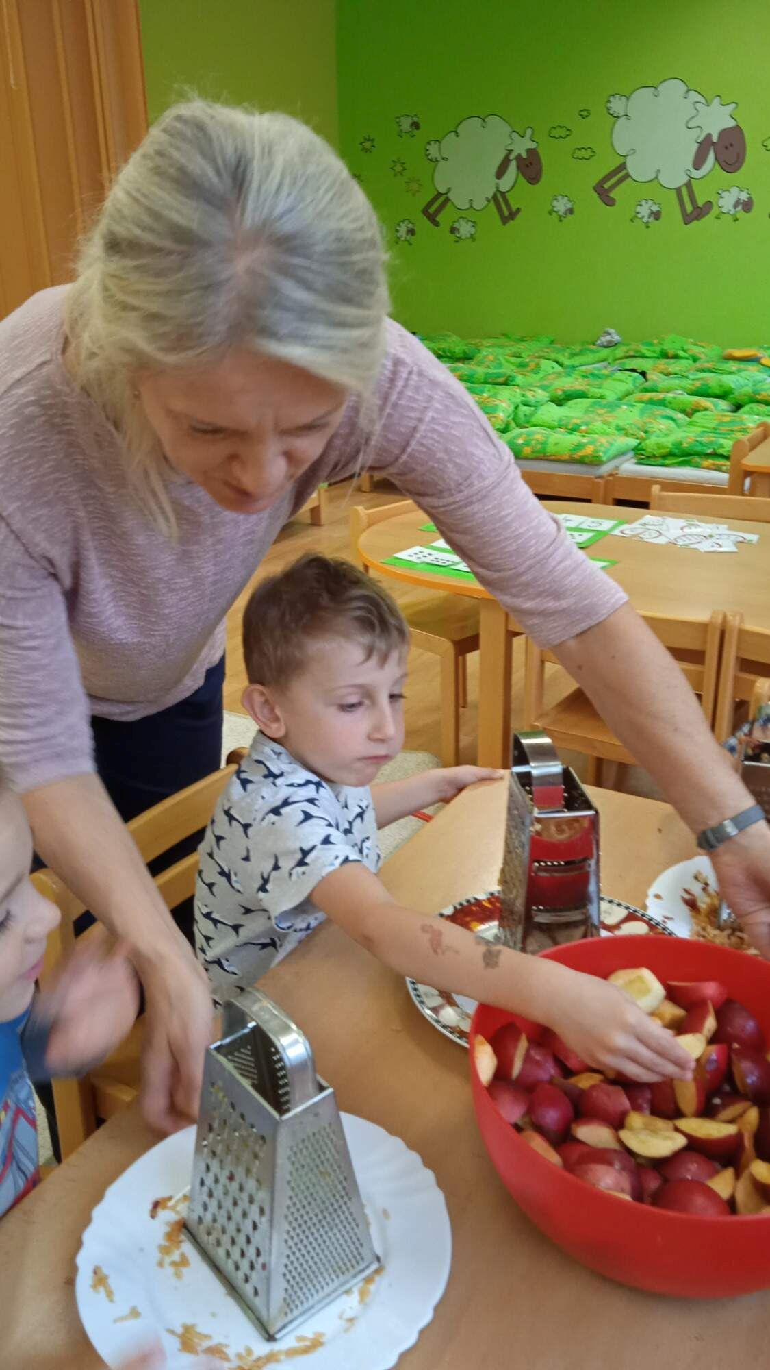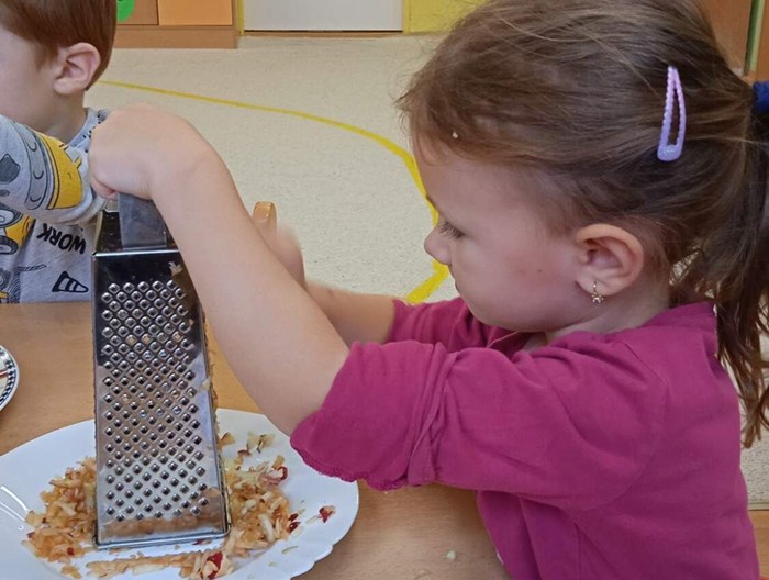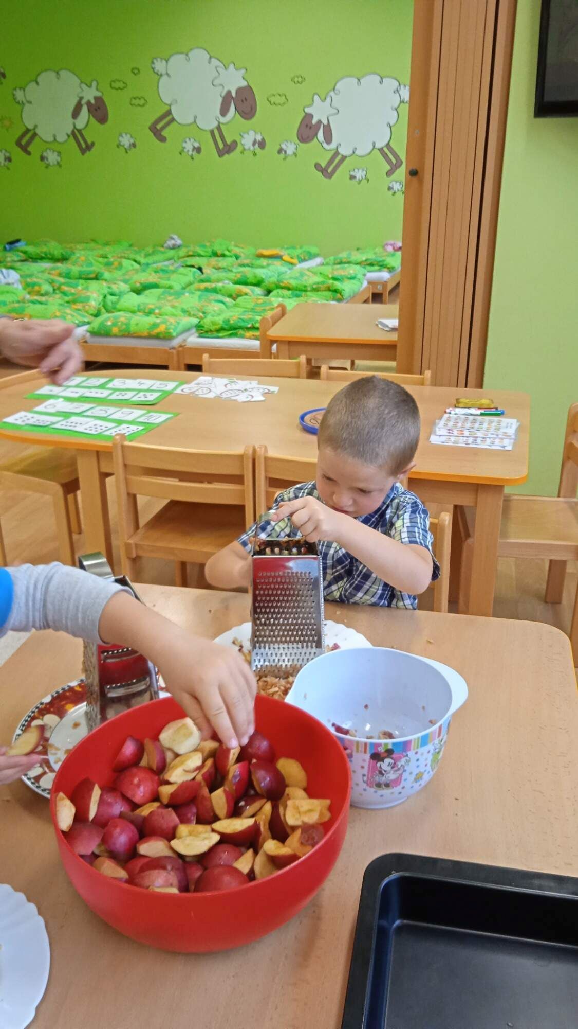 Děti uvolnily ruku při velkoformátové grafomotorice. Upekli jsme jablečný závin, byl výtečný.