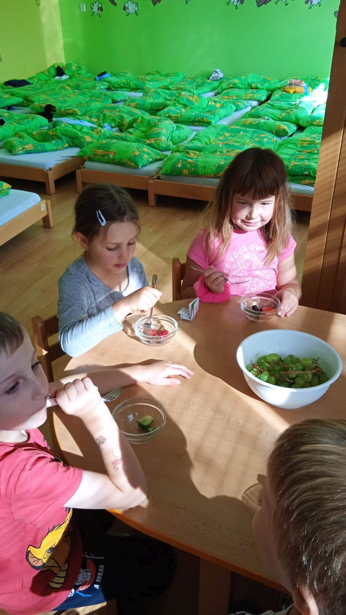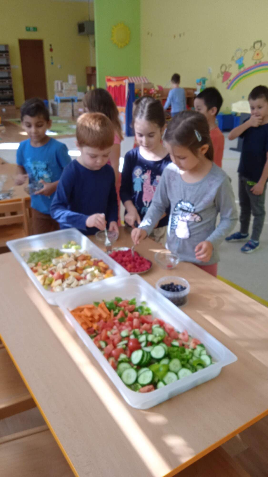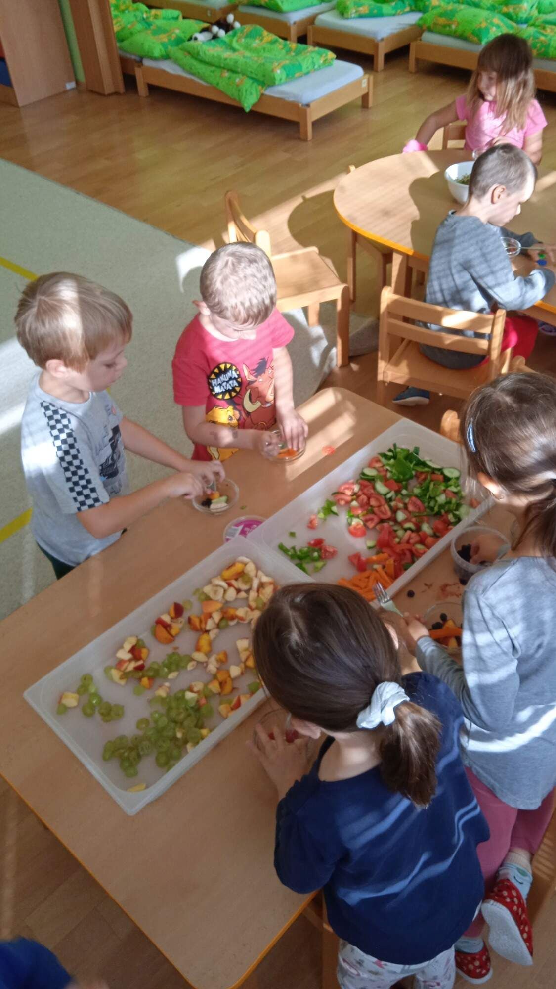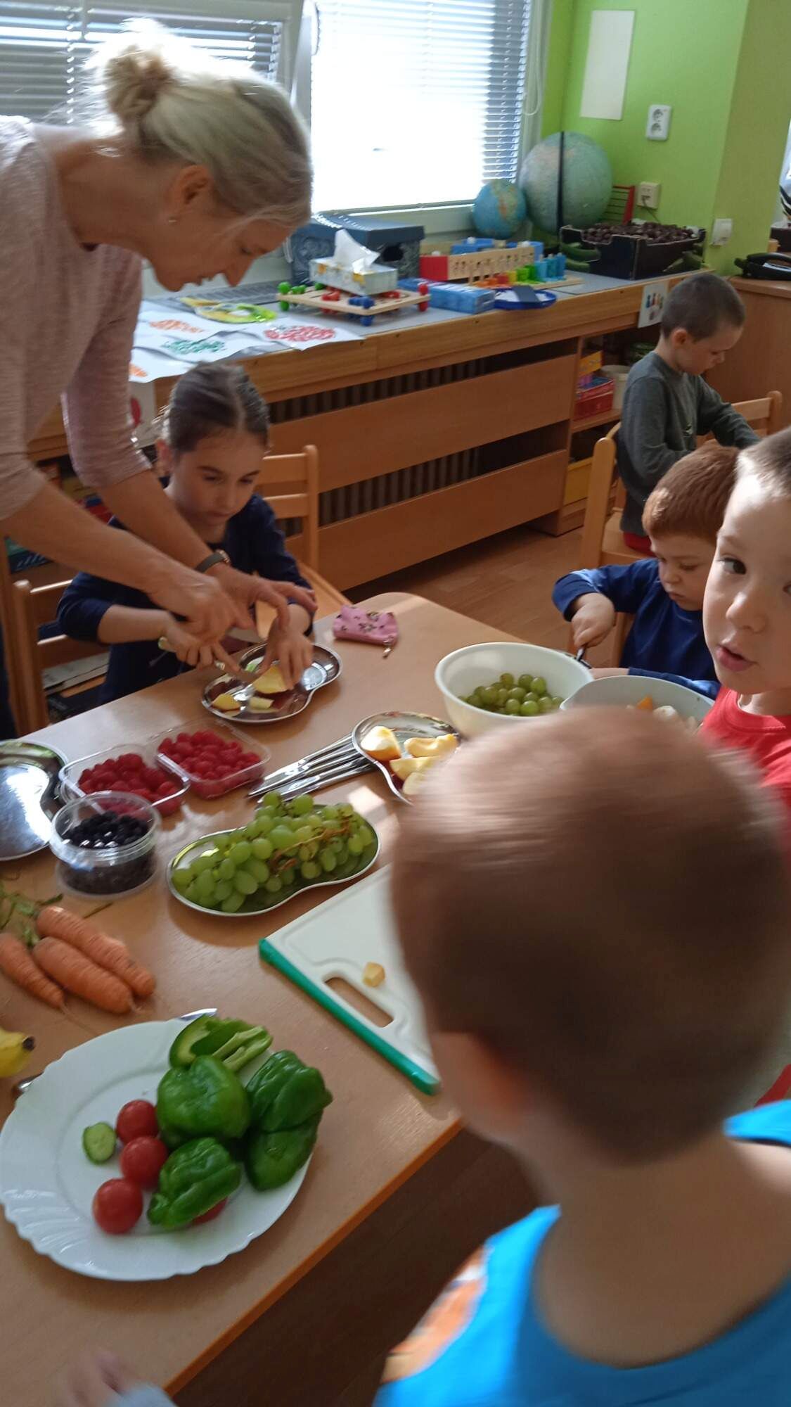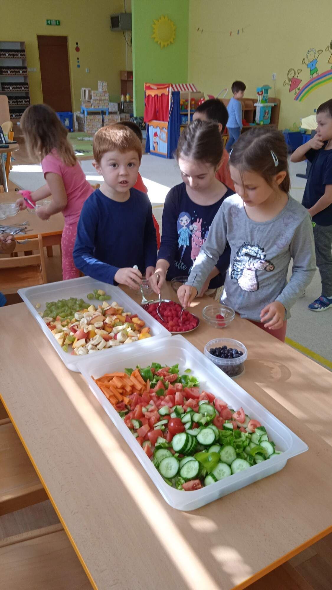 A na závěr si děti vlastnoručně připravily zdravý raut. Všechnu zeleninu a ovoce pokrájely a pak si hrály na restauraci, každý si nakládal podle libosti.