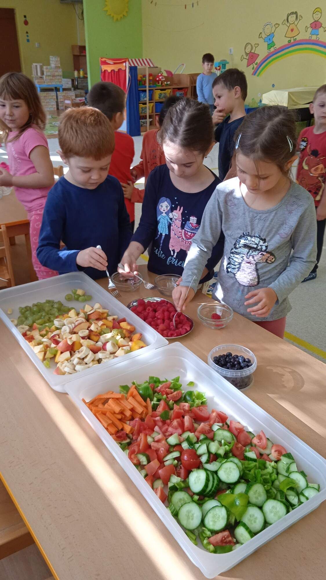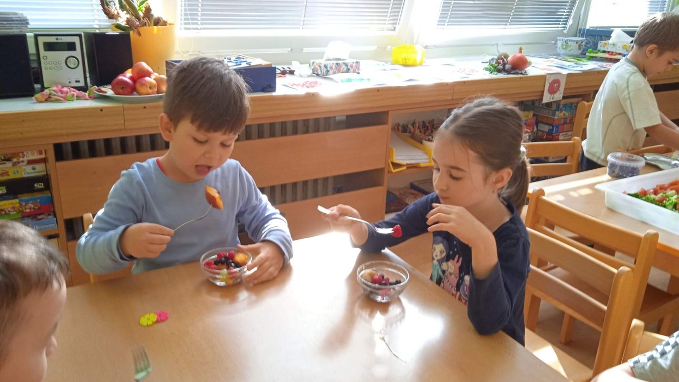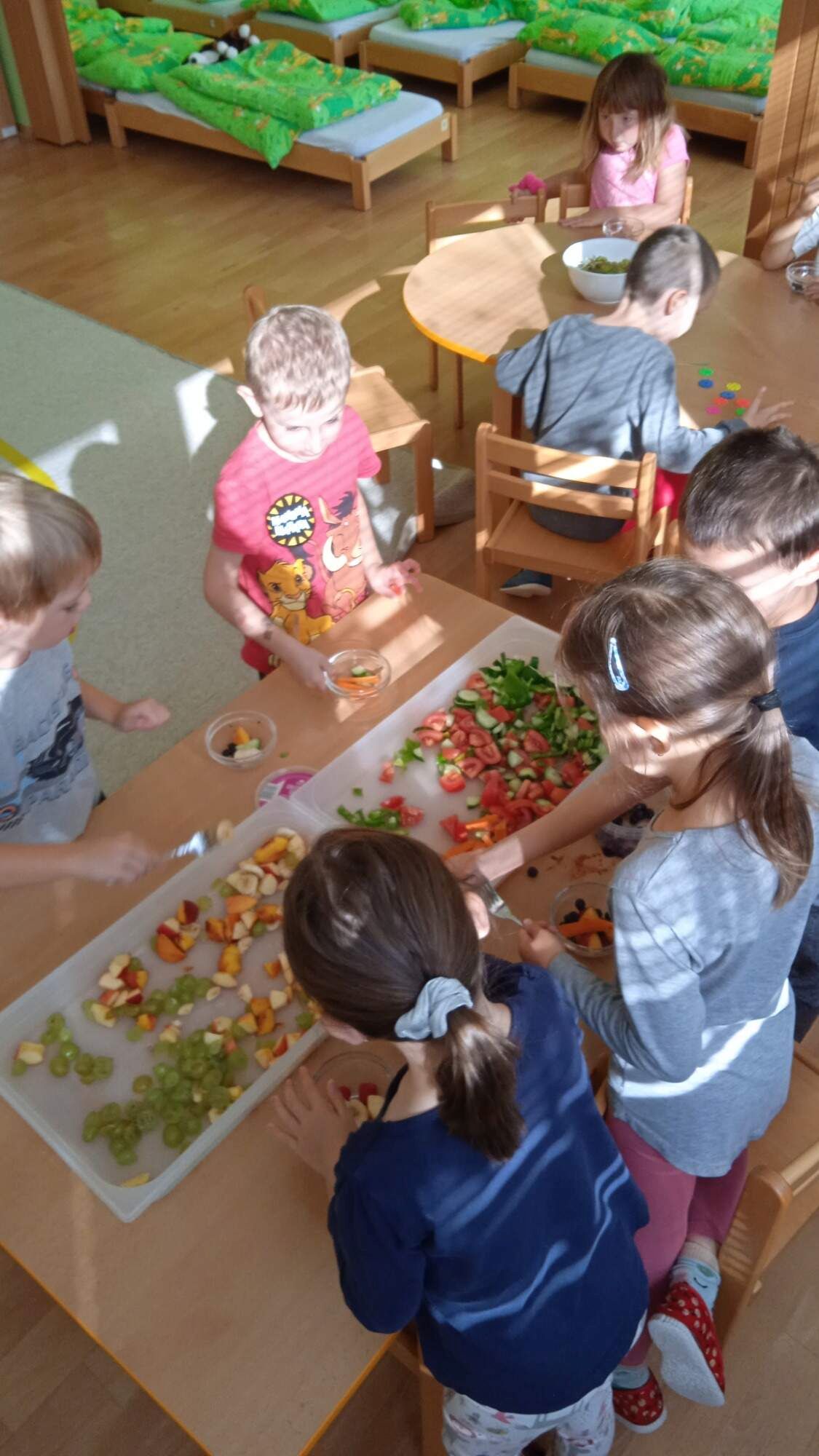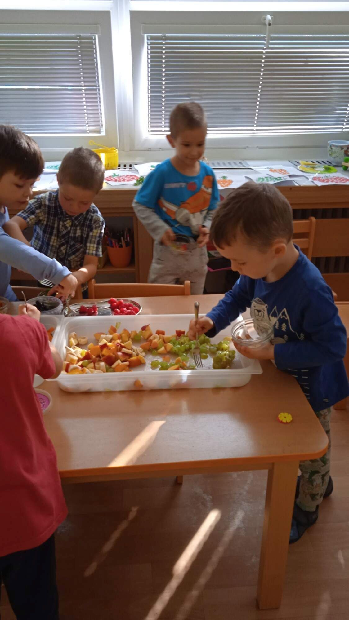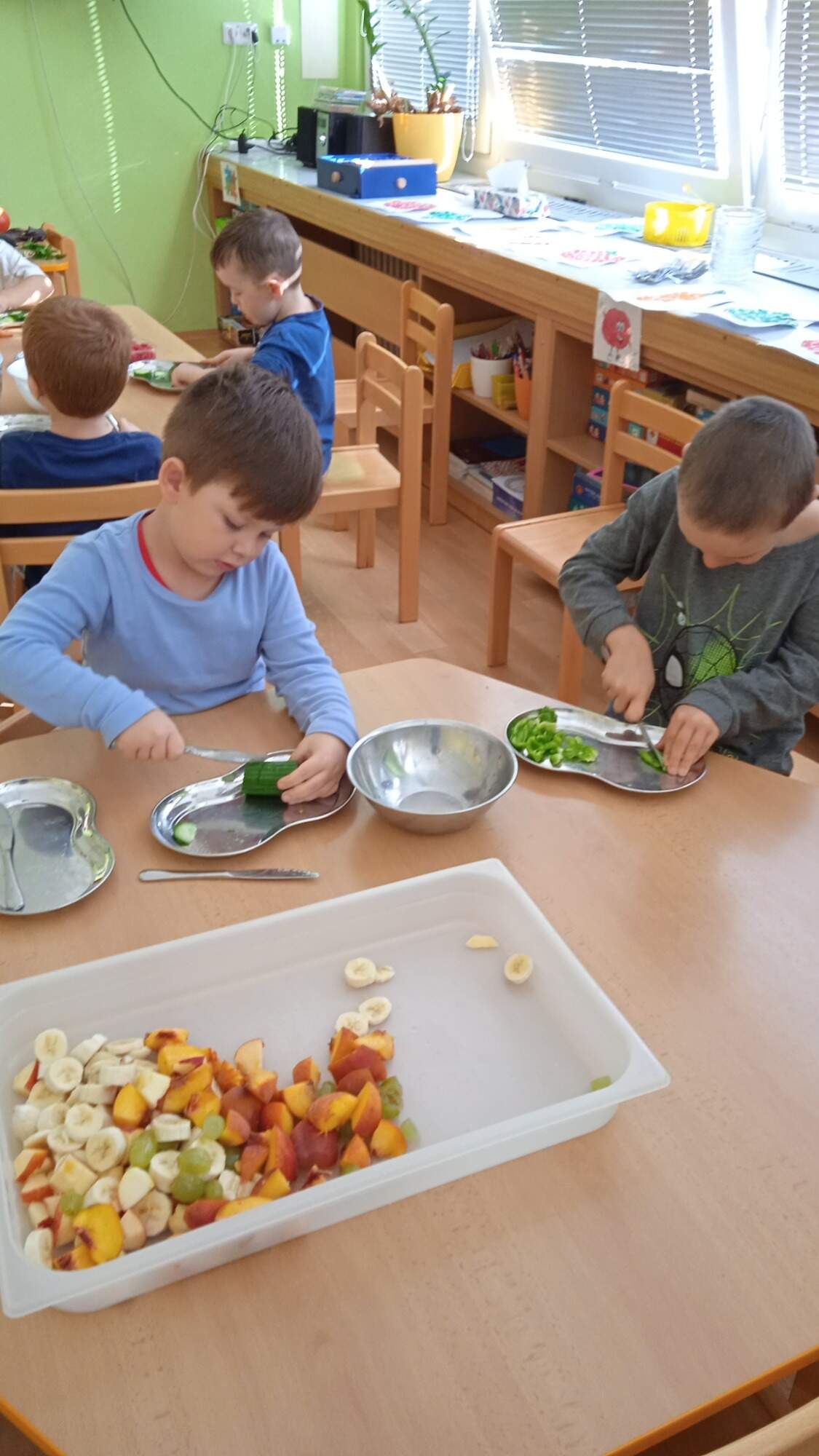 A na závěr si děti vlastnoručně připravily zdravý raut. Všechnu zeleninu a ovoce pokrájely a pak si hrály na restauraci, každý si nakládal podle libosti.
