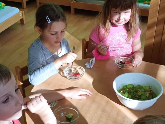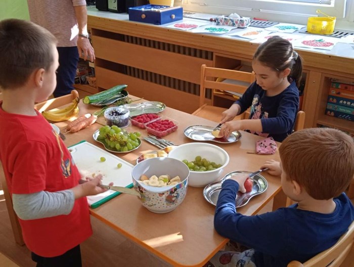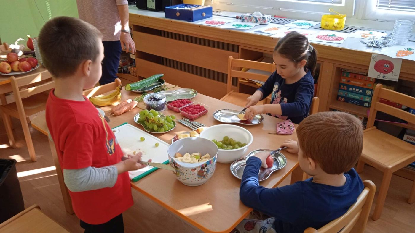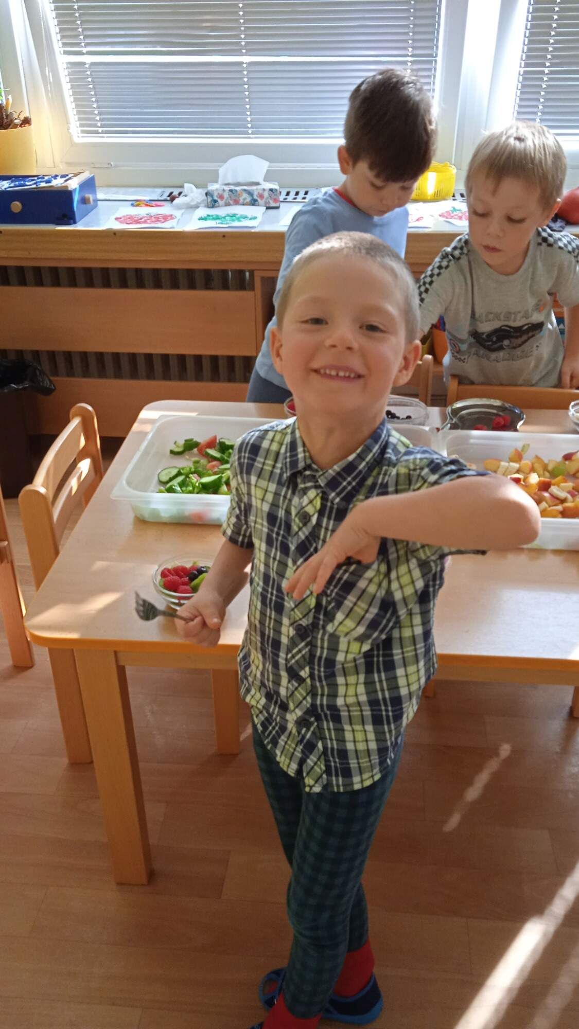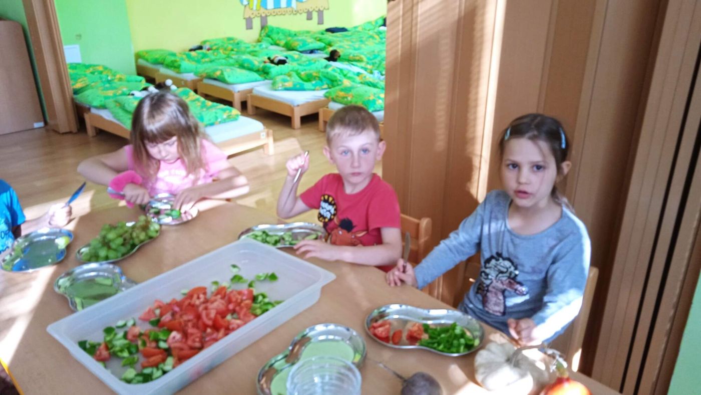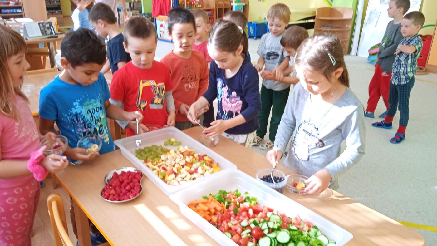 A na závěr si děti vlastnoručně připravily zdravý raut. Všechnu zeleninu a ovoce pokrájely a pak si hrály na restauraci, každý si nakládal podle libosti.