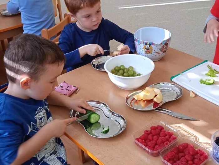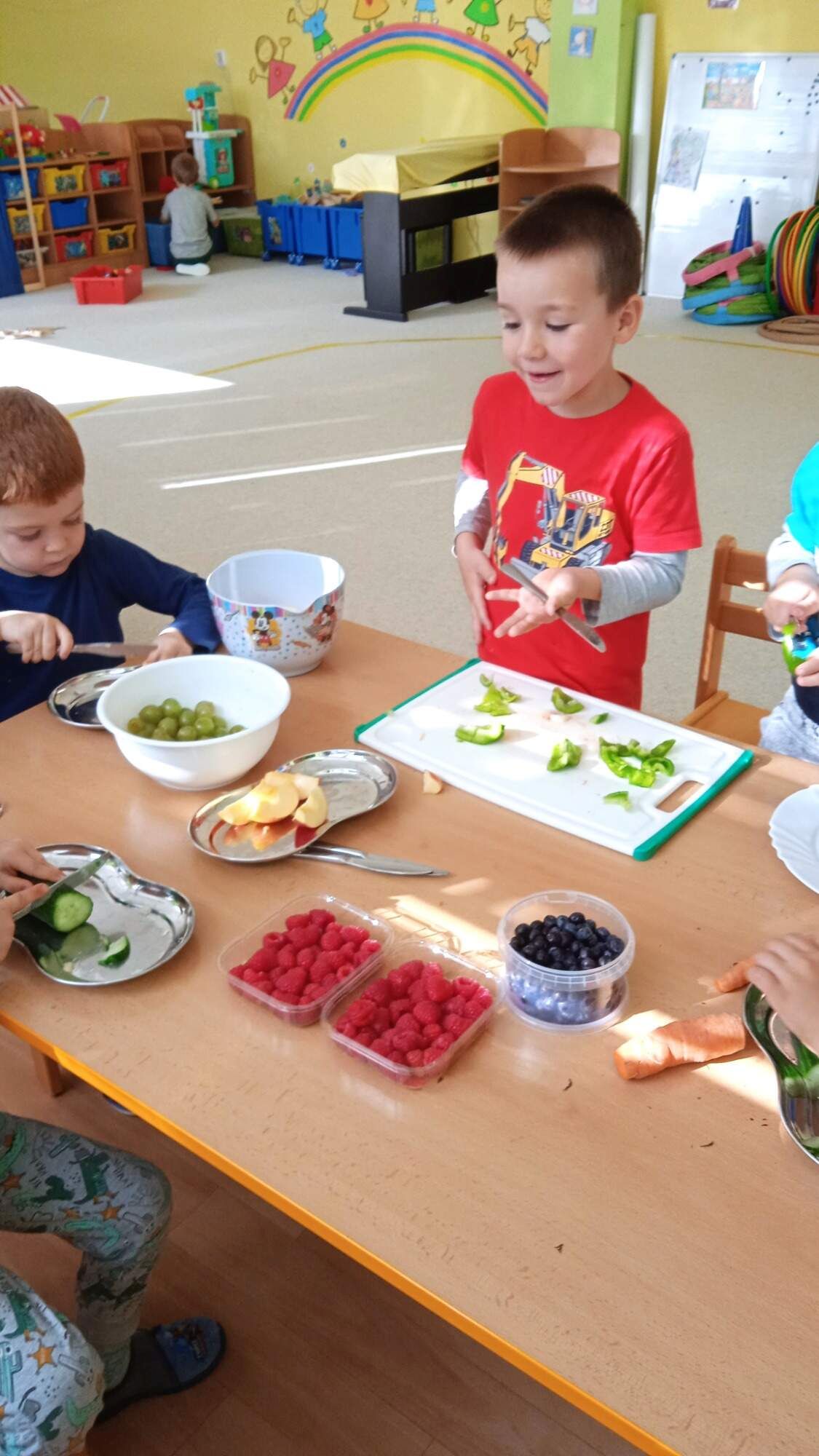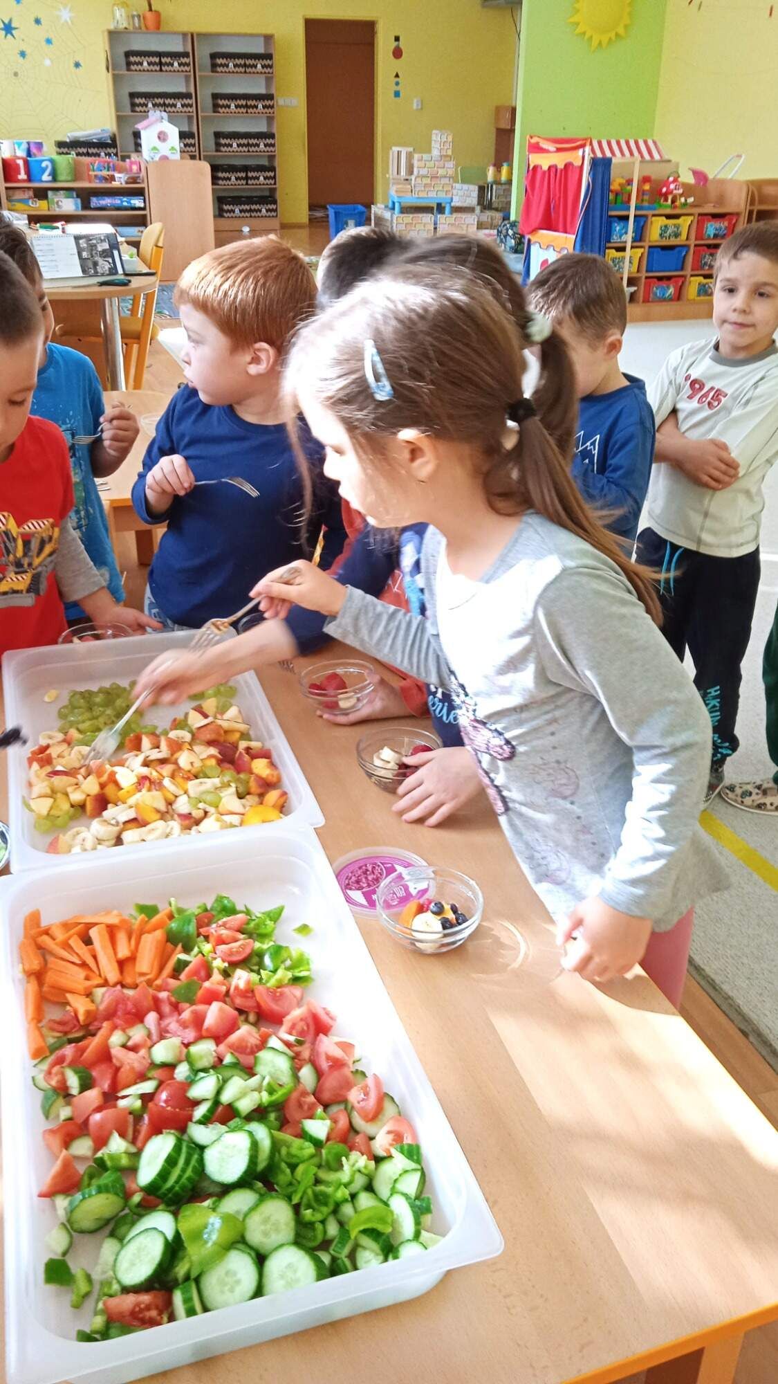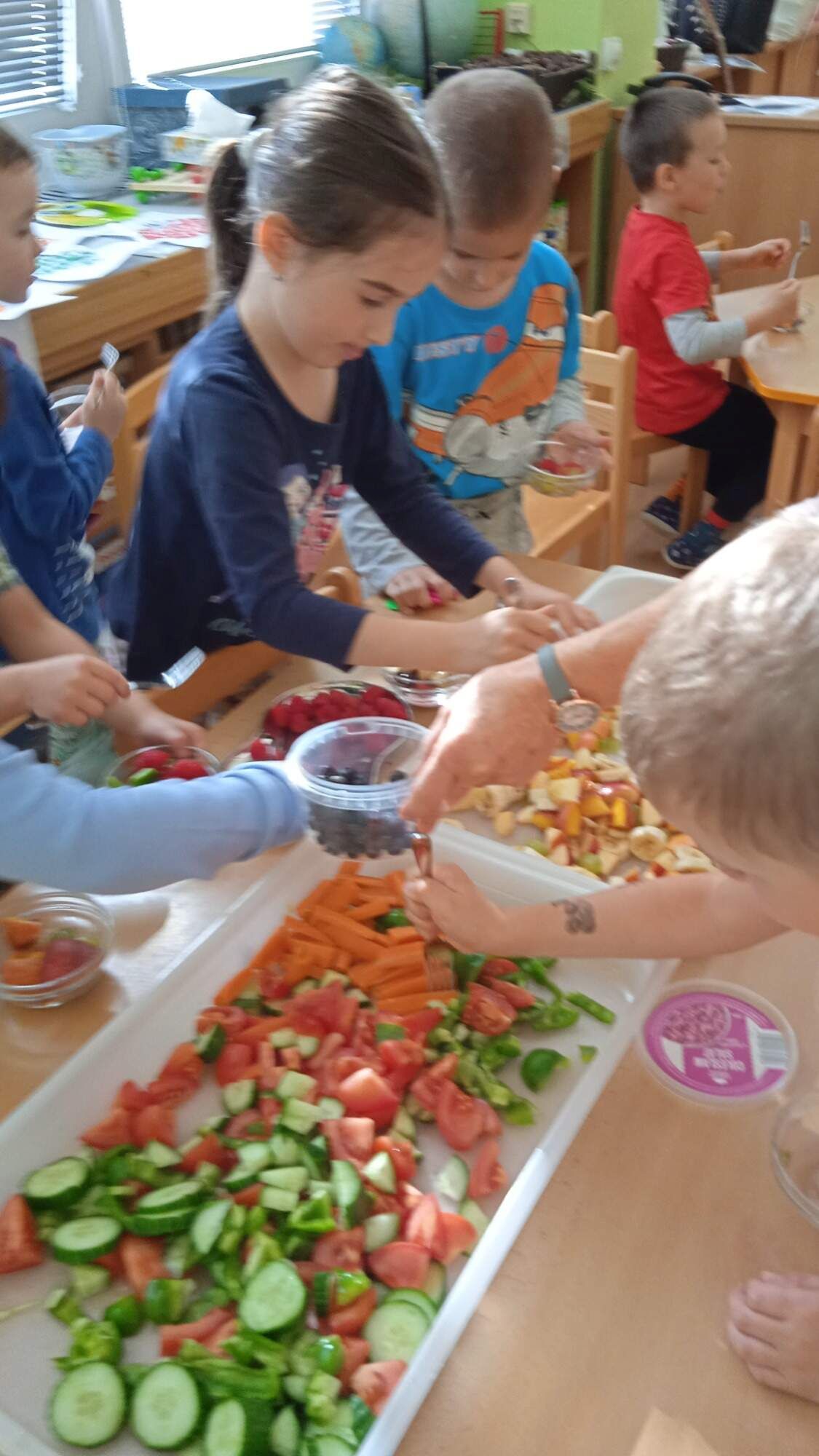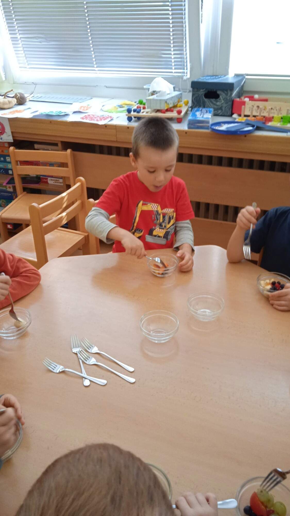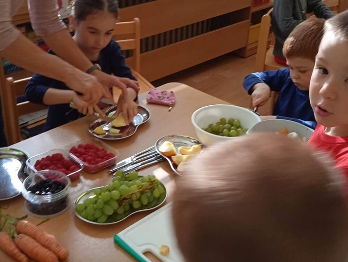 A na závěr si děti vlastnoručně připravily zdravý raut. Všechnu zeleninu a ovoce pokrájely a pak si hrály na restauraci, každý si nakládal podle libosti.