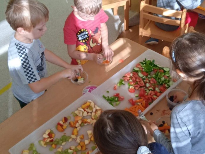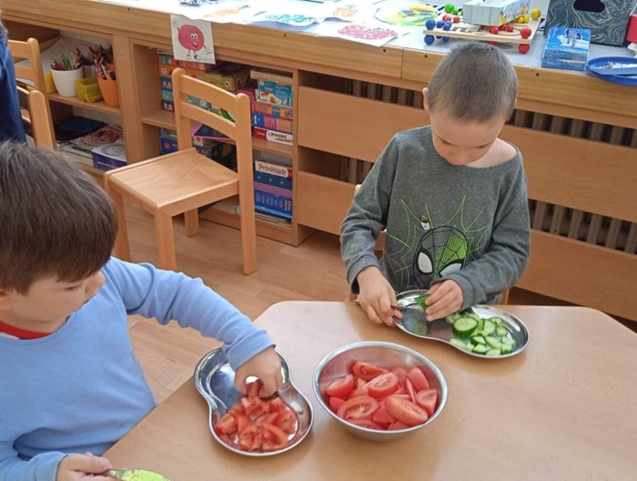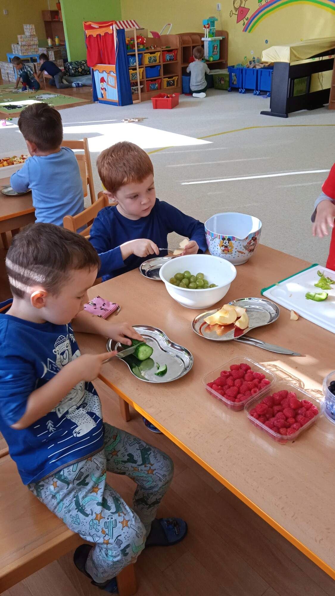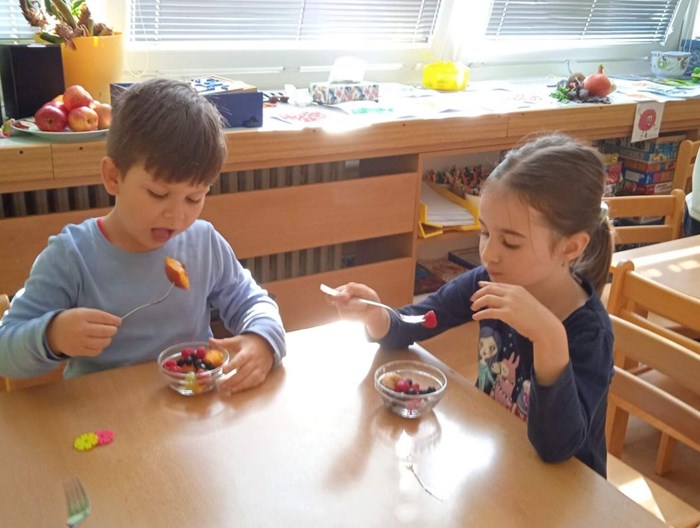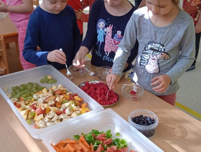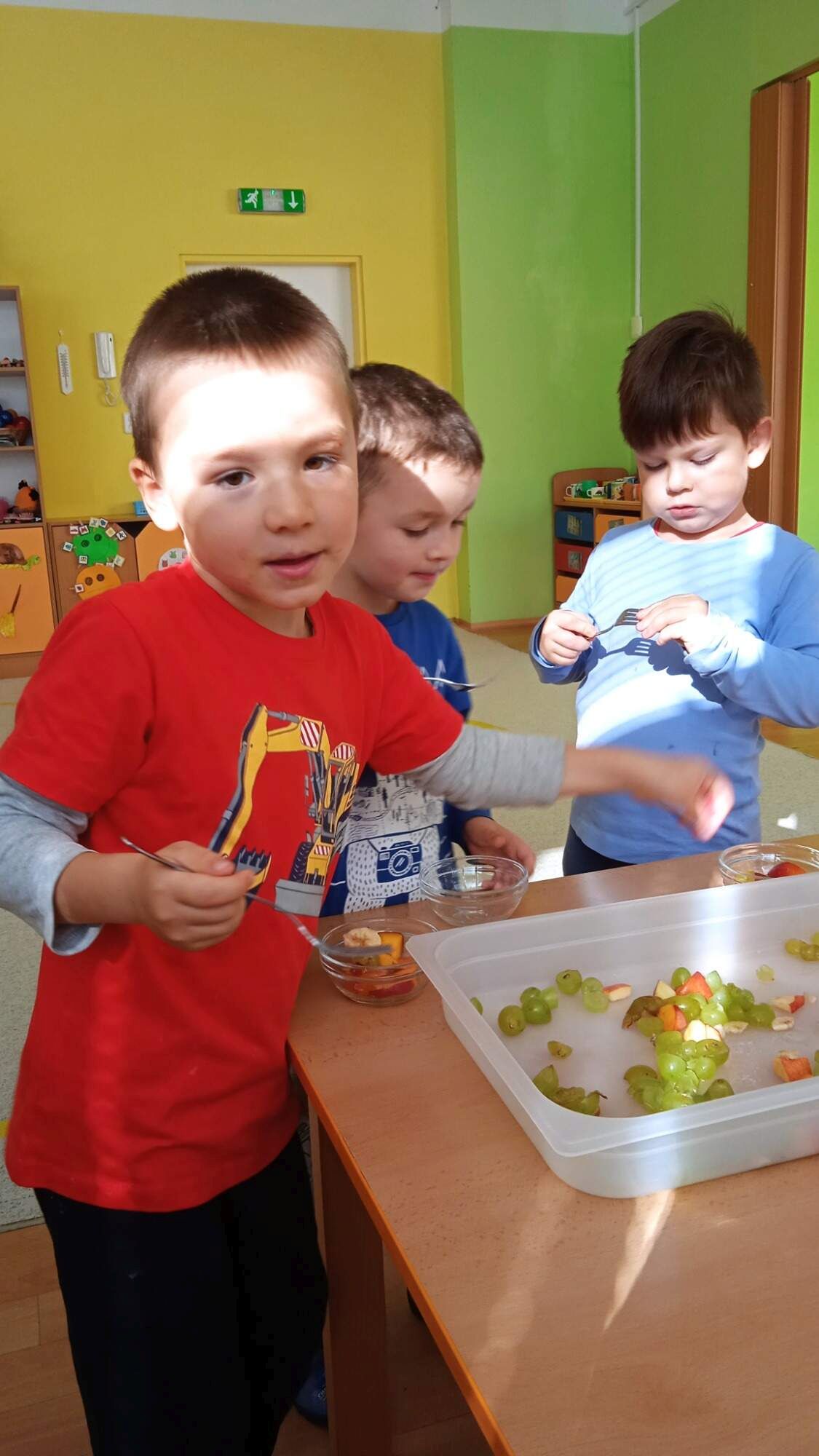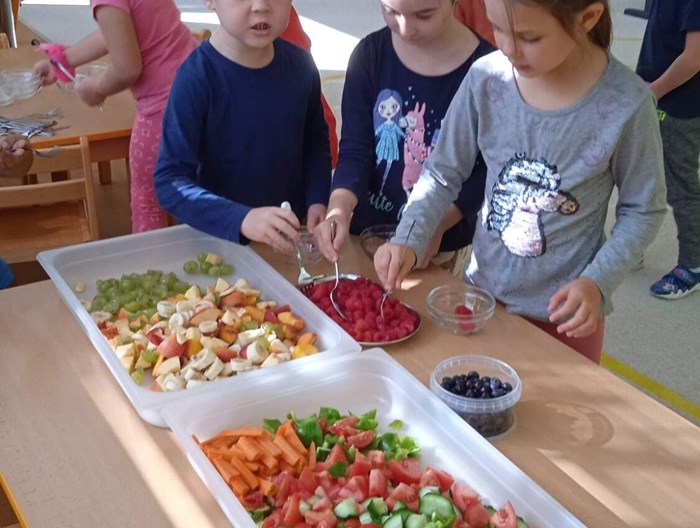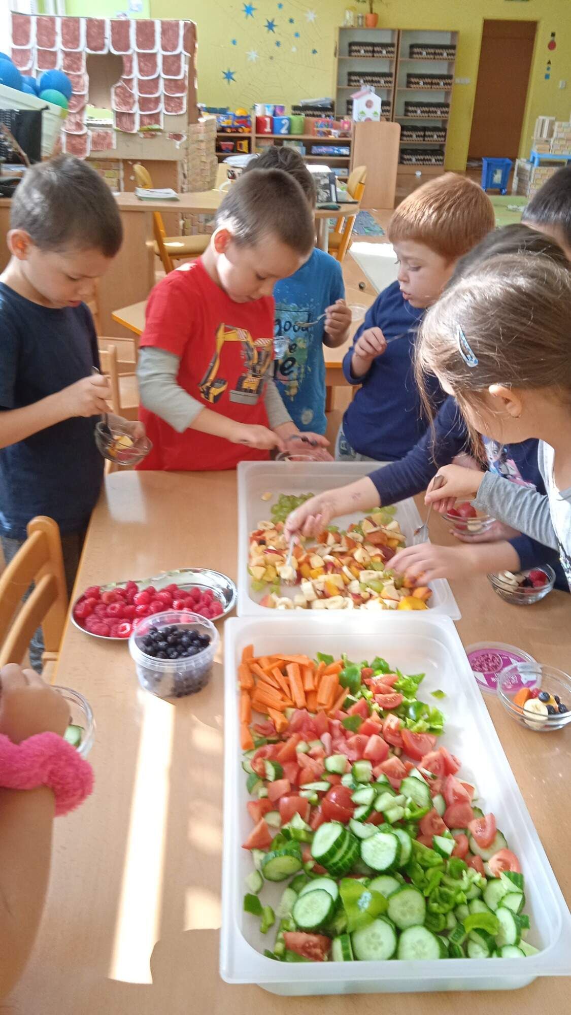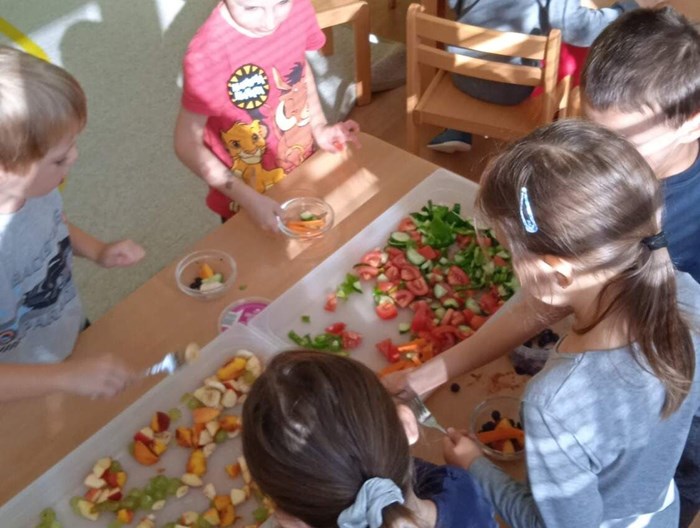 A na závěr si děti vlastnoručně připravily zdravý raut. Všechnu zeleninu a ovoce pokrájely a pak si hrály na restauraci, každý si nakládal podle libosti.