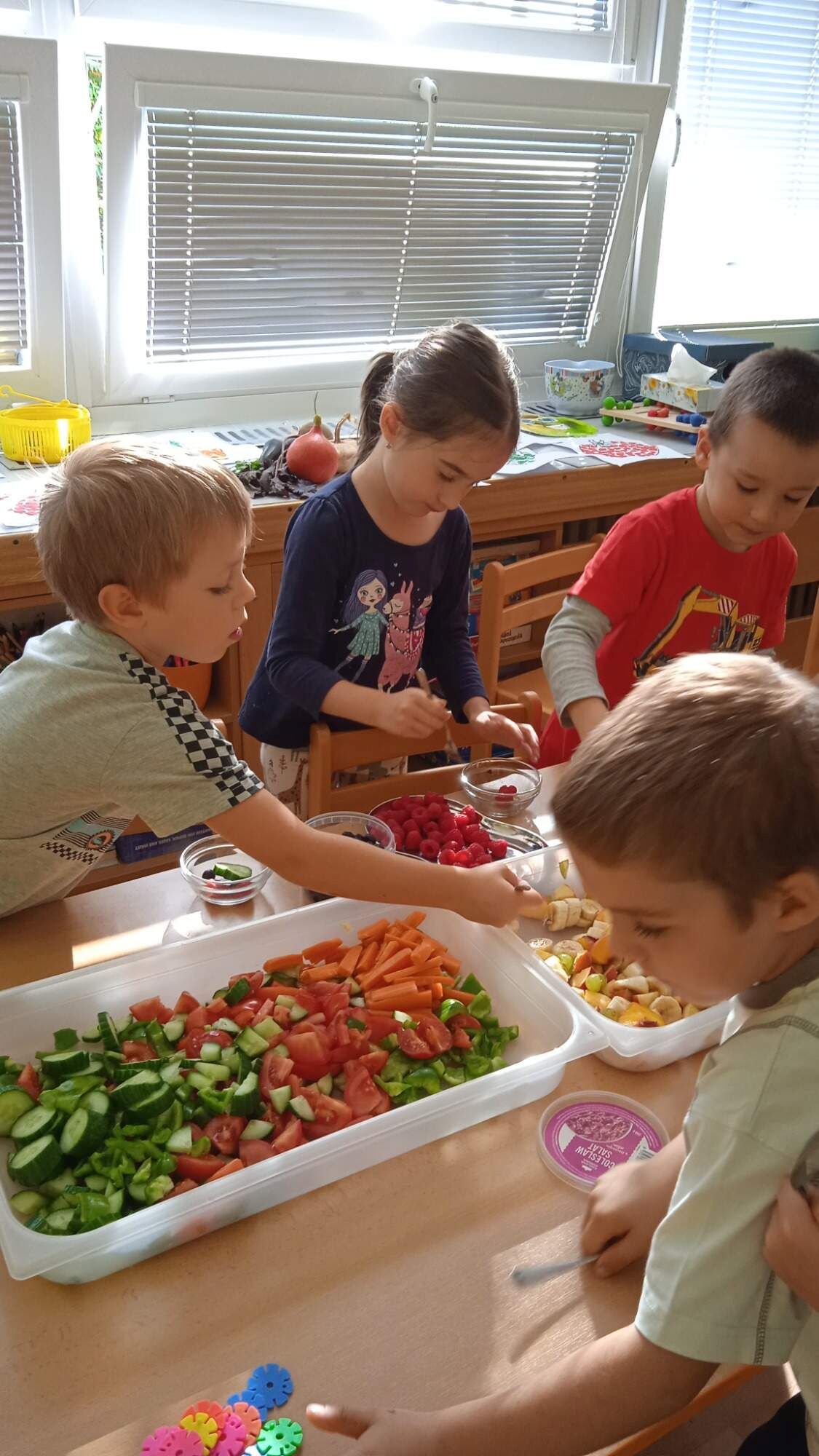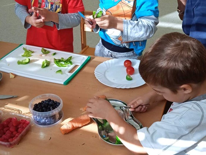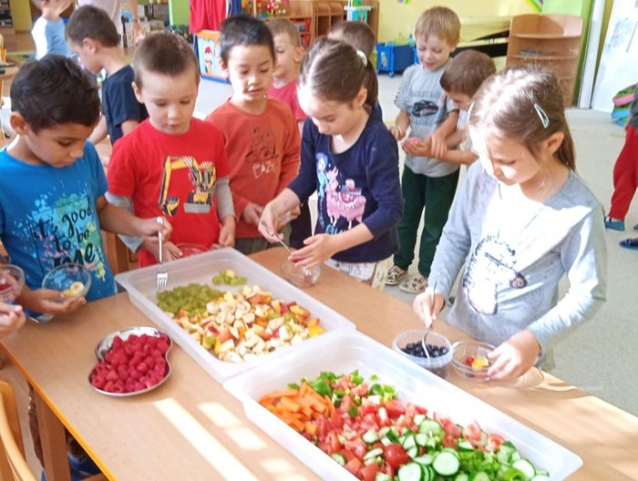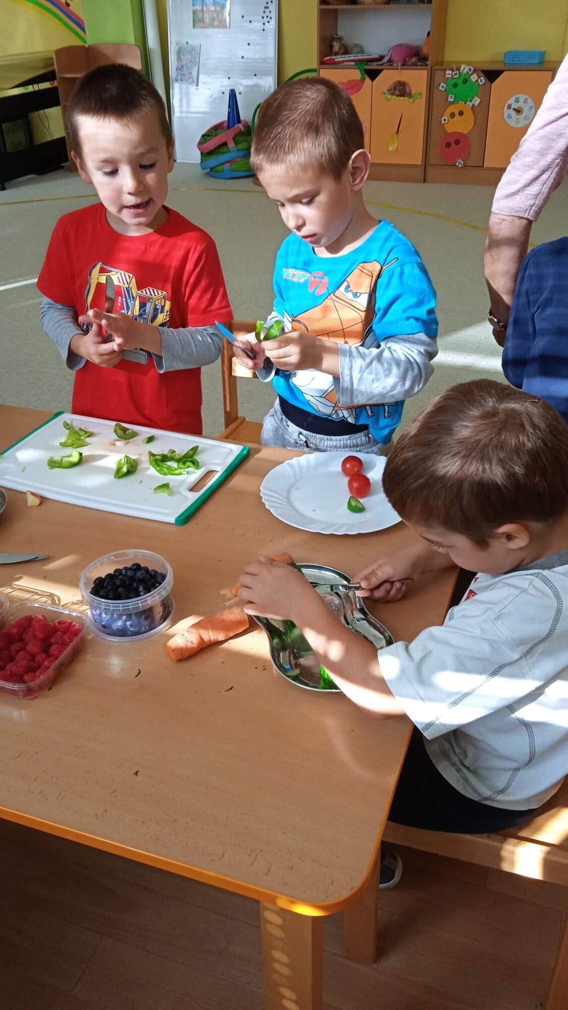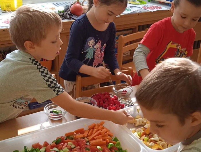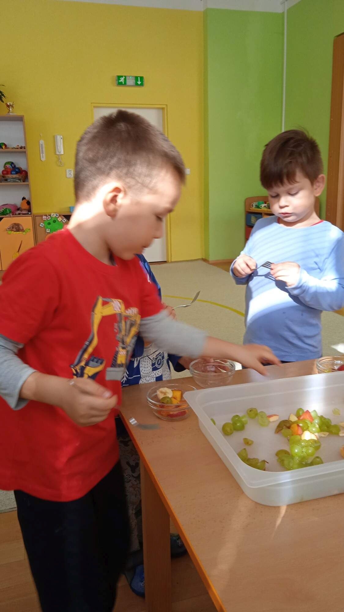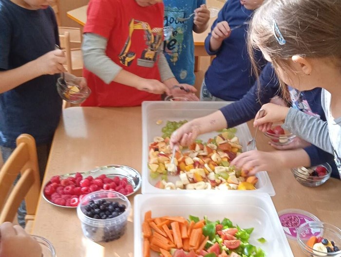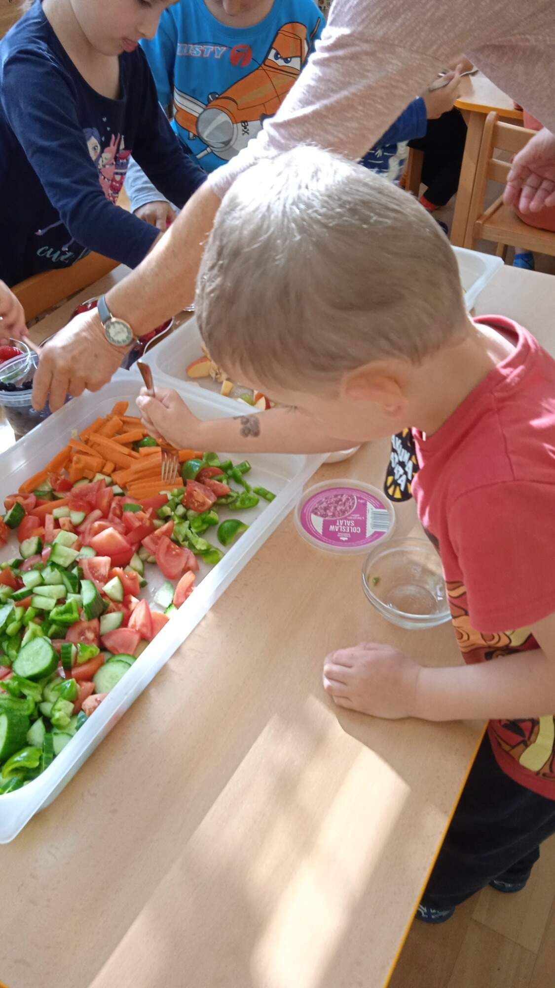 A na závěr si děti vlastnoručně připravily zdravý raut. Všechnu zeleninu a ovoce pokrájely a pak si hrály na restauraci, každý si nakládal podle libosti.