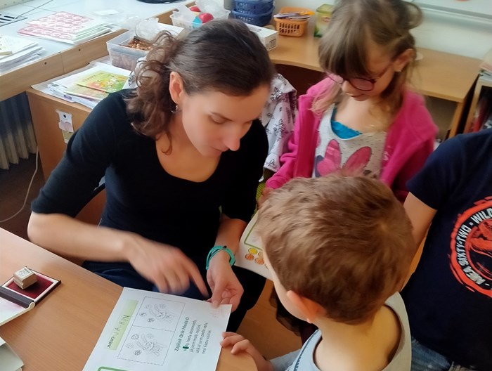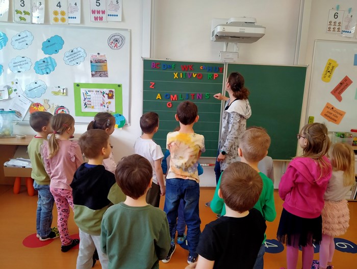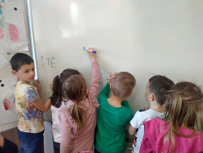 Poté následovalo čtení. Děti ze ZŠ četly, co děti napsaly na tabuli. Pak také plnily úkoly z pracovního listu. Dětem se návštěva moc líbila.