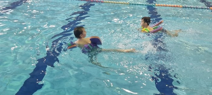 Několik prvních lekcí se děti seznamovaly s vodou prostřednictvím nejrůznějších her a soutěží. Učily se plavat nejdříve v malém bazénu, ale teď už si troufají také na velký bazén. Jsme prostě pašáci a vodu si moc užíváme.