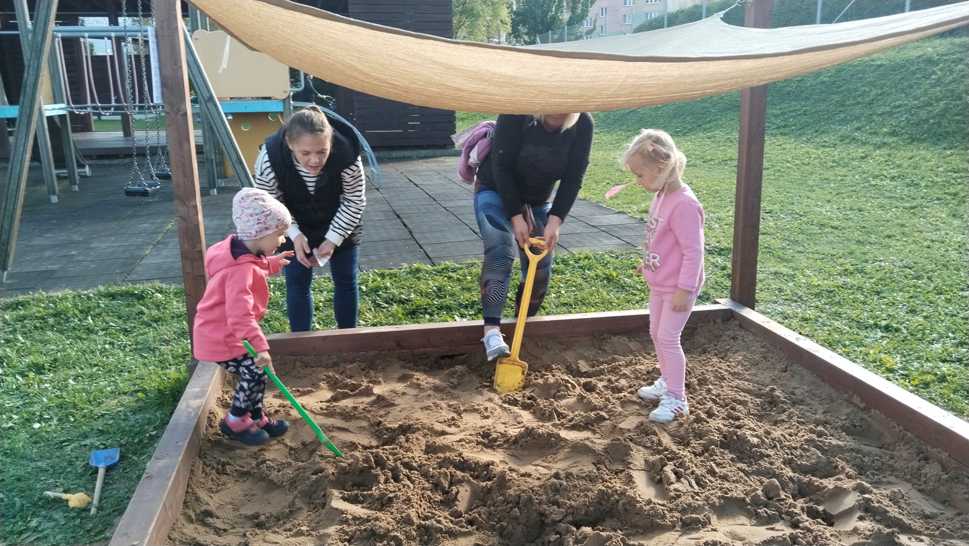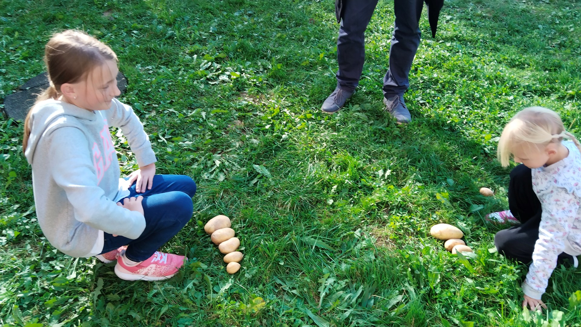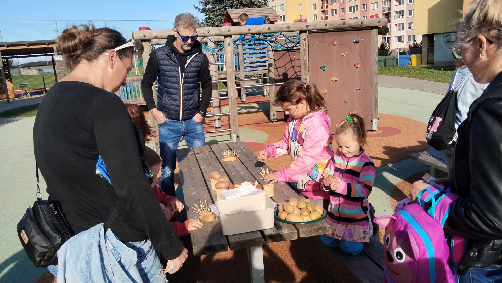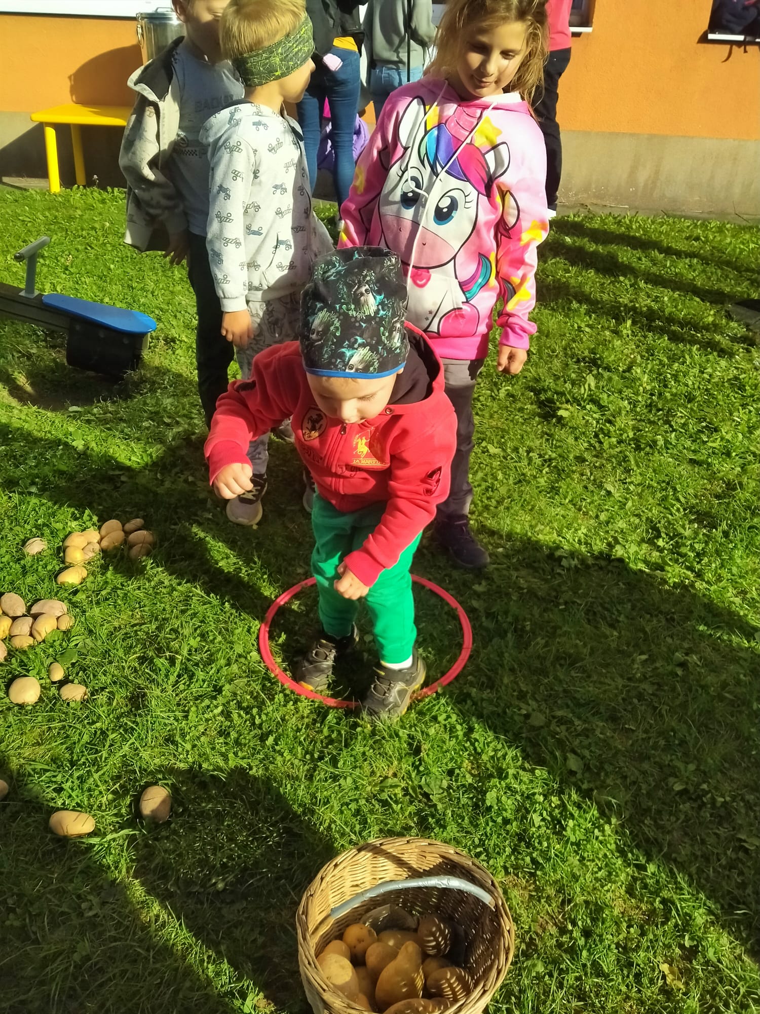 Počasí jako stvořené pro hry na zahradě nám krásně vyšlo pro uspořádání "Bramboriády." Tuto podzimní plodinu jsme využili na 8 stanovištích. Děti řadily brambory podle velikosti, házely s ní na koš, vykopávaly ji z písku, tvořily z ní ježka, nosily ji na vařečce a také skákaly v pytli. Na závěr jsme si pak pochutnali na výborné bramboračce, kterou uvařila naše paní kuchařka Marcelka.