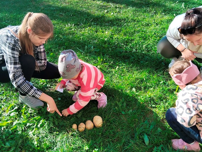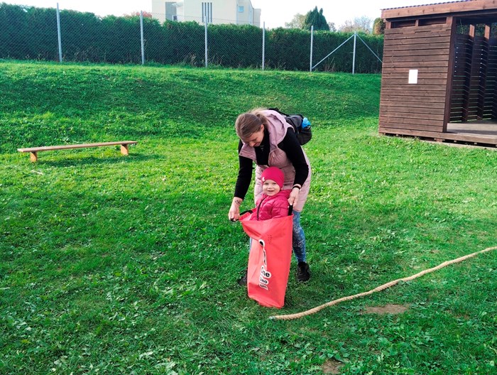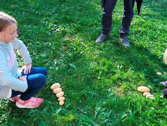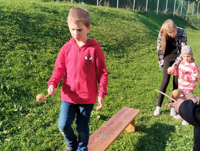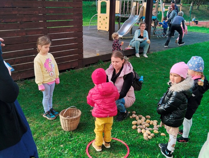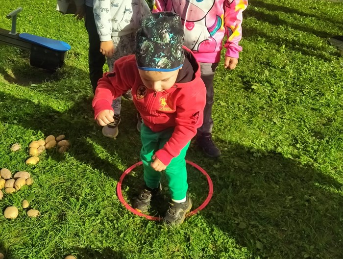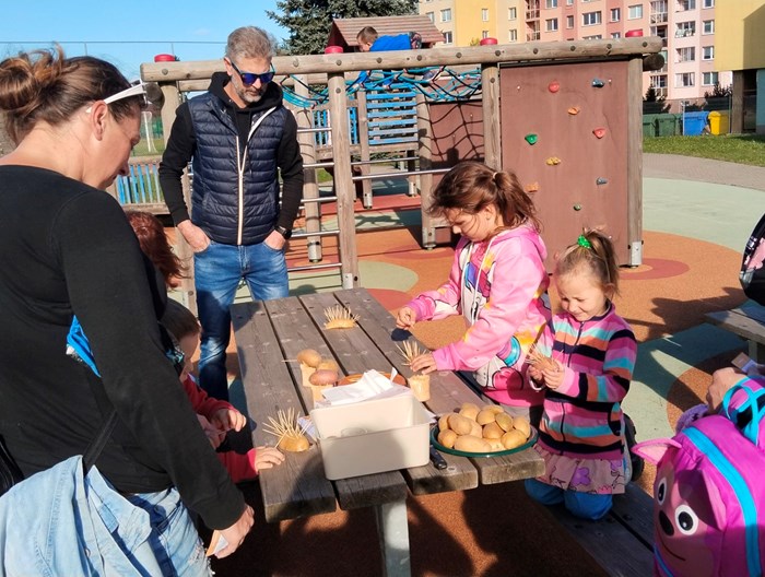 Počasí jako stvořené pro hry na zahradě nám krásně vyšlo pro uspořádání "Bramboriády." Tuto podzimní plodinu jsme využili na 8 stanovištích. Děti řadily brambory podle velikosti, házely s ní na koš, vykopávaly ji z písku, tvořily z ní ježka, nosily ji na vařečce a také skákaly v pytli. Na závěr jsme si pak pochutnali na výborné bramboračce, kterou uvařila naše paní kuchařka Marcelka.