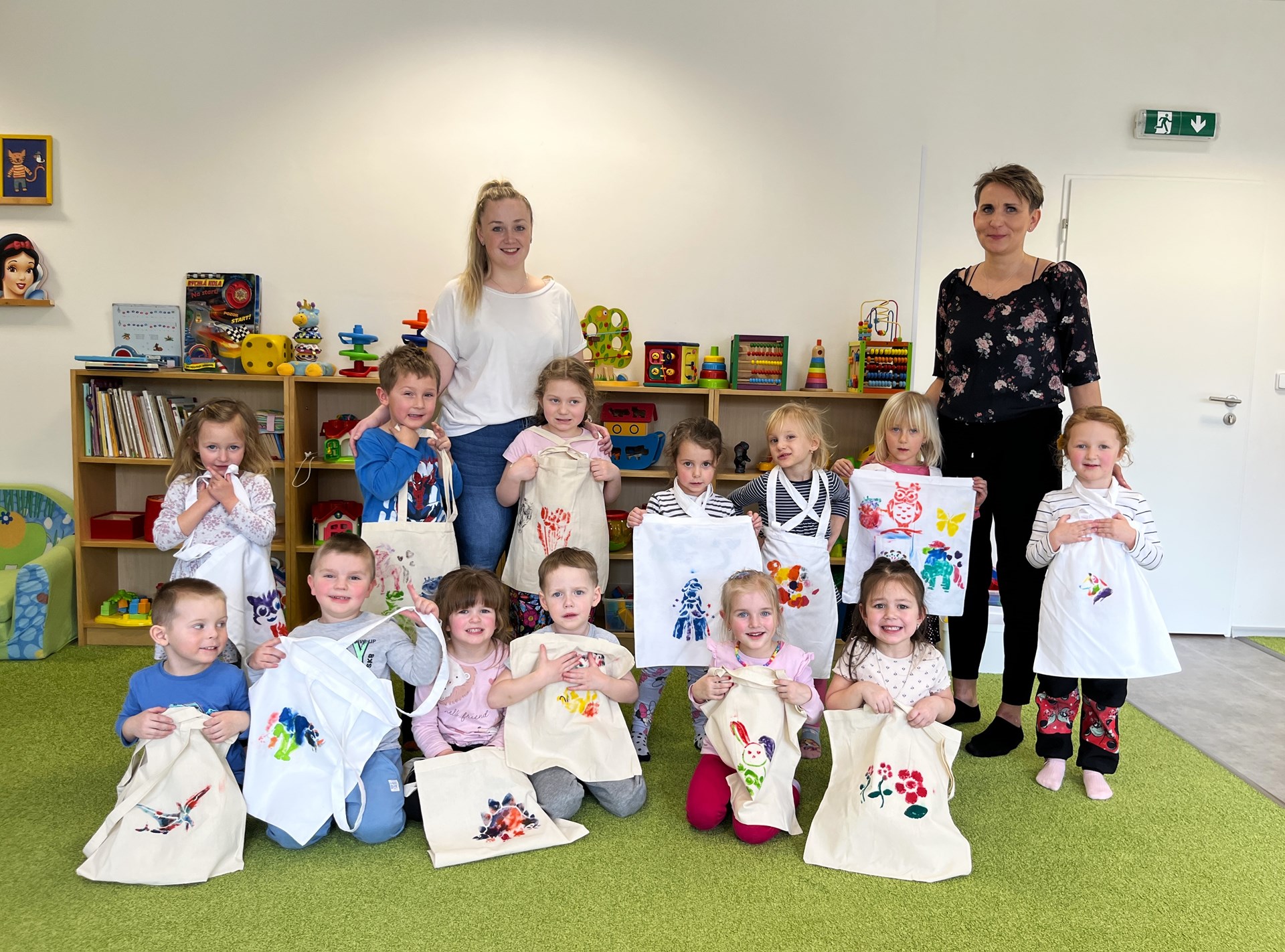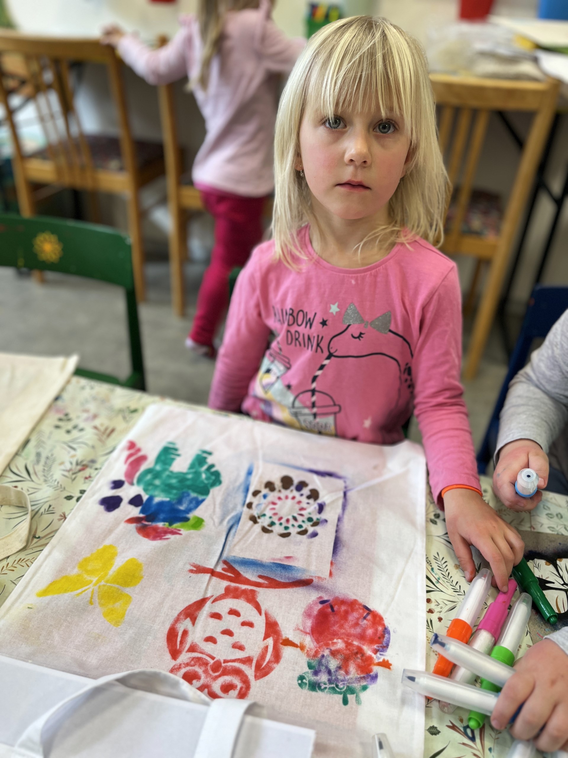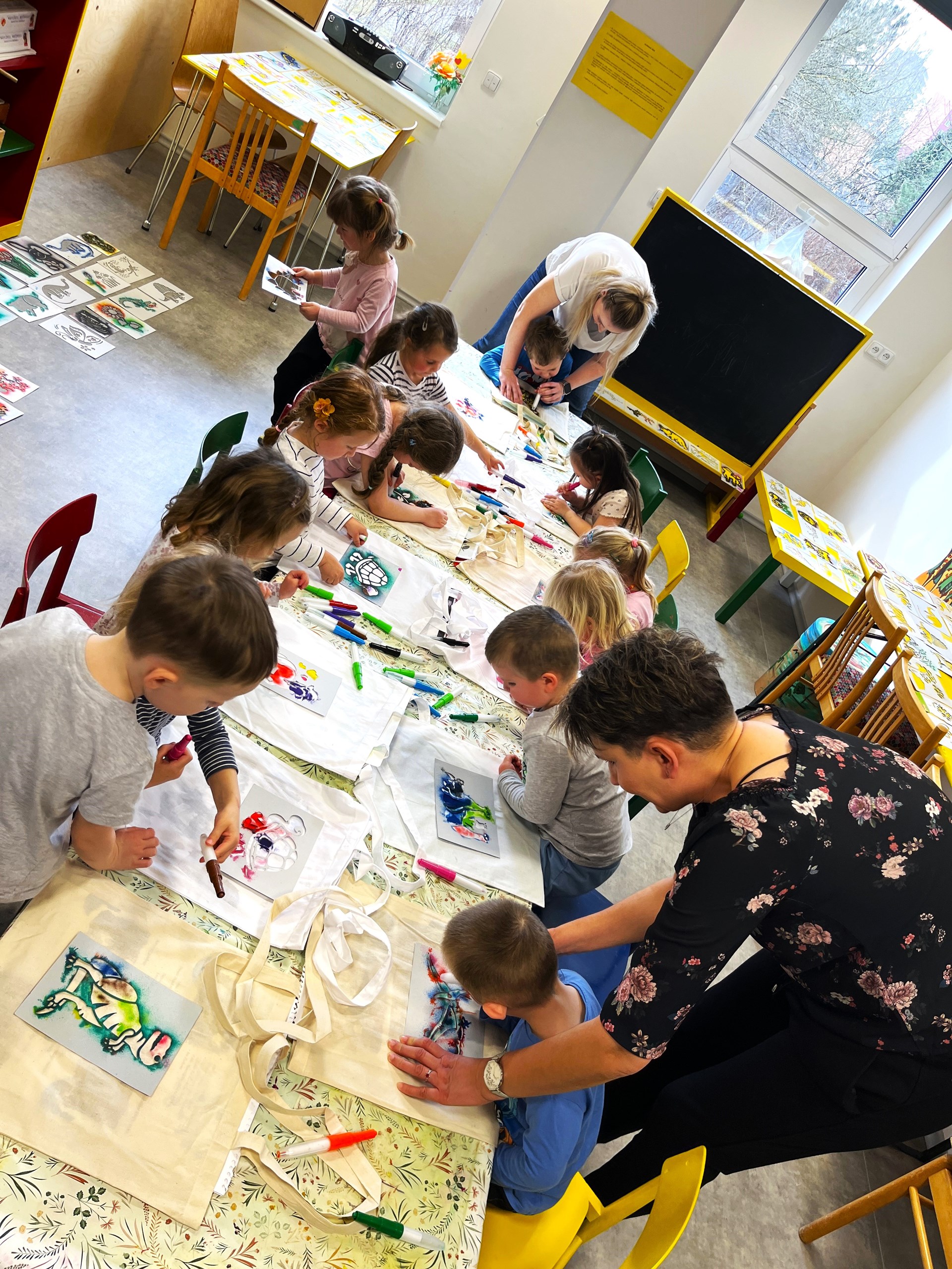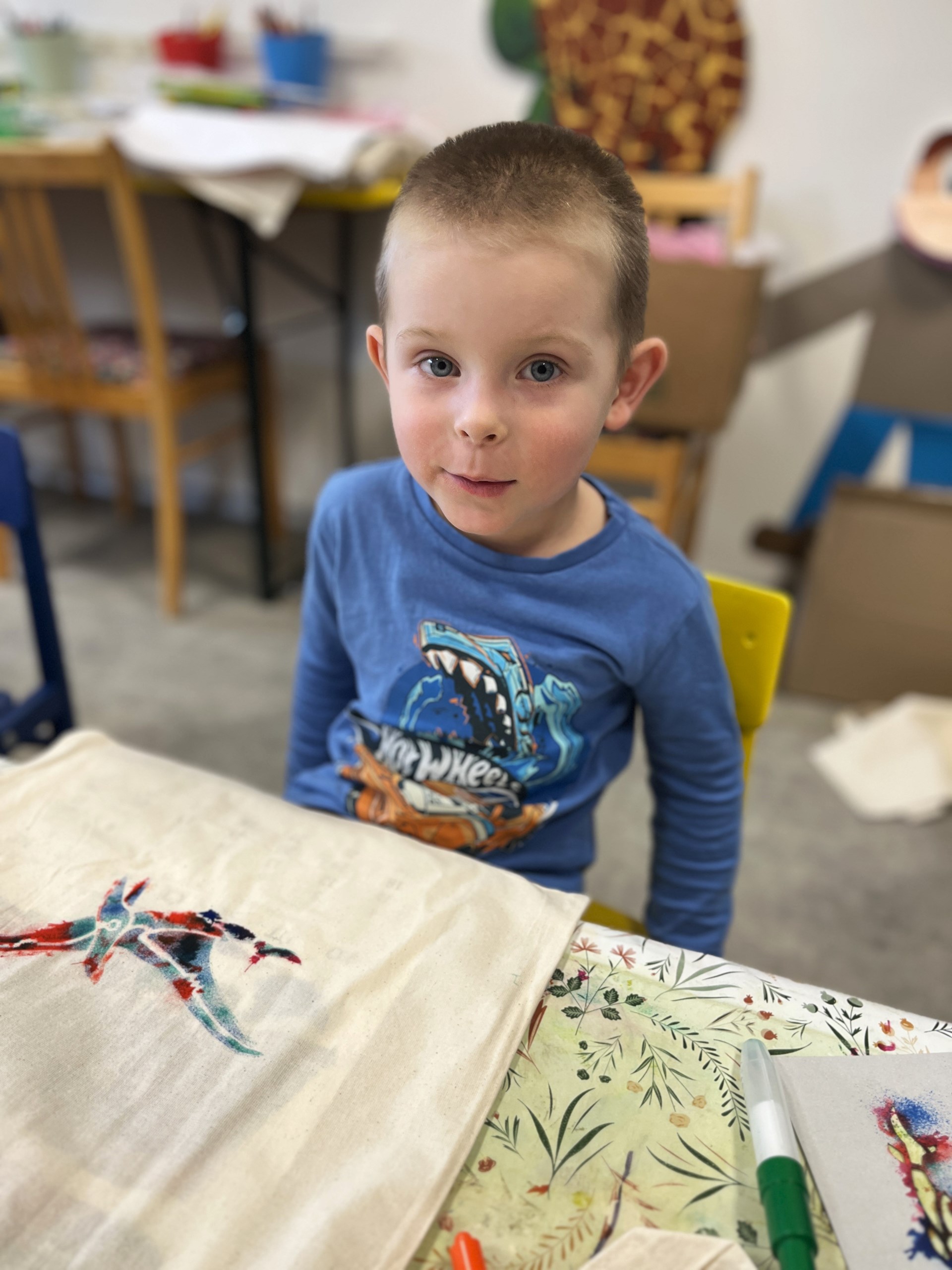 Děti rády malují obrázky. Tentokrát jsme se však rozhodli vytvořit obrázky na taškách pomocí foukacích fixů. Bylo to trošku náročnější, ale nakonec jsme to zvládli.