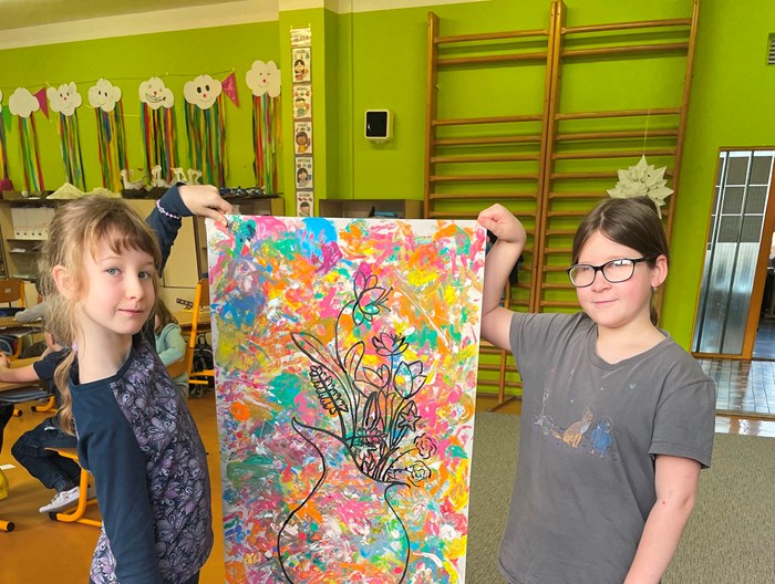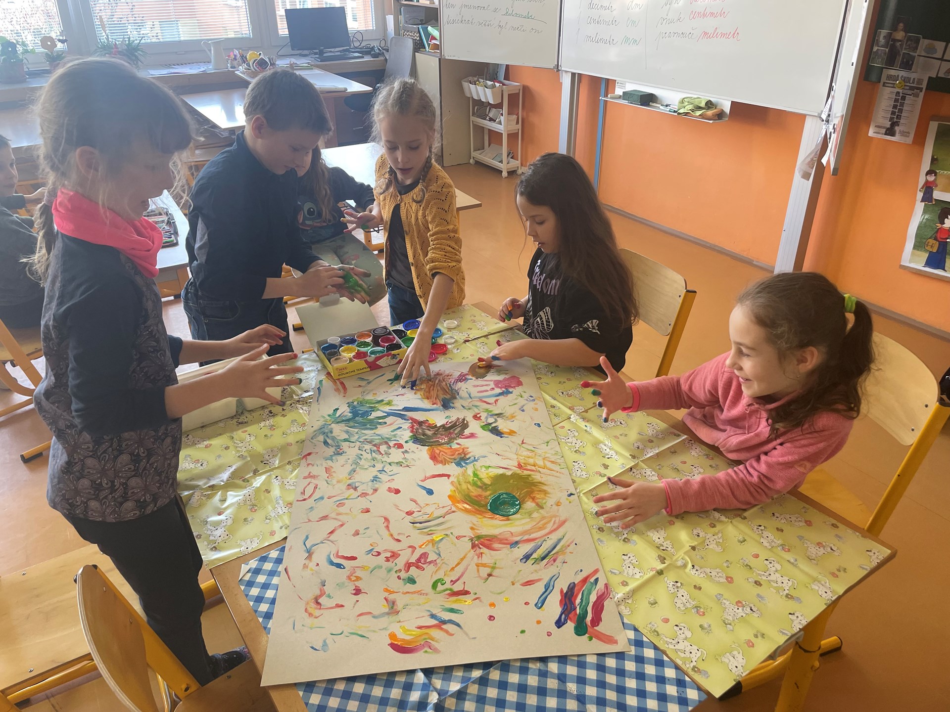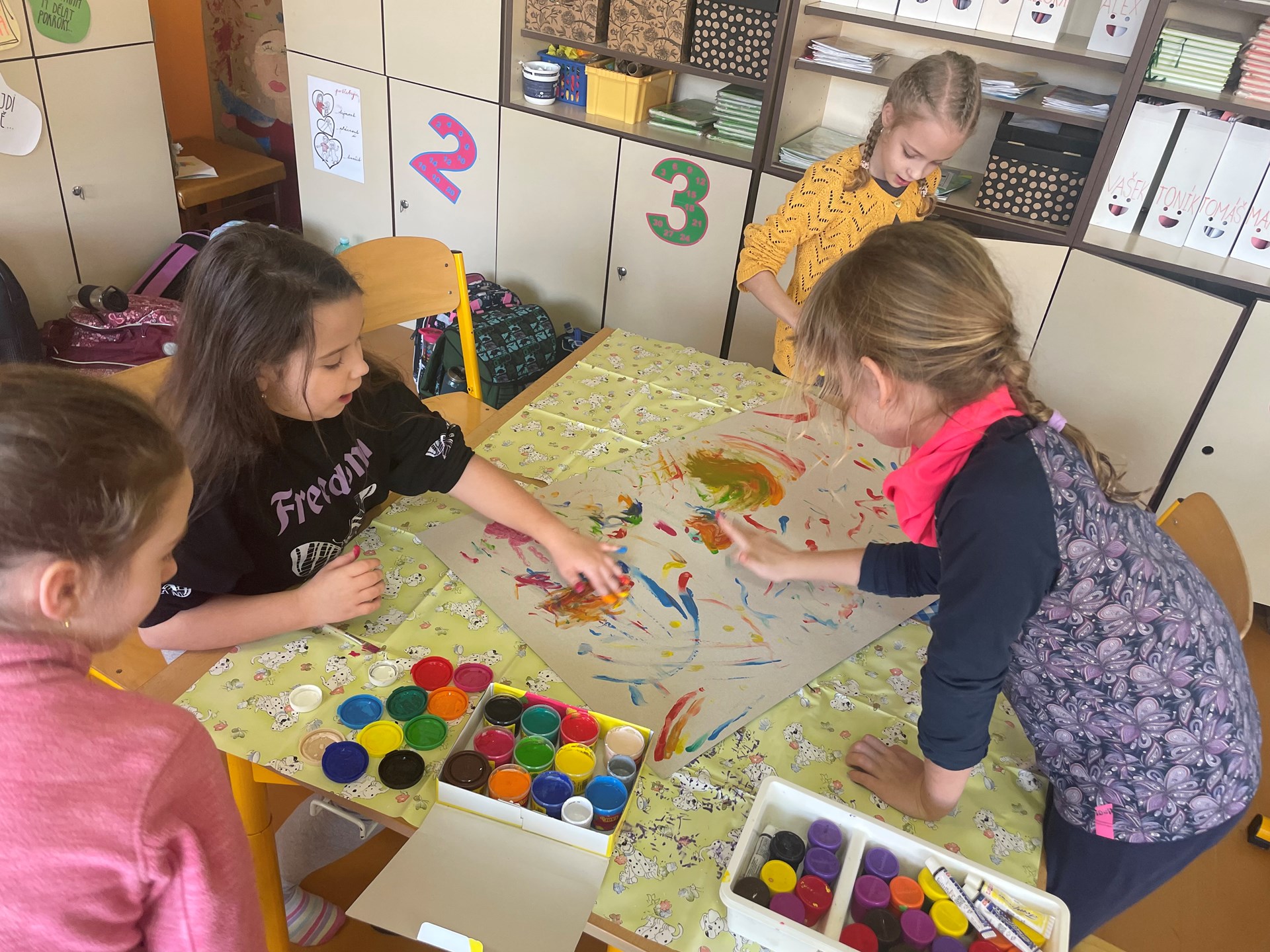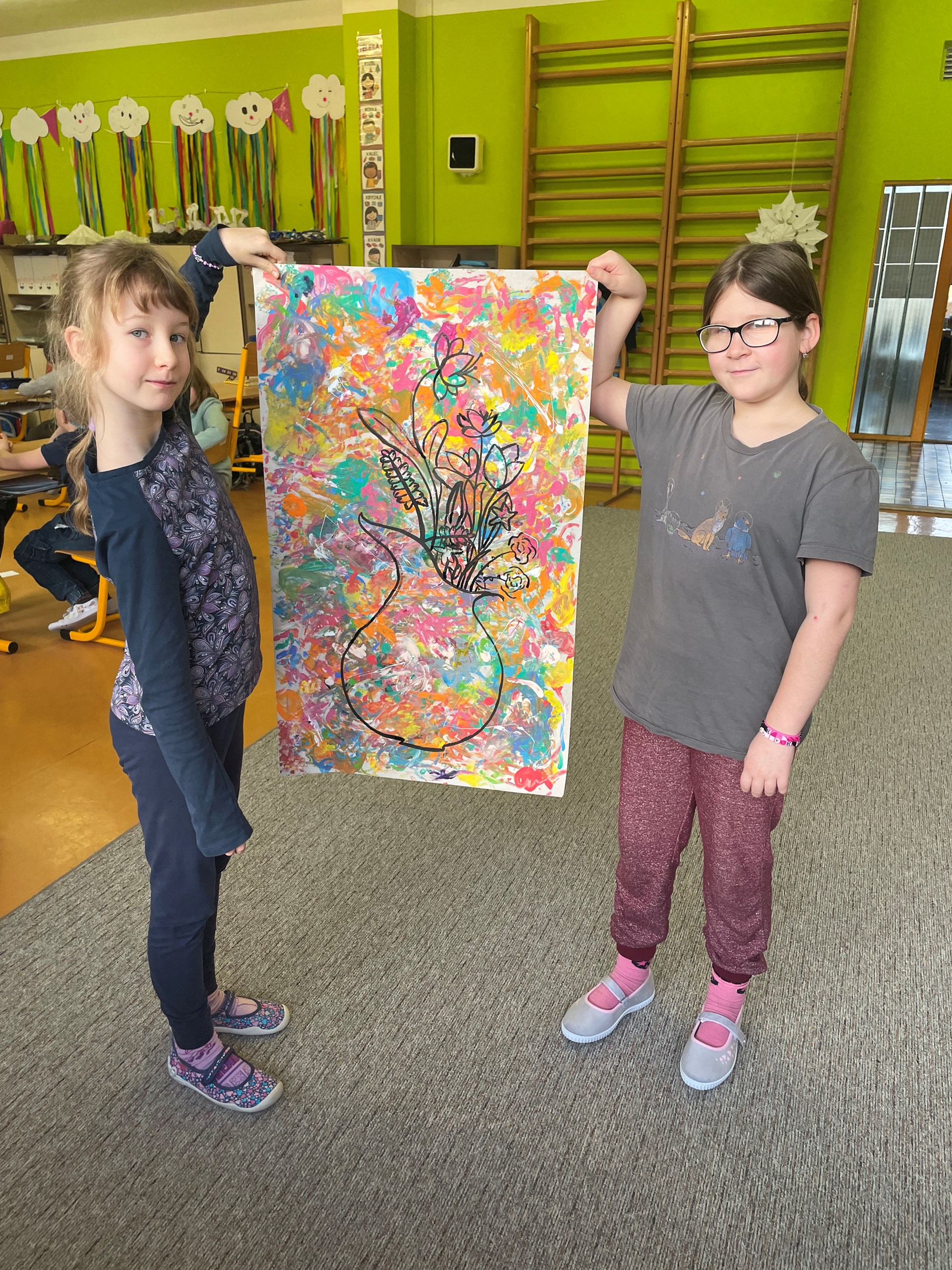 Včera si děti ze 4. oddělení ŠD vyzkoušely abstraktní malbu. Štětce nechaly stranou a s nadšením nanášely barvu prsty. Po zaschnutí podkladu přišel na řadu výtvarný um Barči Svobodové a Anežky Horákové. Dívky domalovaly tuší dle své fantazie vázu s kyticí a umělecké dílo bylo hotovo.