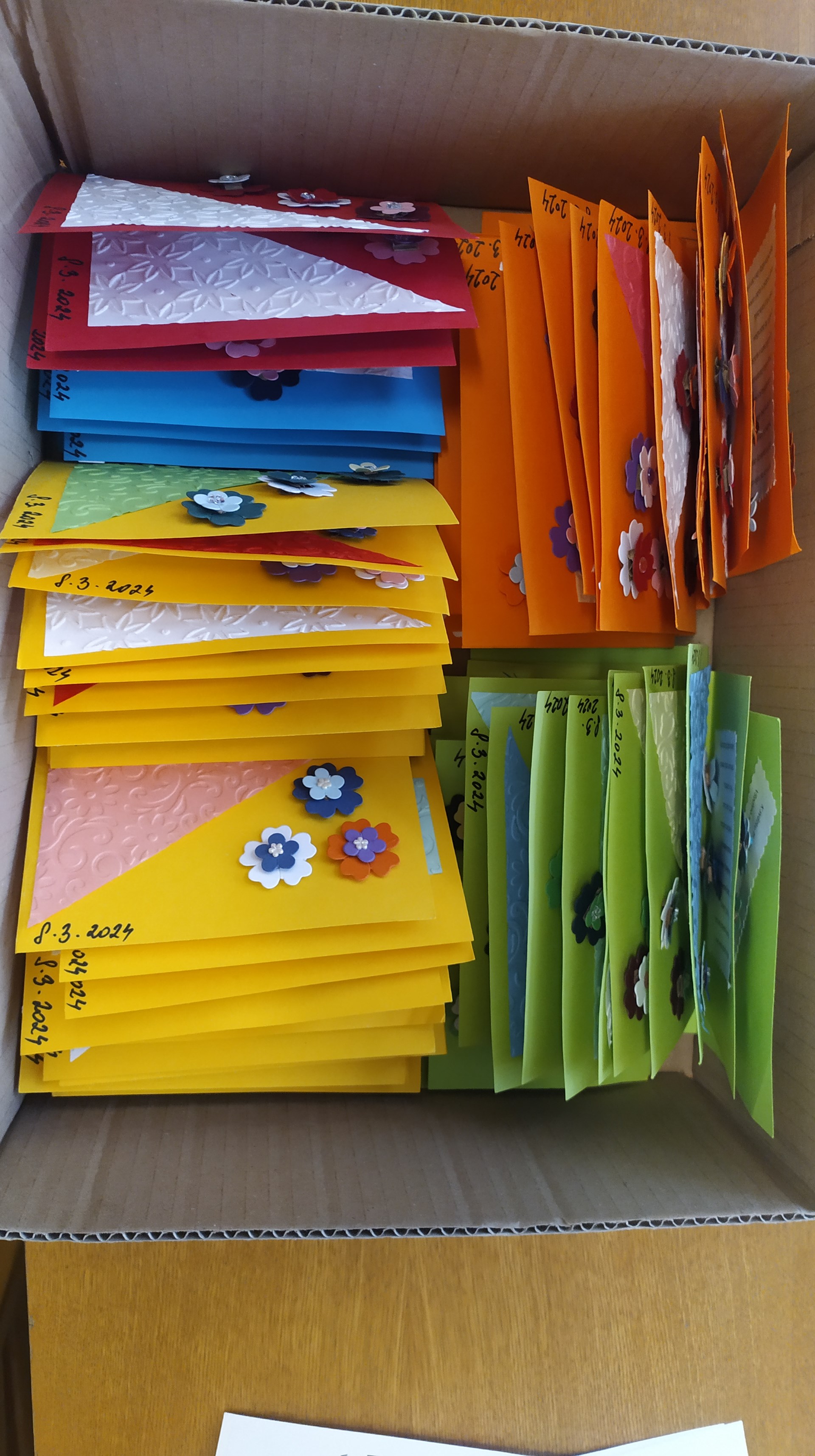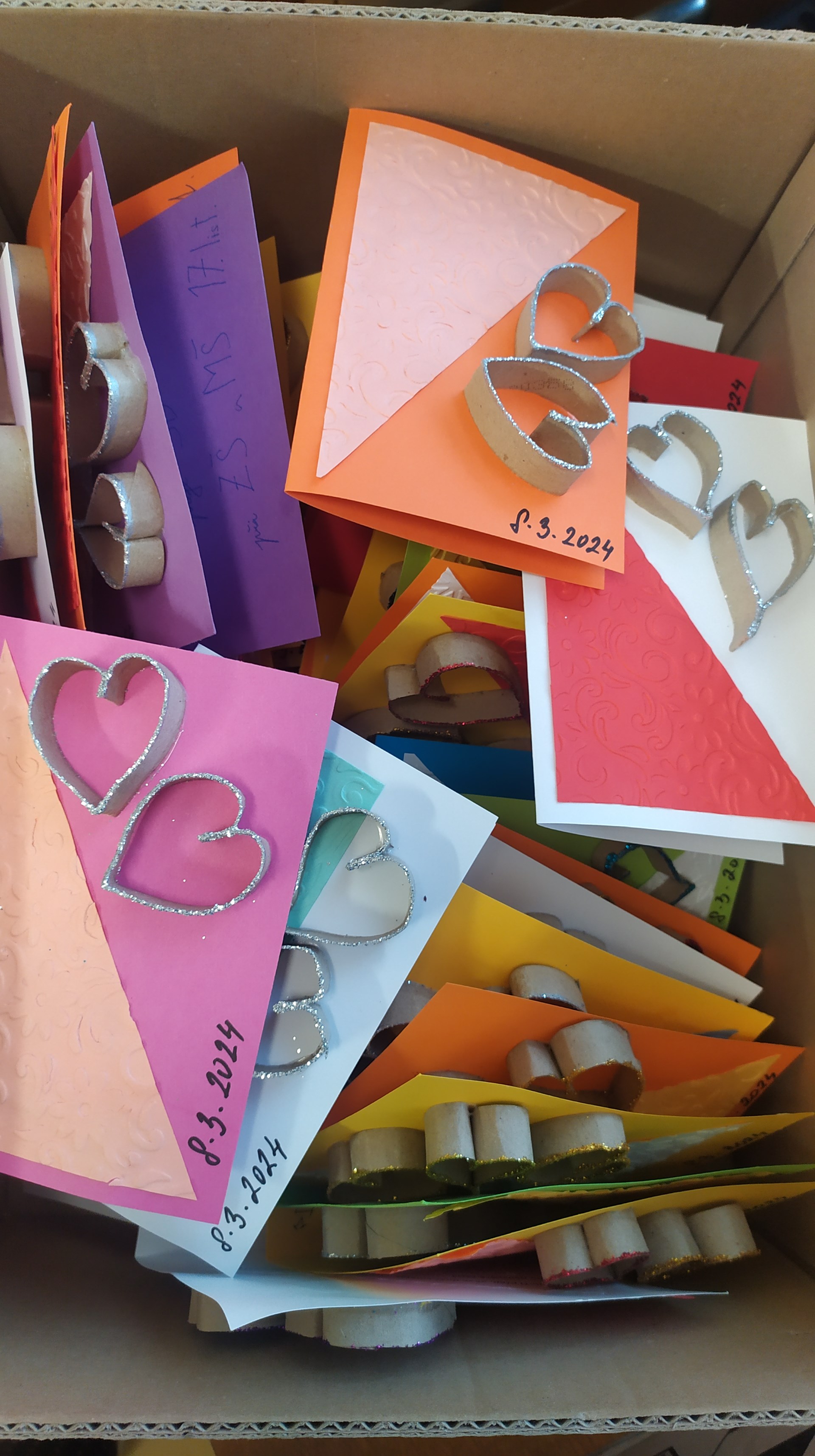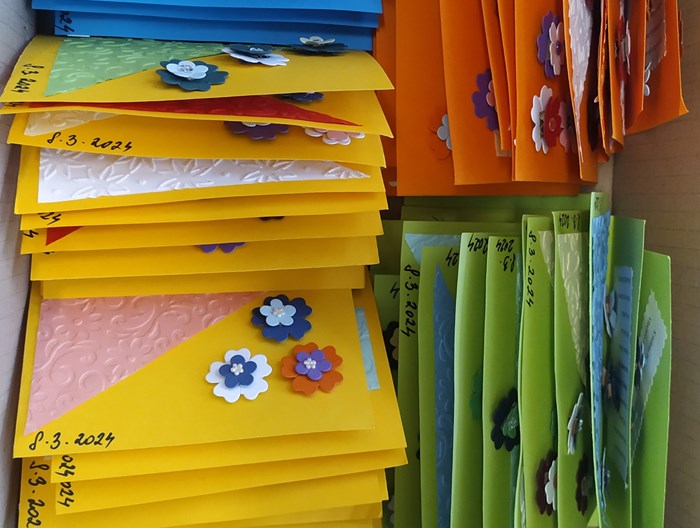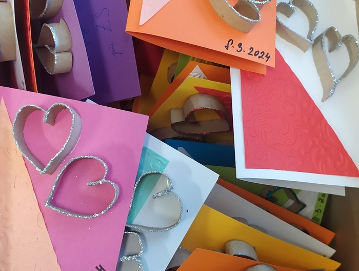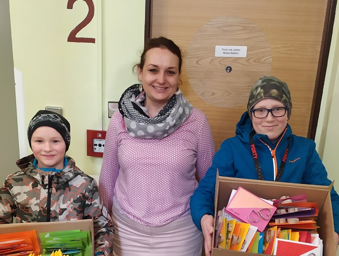 Dnes zástupci kroužku Dobrých skutků Filípek a Alex odevzdali do Domu s pečovatelskou službou na ul. Česká 320 celkem 95 přání k MDŽ. Pozornost byla připravena pro všechny ženy, které na této adrese přebývají. Chtěli jsme tak dát najevo, že v blízkosti naší školy žijí seniorky a my o nich víme. Vyrobili jsme 150 srdíček s třpytivým efektem a 200 plastických dvoupatrových kvítků. Spokojenost a potěšení obdarovaných bude i naší radostí!