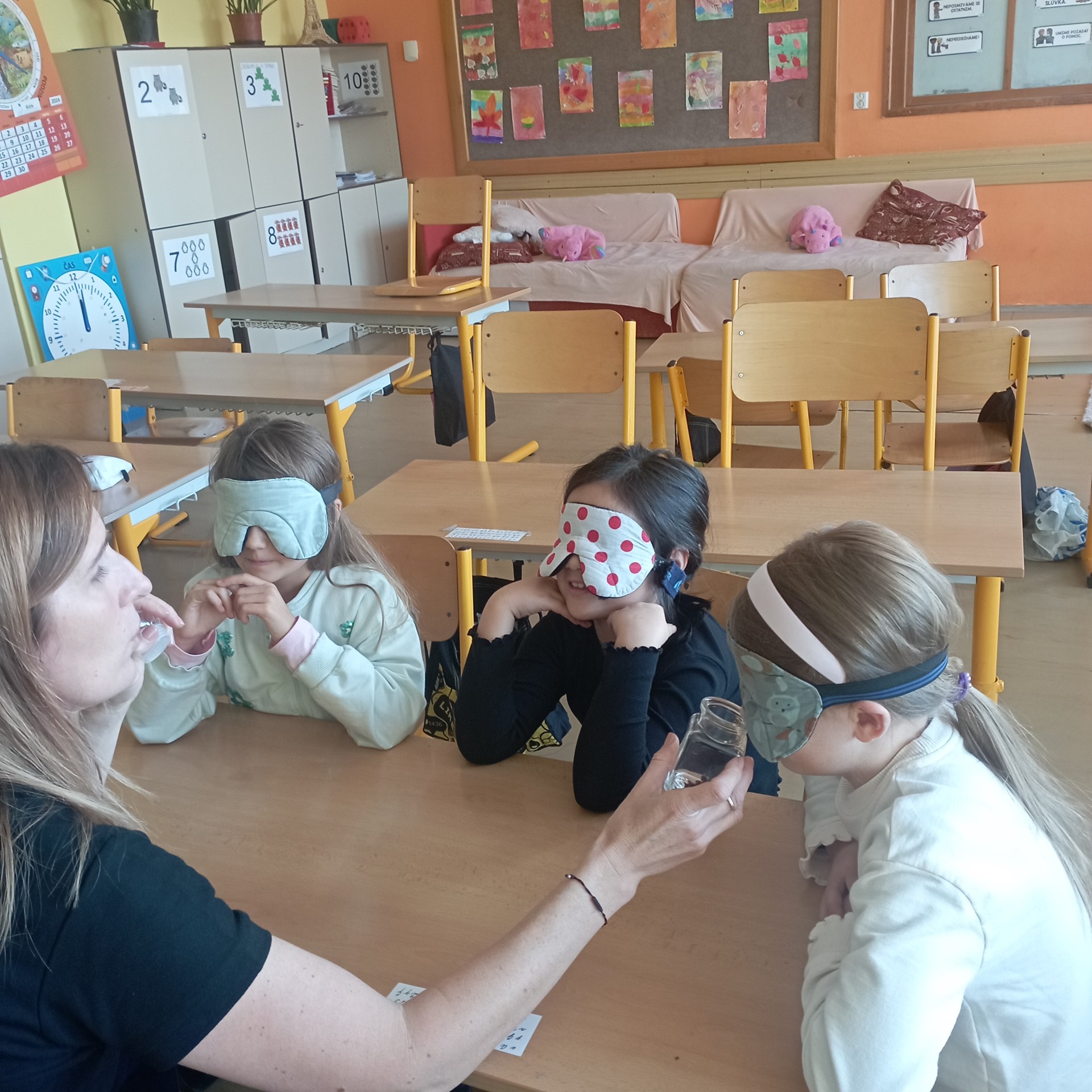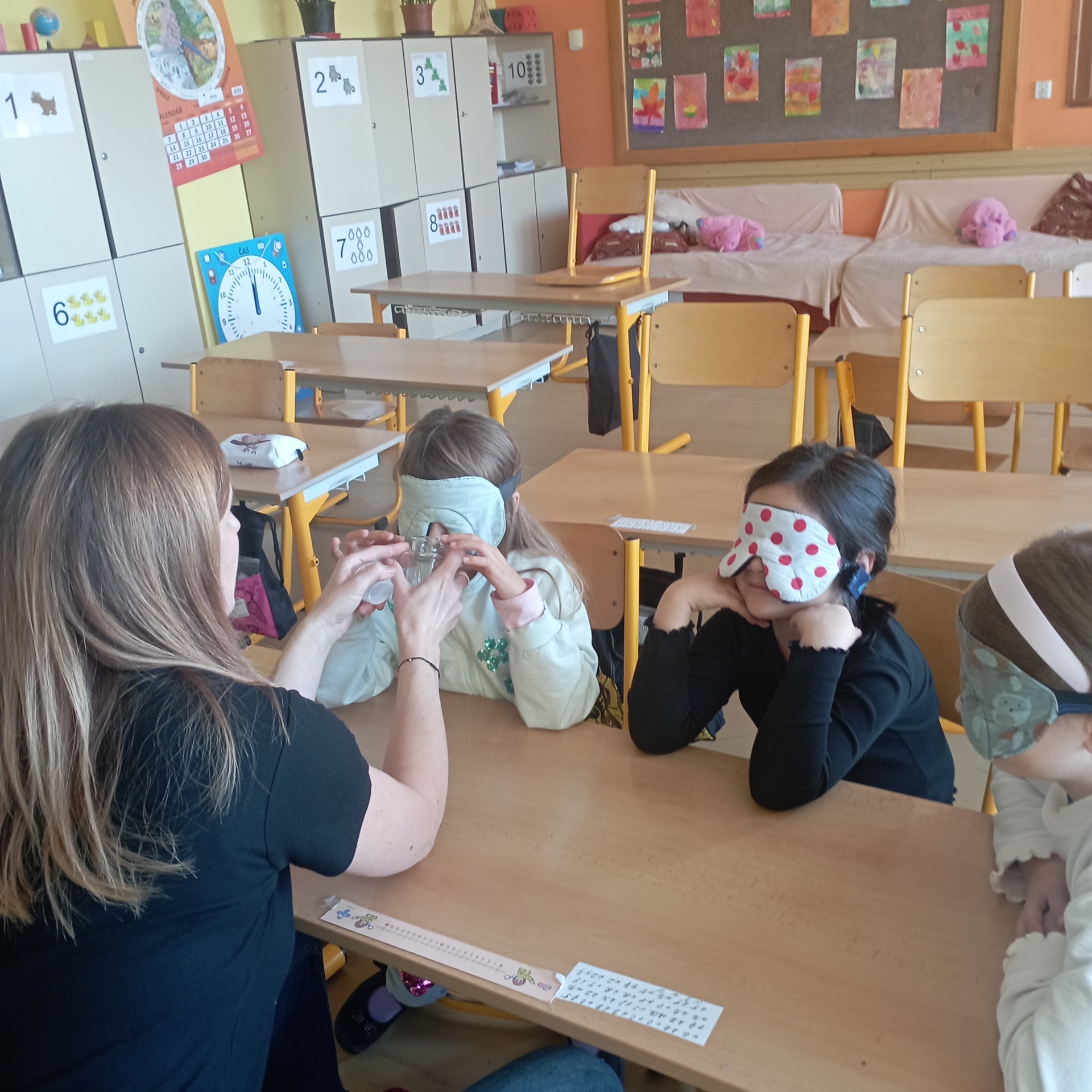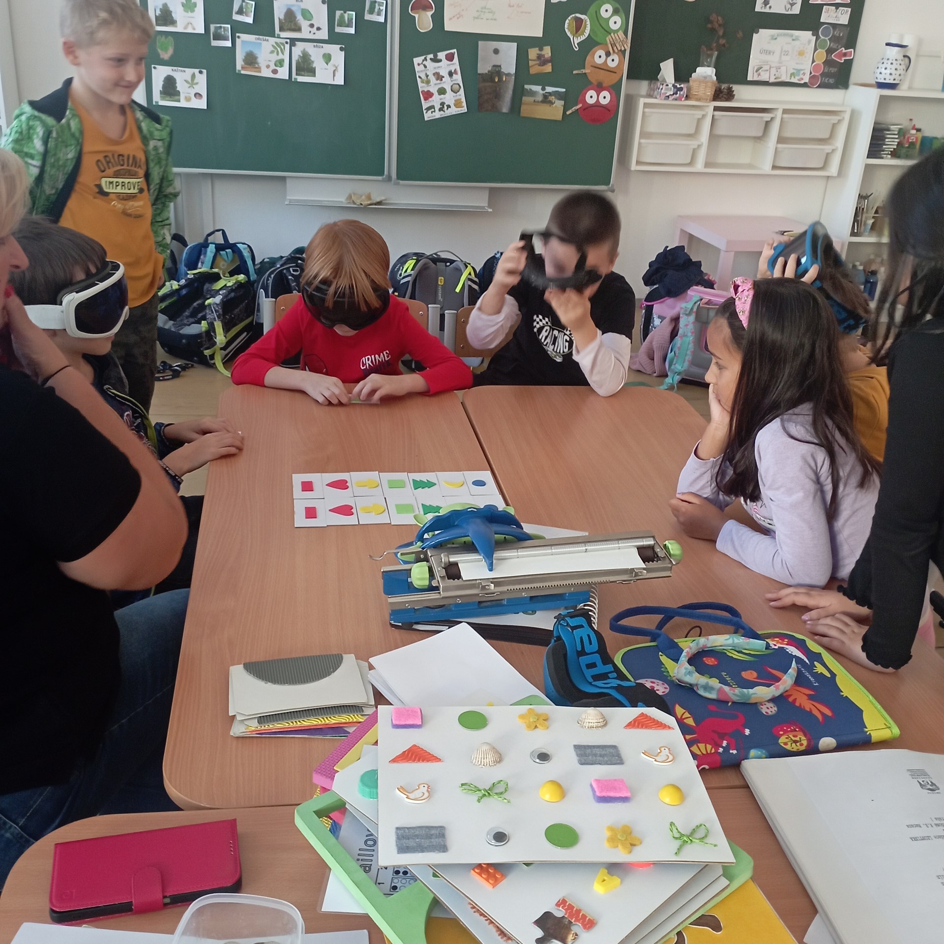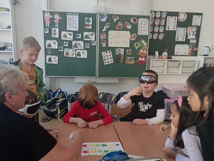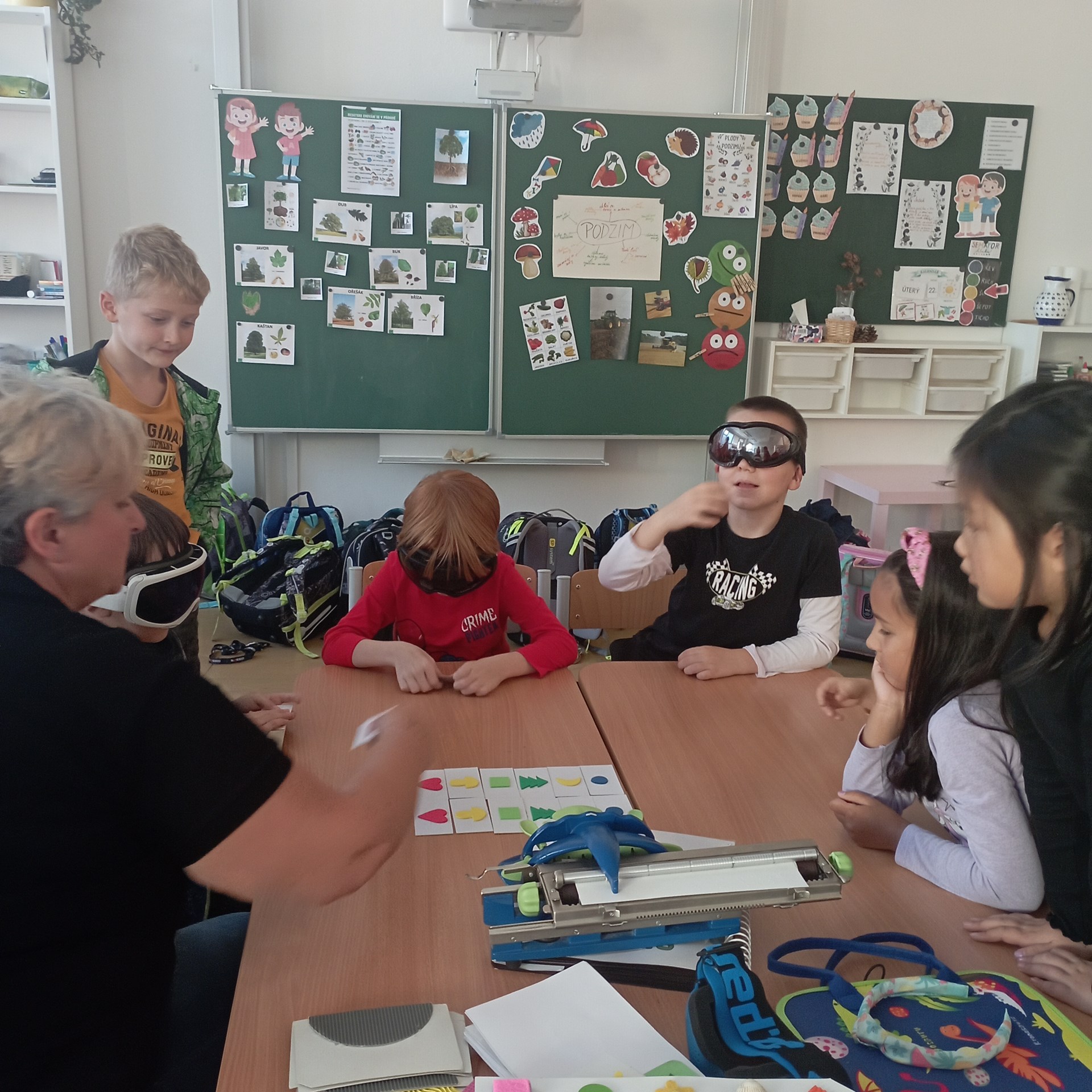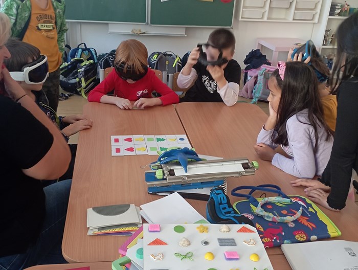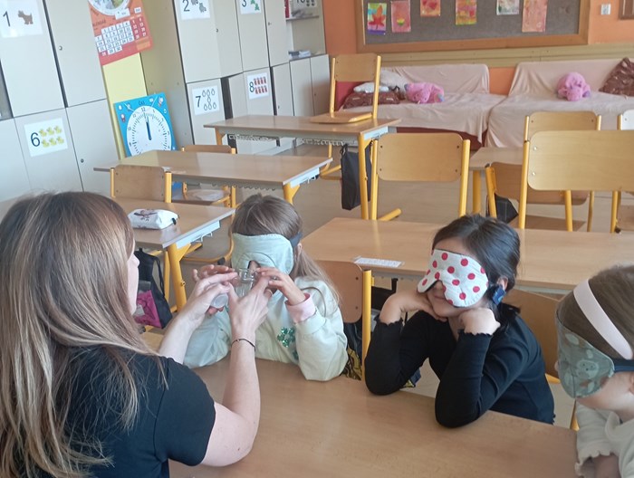 V úterý 22. října k nám do školní družiny přijely paní vychovatelky ze školy pro nevidomé. Děti si společně s nimi mohly vyzkoušet Braillovo písmo. V jiných skupinách rozpoznávaly s klapkami na očích předměty, dvojice dle sluchu, vůně jen podle čichu. Na chodbě děti zkoušely chodit se zavázanýma očima podle hmatu u stěny a se slepeckou holí. Důležité bylo uvědomění, že na světě existují i lidé s postižením a je třeba k nim přistupovat s ohleduplností a respektem.