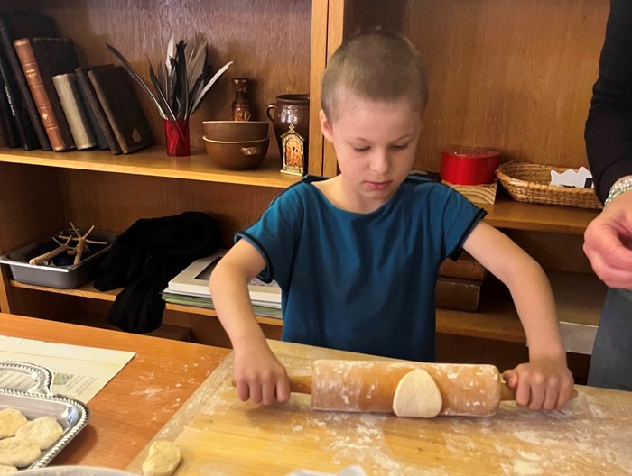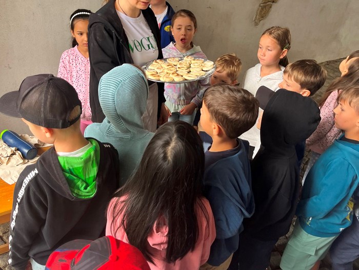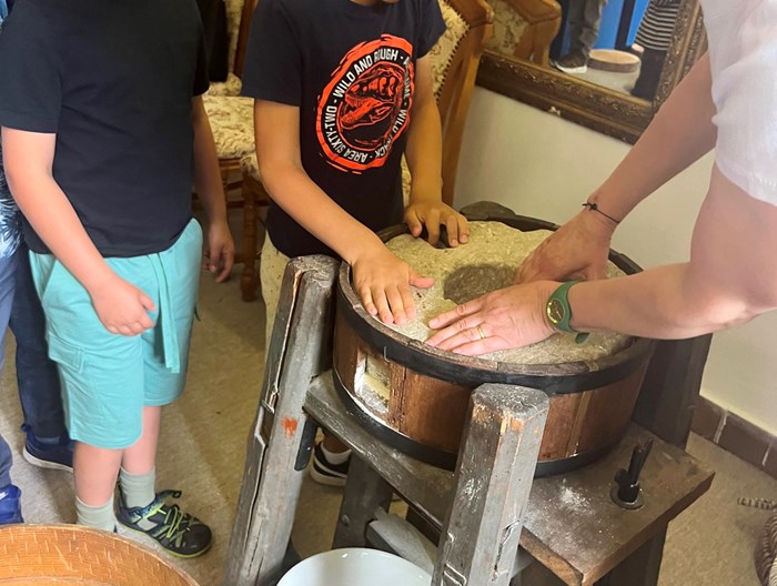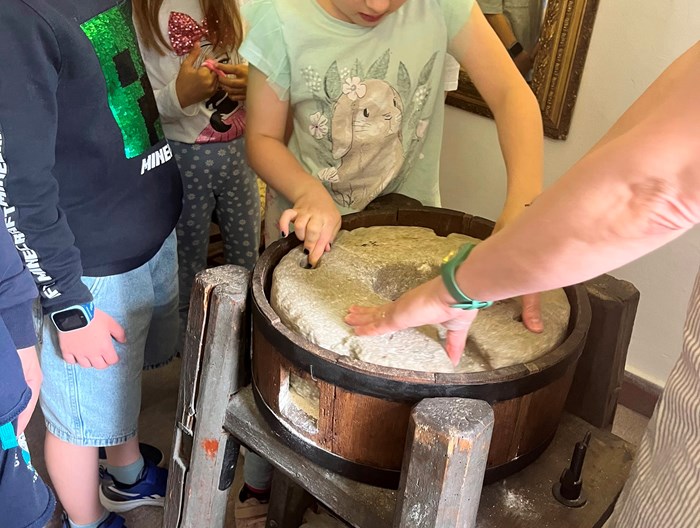 Také si sami zkusili mlít mouku a uválet z těsta chlebovou placku. Tu dětem nakonec venku upekl personál muzea a každý prvňáček si tak mohl sníst to, co si sám nachystal. Stejně tak měl každý možnost ochutnat zdravý žitný chléb.