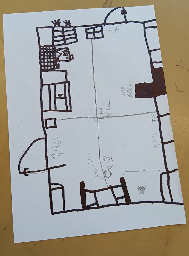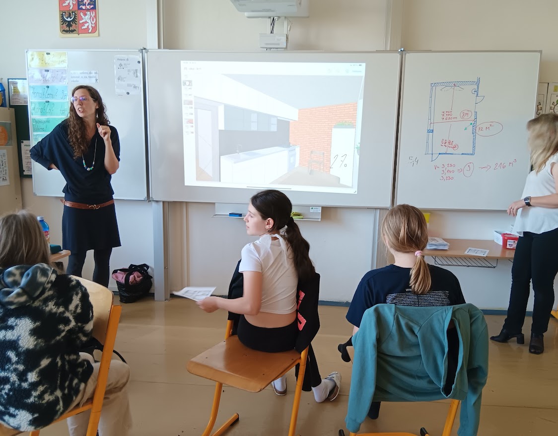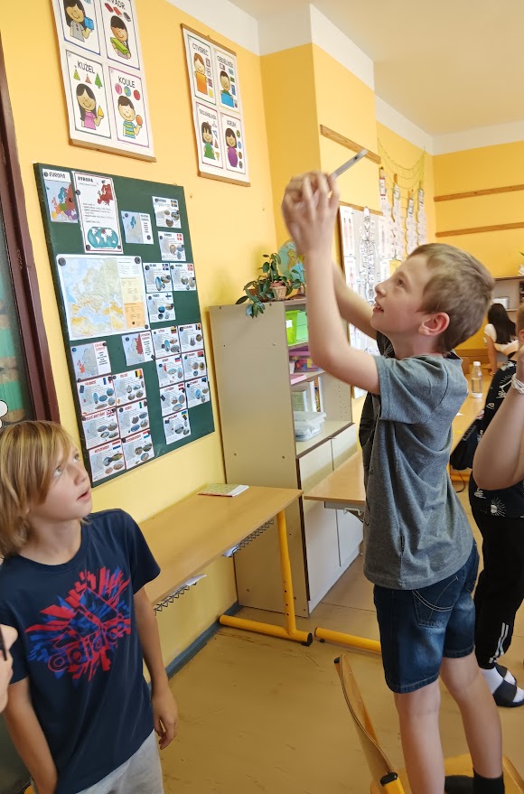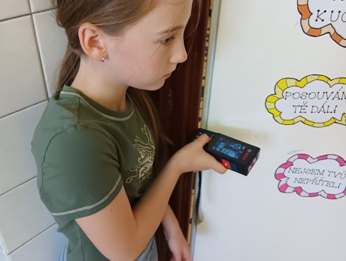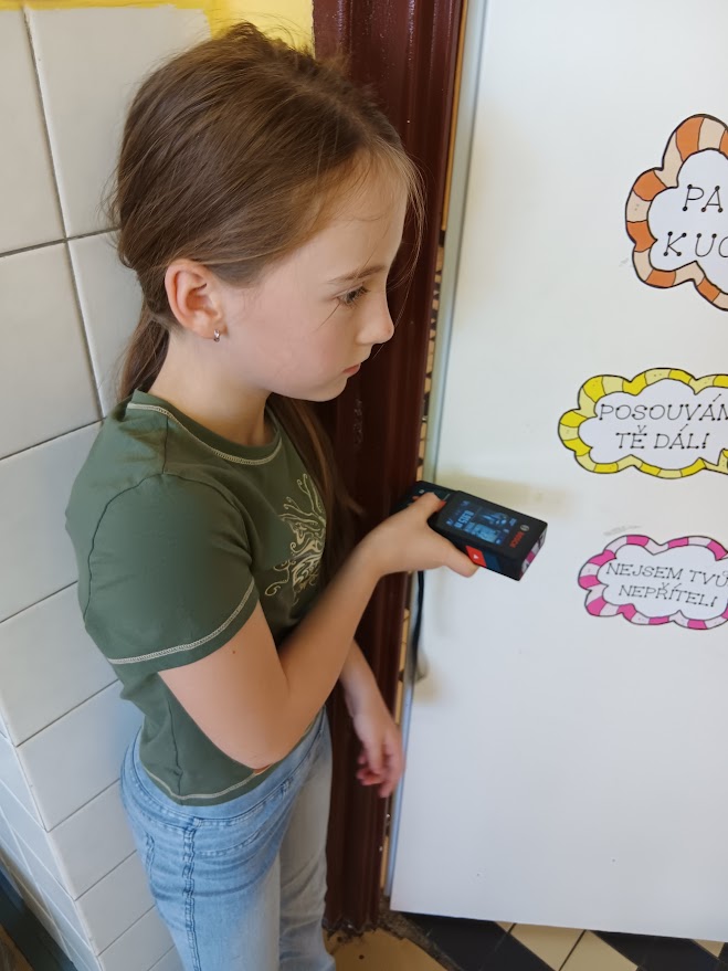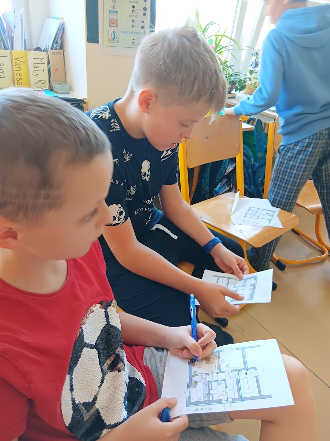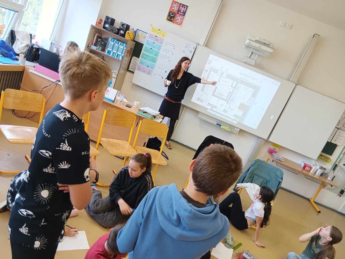 Žáci se učili zaměřovat svou třídu pomocí aplikace Měření ve svých mobilech, pracovali i se speciálním měřidlem, který jim zapůjčily paní architektky, orientovali se v plánech a zakreslovali do nich kóty. Program byl plný matematiky a prostorové geometrie.