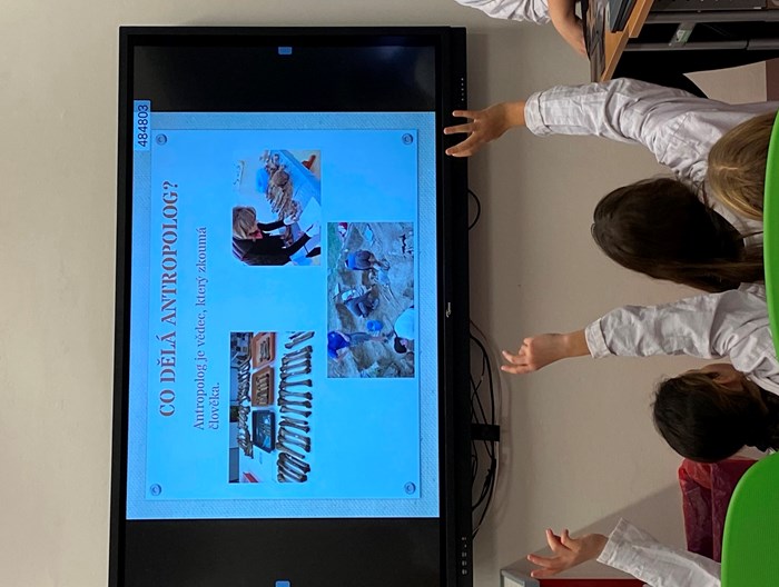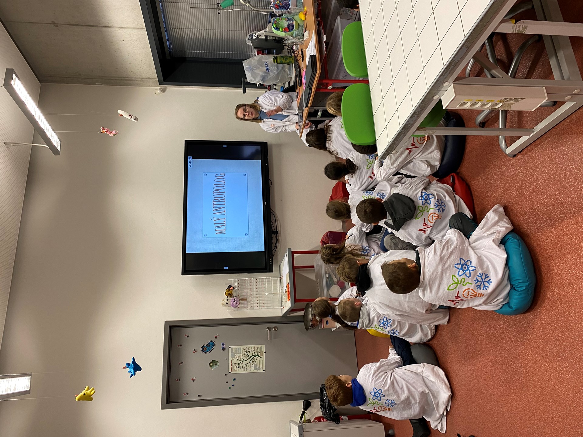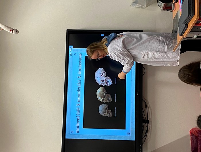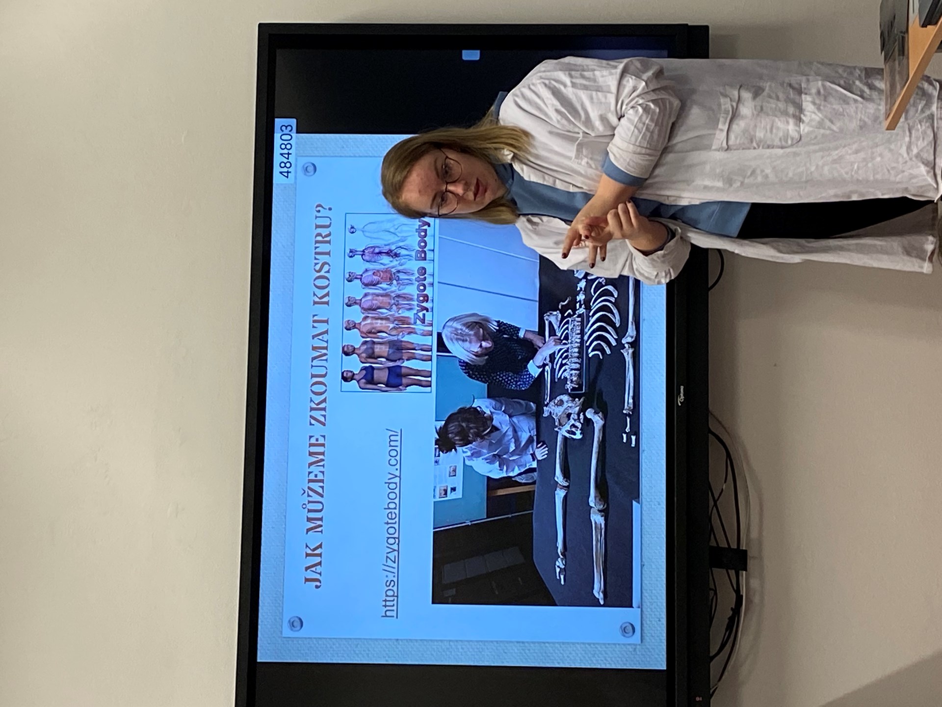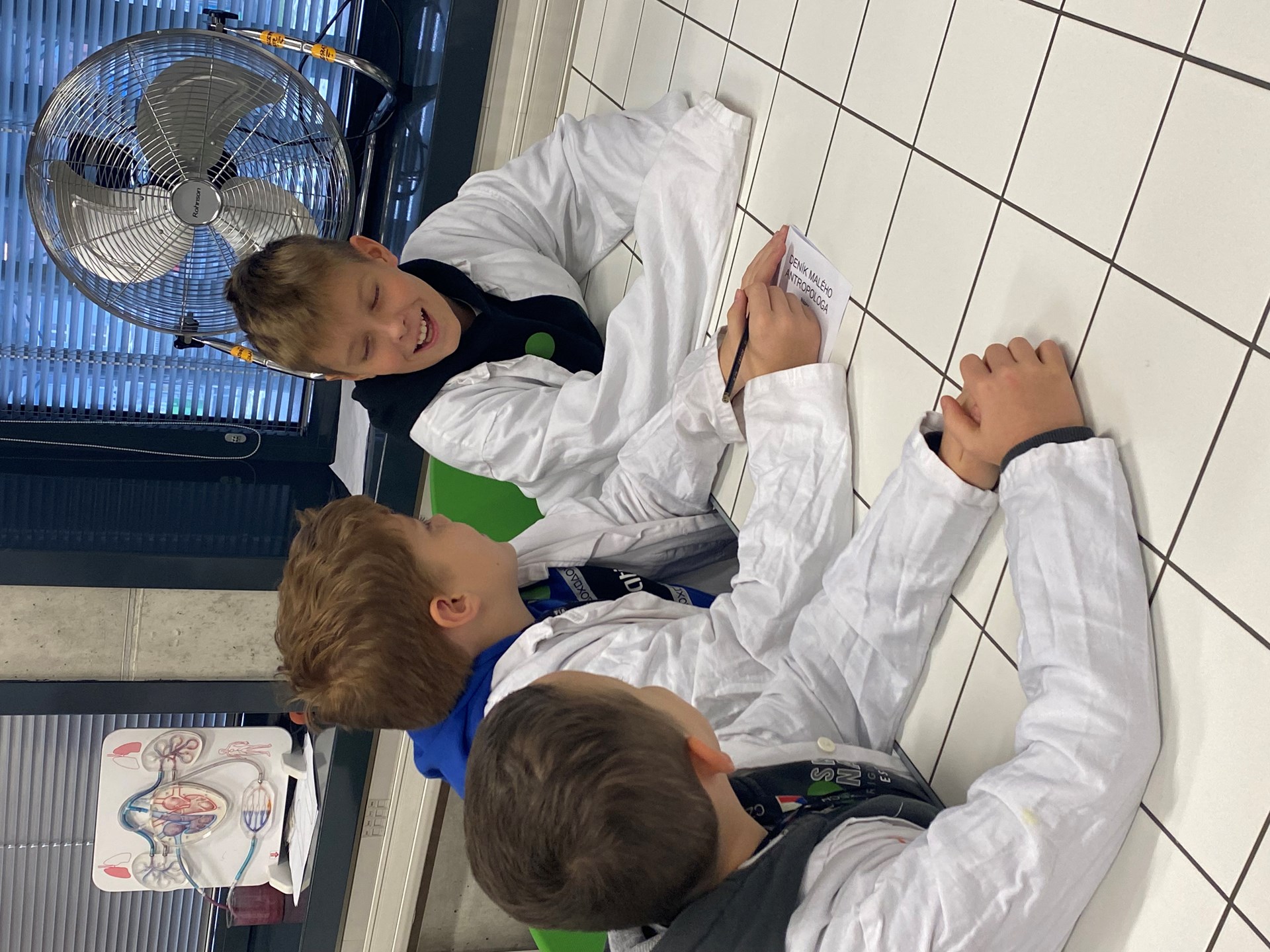 Tématem dnešního objevování bylo lidské tělo. Kluci a holky naší třídy se na hodinu a půl proměnili v malé antropology. Oblékli si bílé pláště a v laboratoři pod vedením lektorky Alžběty Perischové sestavovali