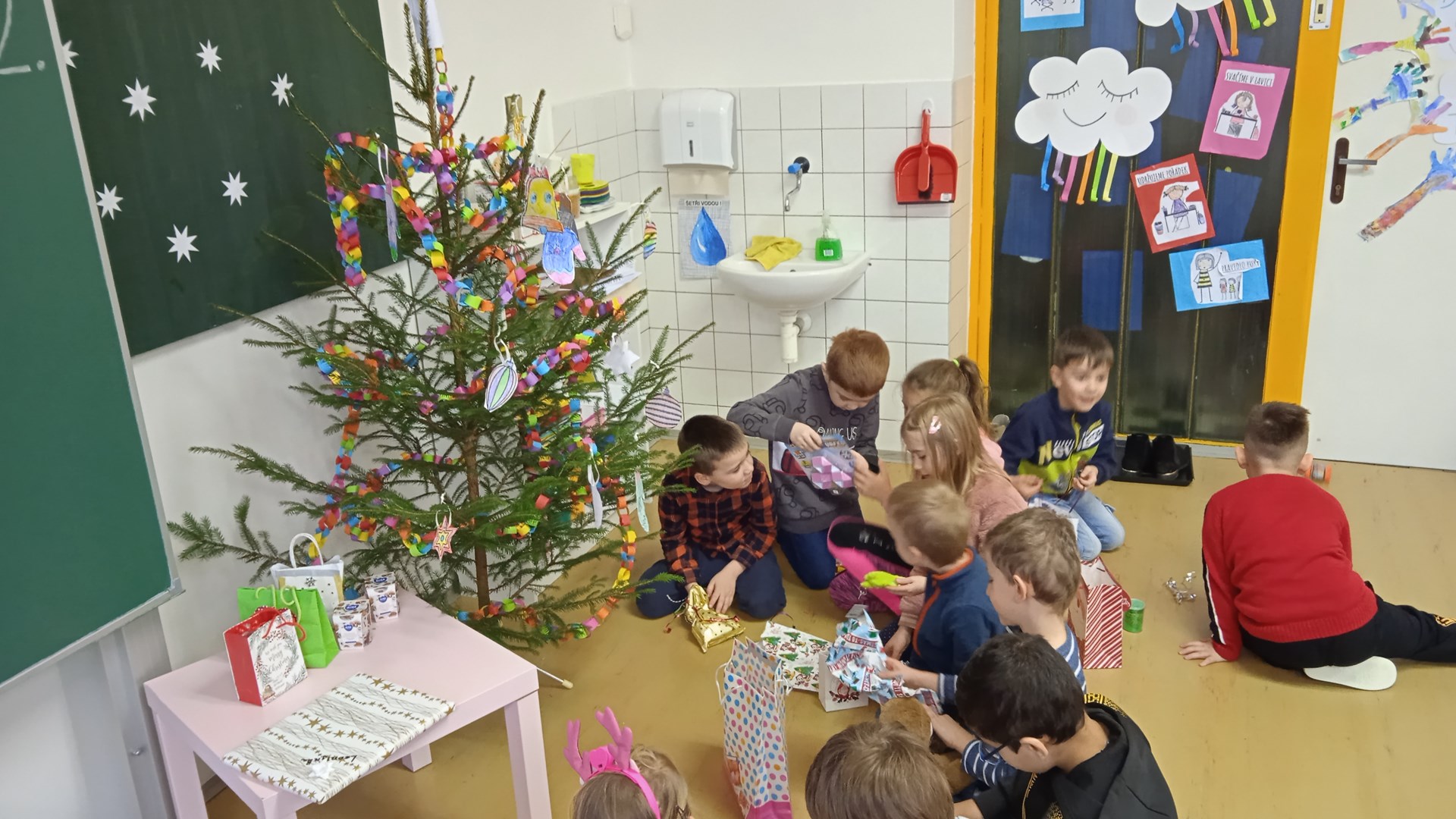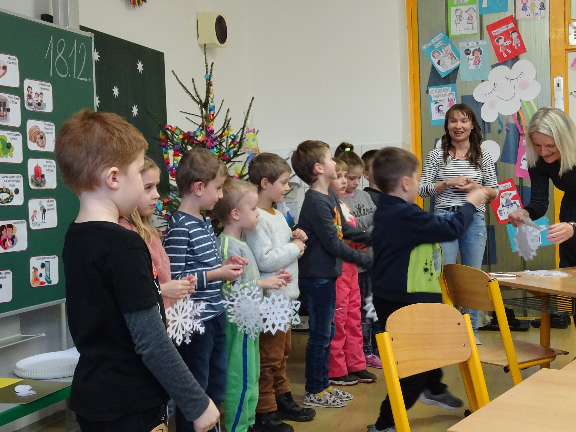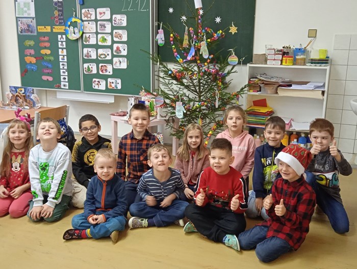 Prosinec v přípravné třídě byl opravdu pestrý. Na začátku měsíce nás navštívil Mikuláš se svou družinou, společně jsme si zazpívali několik písní a děti byly obdarovány drobnou sladkostí. Čert si naštěstí nikoho neodnesl, všechny děti slíbily, že se polepší. Čekání na Ježíška jsme si zkrátili návštěvou kina, kde jsme prožili úžasné dobrodružství s Tlapkovou patrolou. V kulturním domě jsme si zase vyslechli koncert nádherných vánočních písní v provedení sborů kopřivnických základních škol a díky tomu jsme domů odcházeli se sváteční náladou. Poslední prosincový týden nás v odpoledních hodinách navštívili rodiče a společně s dětmi si vytvořili krásný betlém. Děti měly pro maminky a tatínky připraveno drobné překvapení v podobě přednesu písní Vánoce přicházejí a Vánoce na míru. Nálada byla skvělá a loučili jsme se neradi. Poslední školní den před Vánoci se třídou rozezněly koledy, linula se vůně vánočního cukroví a živého nazdobeného stromečku. Kamarádi si navzájem předali dárky a radost byla slyšet snad až na chodbu.