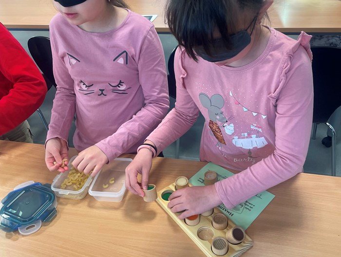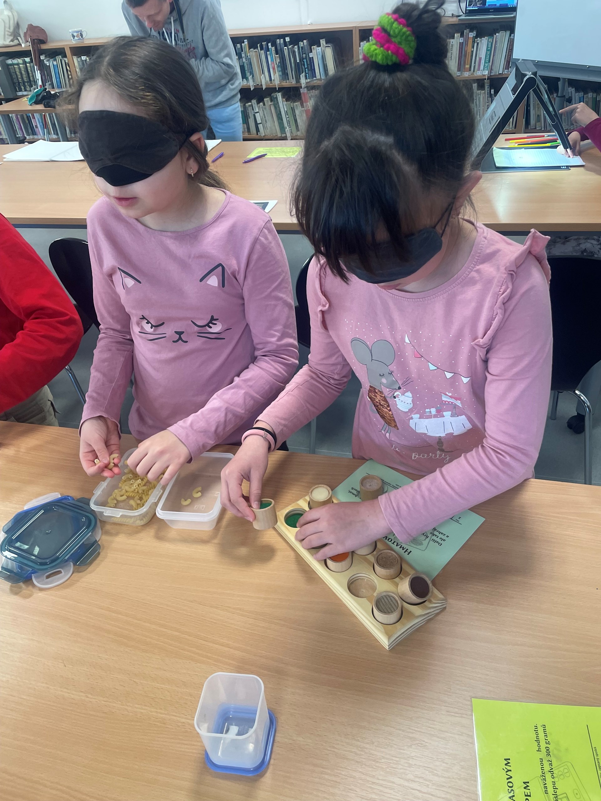 Ve druhé půlce si děti vyzkoušely, jak to funguje v praxi. Se škraboškou na očích poznávaly 3D obrázky, hmatové pexeso, navlékaly a zavazovaly tkaničku, psaly na stroji pro nevidomé.