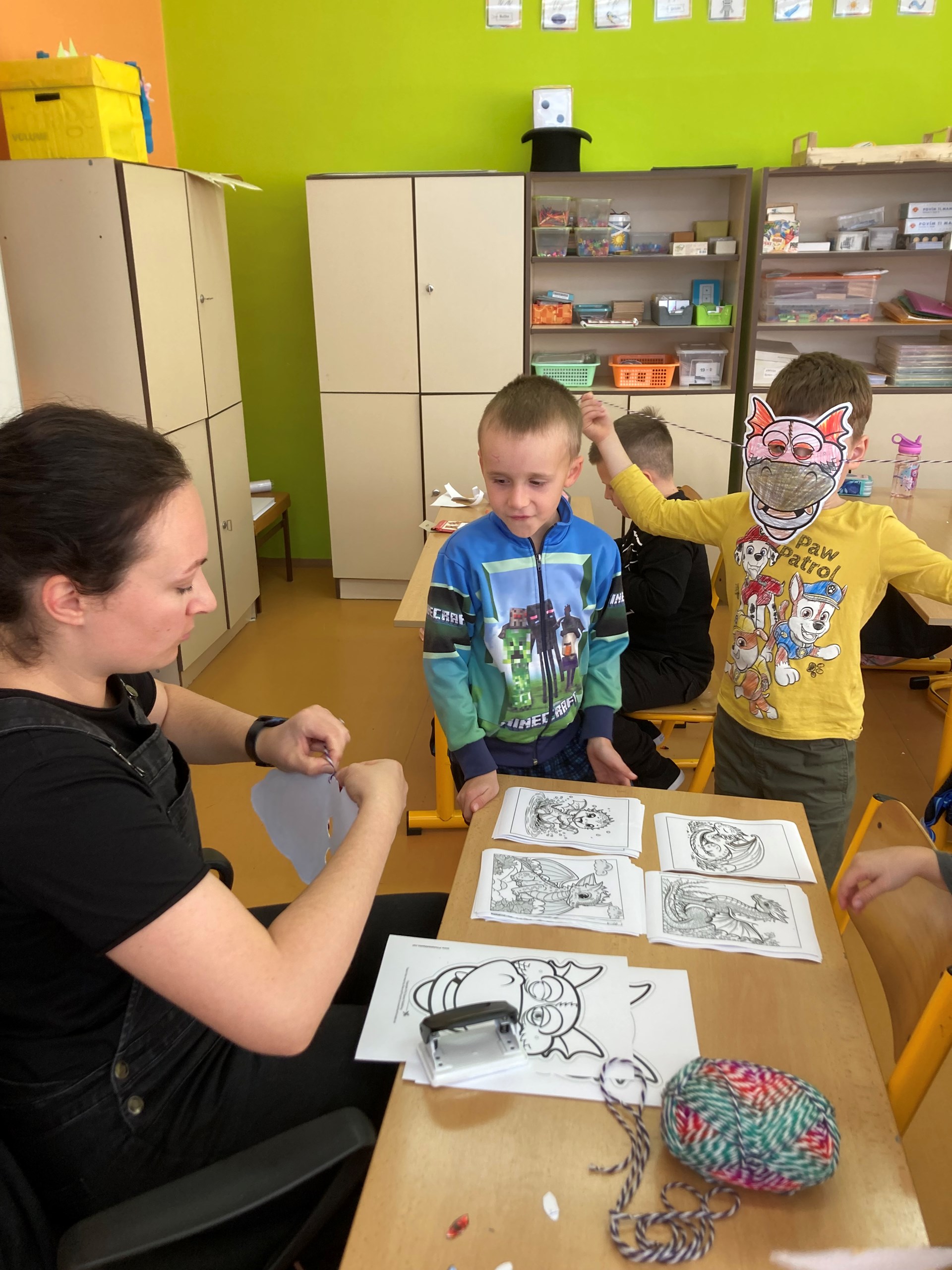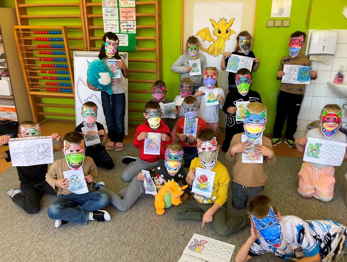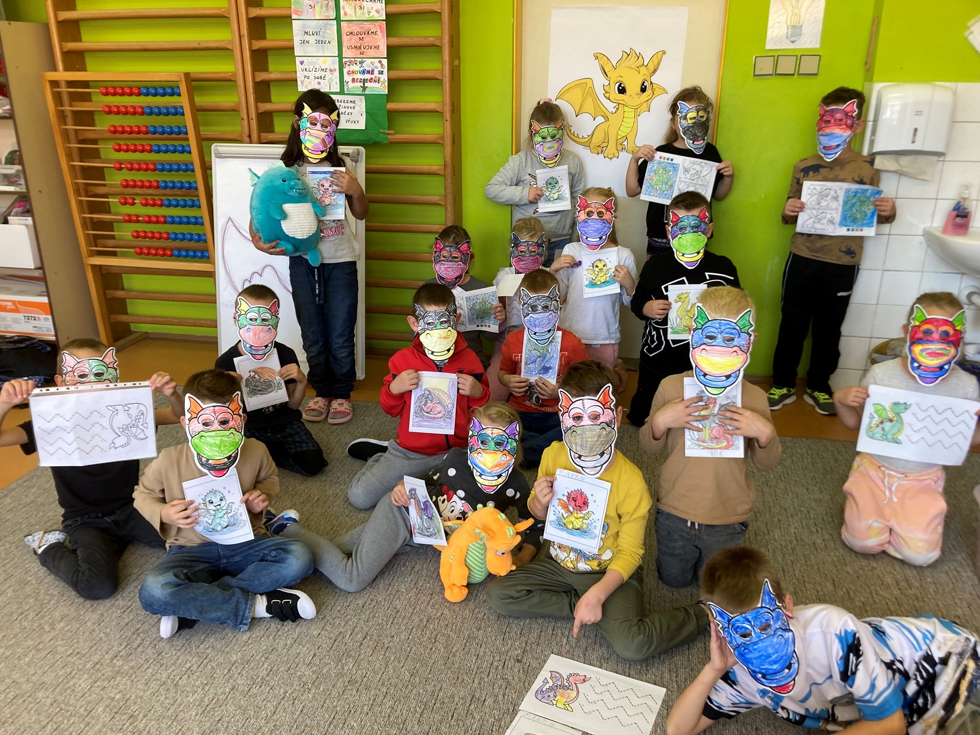 Ve čtvrtek 17. října se to v 1. C hemžilo samými draky. Ptáte se proč? Prvňáčkům se totiž podařilo dosáhnout prvního velkého úkolu v celoroční hře VELKÉ DRAČÍ PUTOVÁNÍ a za odměnu si vysloužili první DRAČÍ DEN. A tak jsme od rána pracovali ve skupinách, ve kterých jsme počítali a porovnávali draky, tvořili dračí věty a vymýšleli drakům legrační jména, trénovali ruku na dračích grafomotorických cvicích, obtahovali obří dračí jednotažku nebo vymalovávali dračí omalovánky. S mírnou dopomocí paní asistentky si každý vyrobil svou dračí masku. Přečetli jsme si pohádku o tom, jak se rodí draci a dozvěděli se, že barvu draka ovlivní to, jak blízko ohně se vylíhne. Teď už také víme, proč má náš zlatý školní drak Drápek jeden zelený dráp a jsme zvědaví na to, co všechno se naučí a dokáže. Bylo toho zkrátka moc, a i když se dětem zdálo, že se vůbec neučí, udělali jsme ohromný kus práce. Všechny nás to velmi bavilo a už teď se těšíme na další dračí den.