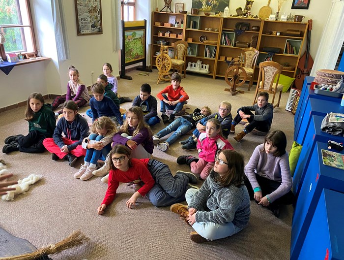 V listopadu se žáci 3.A a 4.A vypravili do muzea Žerotínského zámku za starými tradicemi. Tématem bylo, co dělali naši předkové – především ženy a dívky za dlouhých zimních večerů – draní peří či předení. Děti se zapojily, objevovaly dlouhou a pracnou cestu, která vedla od lnu ke košilím, sukním a šátkům. Každý si mohl vyzkoušet předení na kolovratu. Děti si také zazpívaly písně, které se u předení zpívávaly, a nakonec si namalovaly modrý kvíteček lnu na svůj vlastní lněný pytlíček na bylinky. Před programem si třeťáci dlouhou chvíli zkrátili procvičováním vyjmenovaných slov výukou venku, čtvrťáci si zase zažili slovní úlohy v praxi naživo v areálu zahrady Žerotínského zámku.