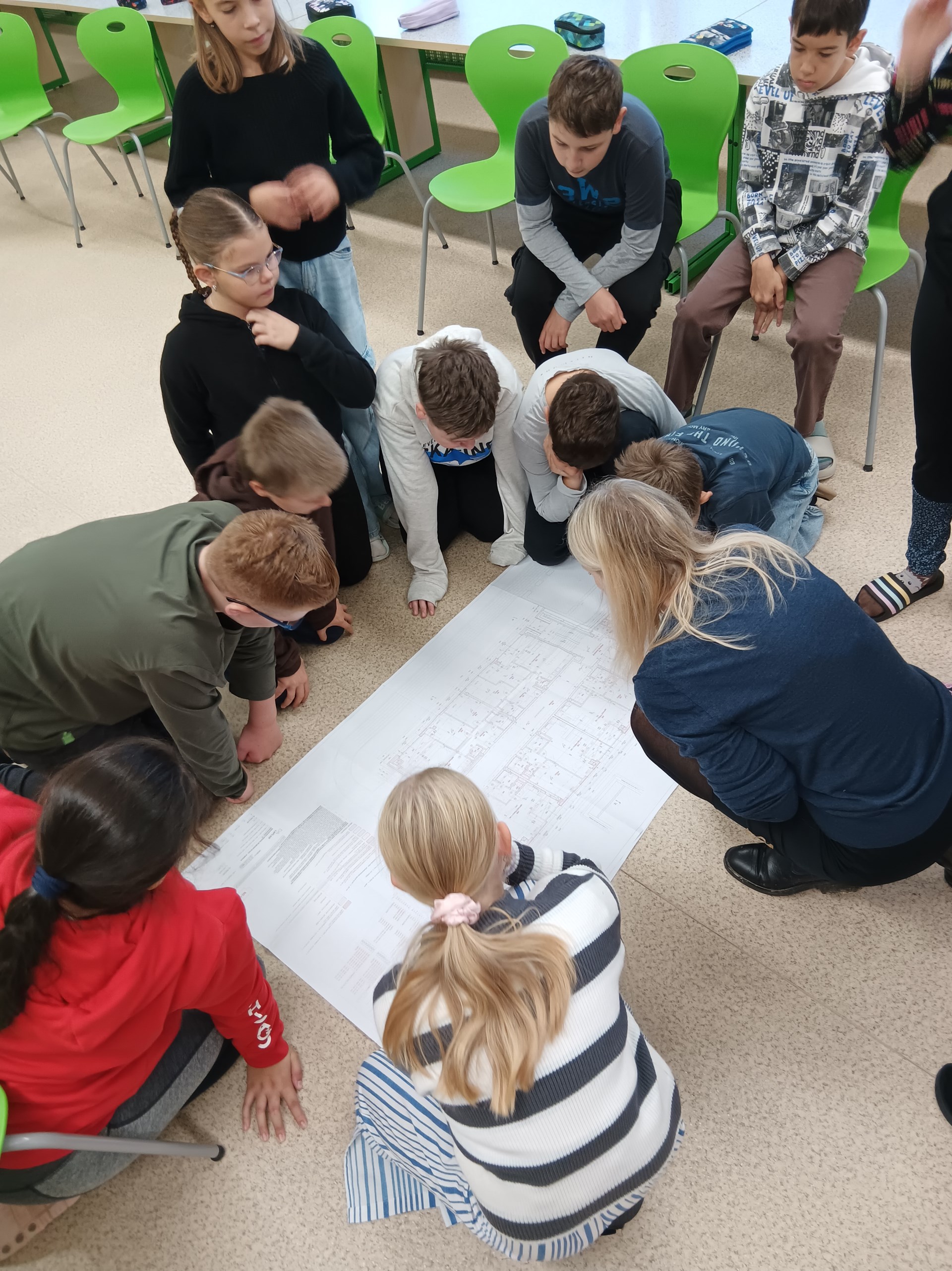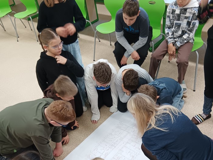 Učili se číst z výkresové dokumentace, hádali její váhu a poznávali, co znamená půdorys a řez. Potom se pustili do měření prostoru učebny (metrem, pásmem, laserovým měřičem i pomocí aplikace v iPhonu).