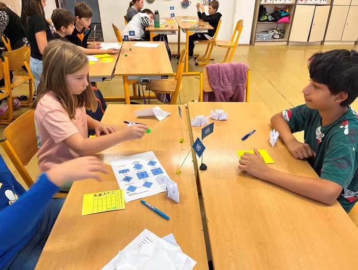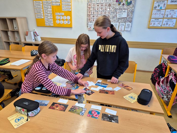 S žáky jsme si nejprve společně povídali o tom, co je Organizace spojených národů, kde sídlí, které státy stály u jejího vzniku a jakou roli hraje v rámci OSN Česká republika.