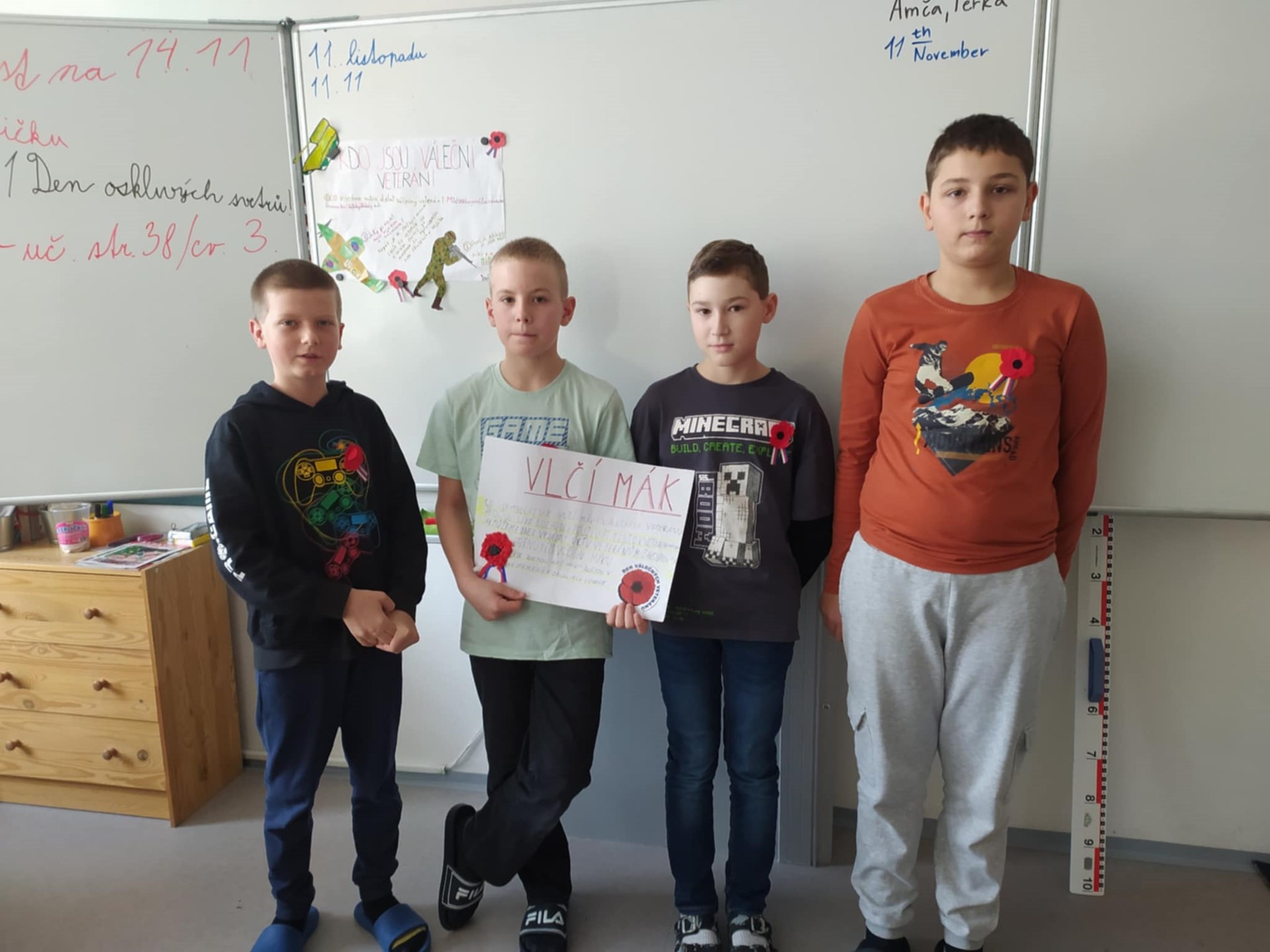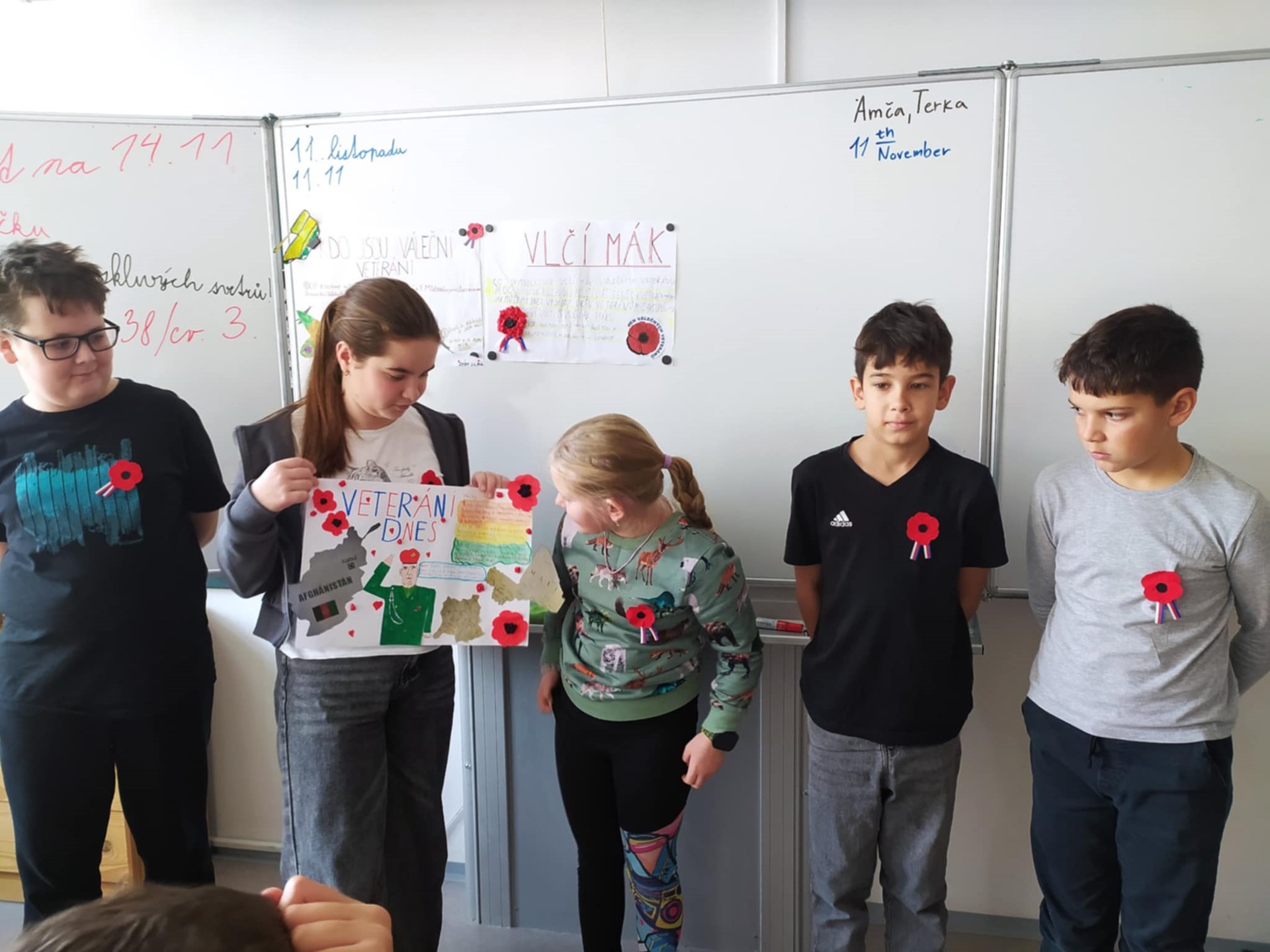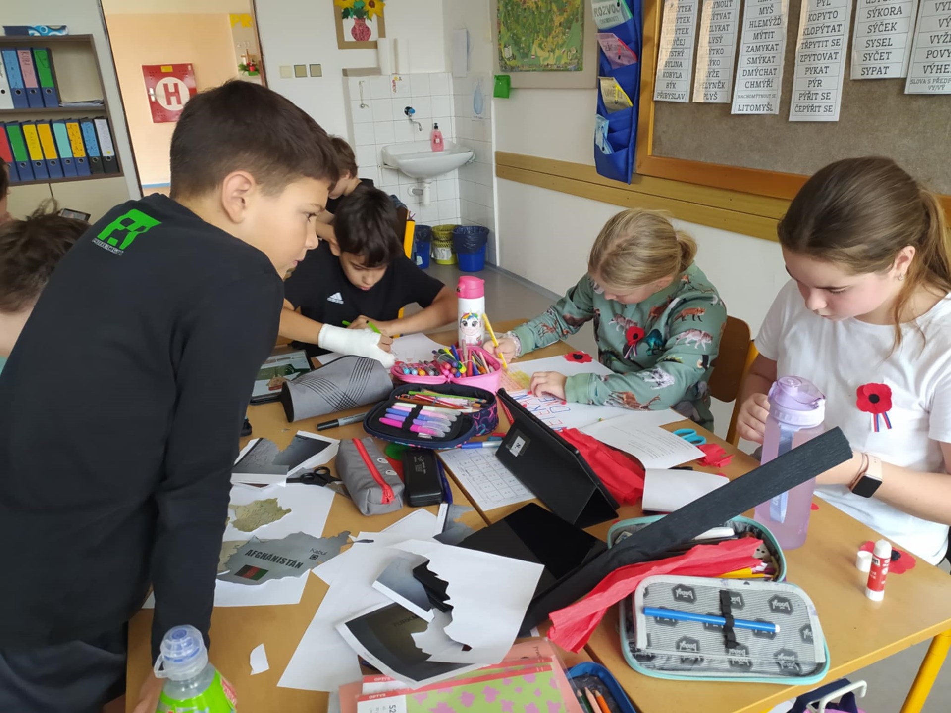 Po úvodní části se žáci rozdělili do menších skupin. Každá skupina zpracovávala jiné téma. Vytvořili plakát o symbolech, jiní odpovídali na otázky a hledali informace o českých vojácích. Nechyběla ani skupina, která se s velkým nadšením pustila do tvorby komiksu o odvaze a přátelství vojáka se psem. Součástí dne bylo i sledování krátkého videa o moderních veteránech, které v žácích vyvolalo spoustu emocí i otázek. Společně jsme přemýšleli nad tím, jak vojáci ve válce žili. Co jedli, kdo je ošetřoval, kde spali, kdo jim donesl pití nebo kam vůbec chodili na záchod. I tyto „obyčejné“ otázky pomohly žákům lépe pochopit, jak náročný život vojáků byl a je. Na závěr projektu jsme společně vytvořili malou výstavu prací, každý žák napsal krátký vzkaz válečným veteránům. S pokorou jsme celý den měli připnutý květ vlčího máku.