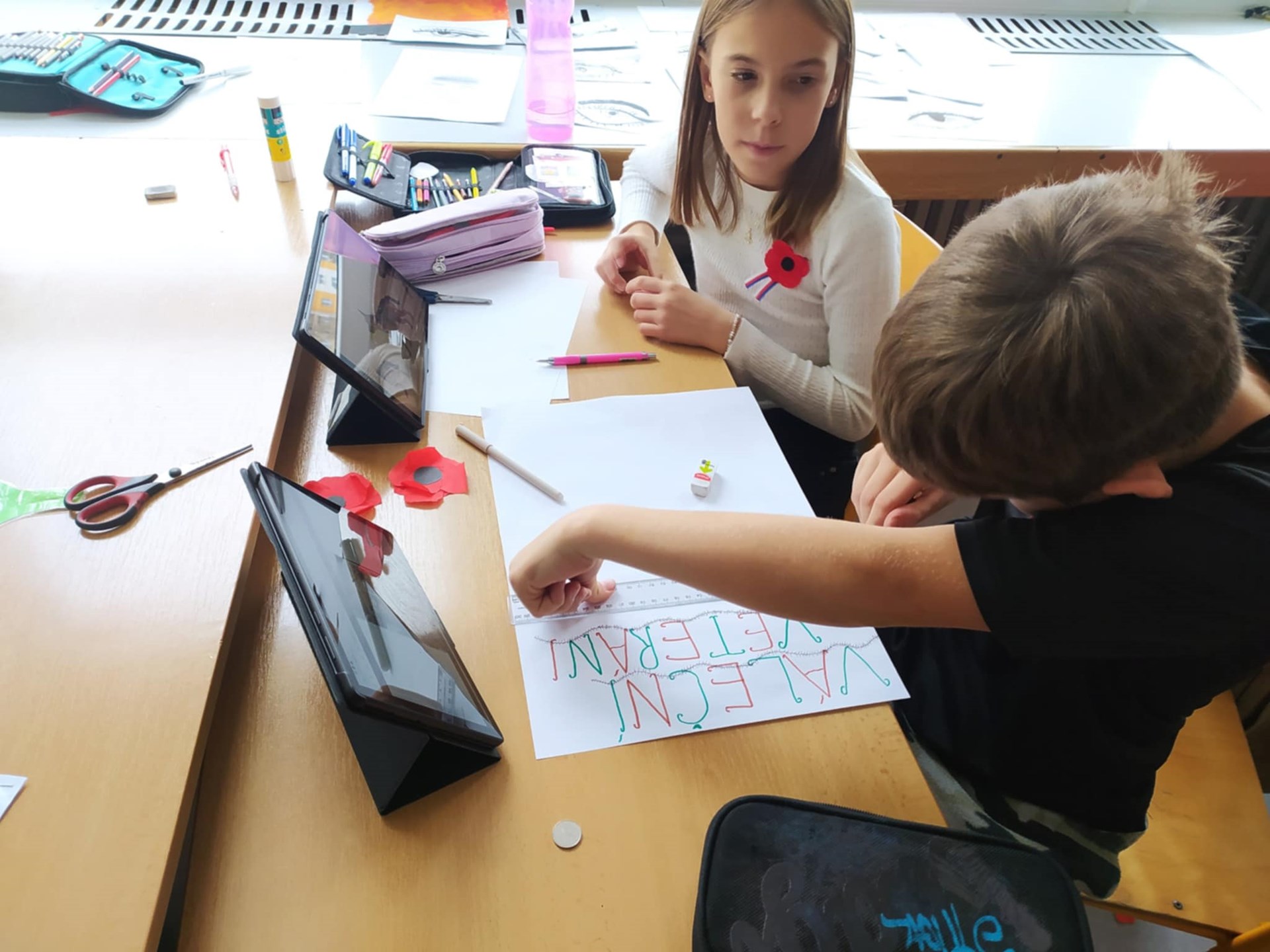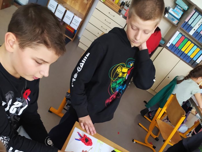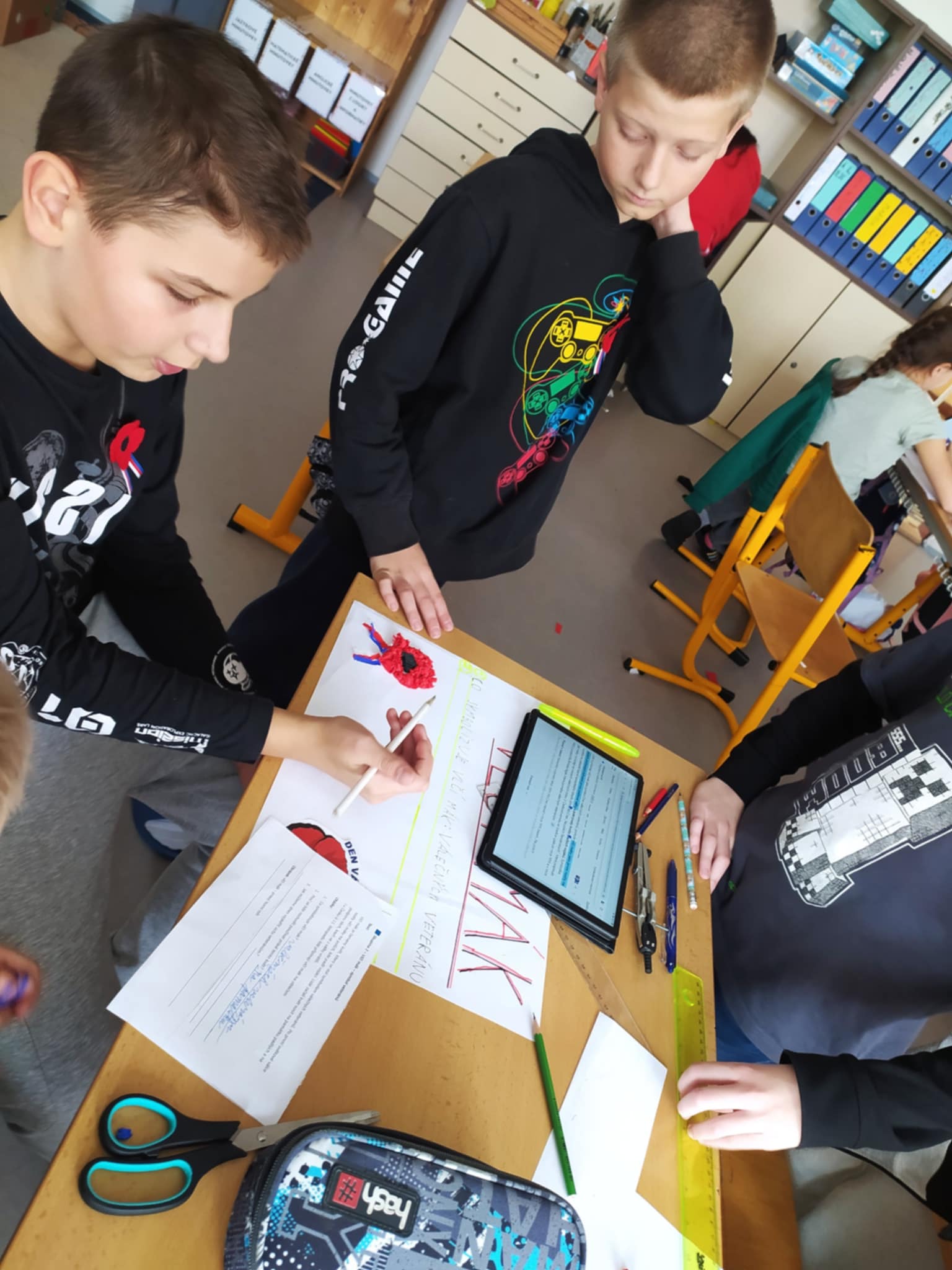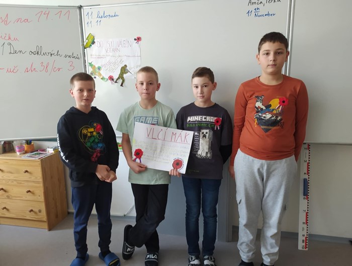 Po úvodní části se žáci rozdělili do menších skupin. Každá skupina zpracovávala jiné téma. Vytvořili plakát o symbolech, jiní odpovídali na otázky a hledali informace o českých vojácích. Nechyběla ani skupina, která se s velkým nadšením pustila do tvorby komiksu o odvaze a přátelství vojáka se psem. Součástí dne bylo i sledování krátkého videa o moderních veteránech, které v žácích vyvolalo spoustu emocí i otázek. Společně jsme přemýšleli nad tím, jak vojáci ve válce žili. Co jedli, kdo je ošetřoval, kde spali, kdo jim donesl pití nebo kam vůbec chodili na záchod. I tyto „obyčejné“ otázky pomohly žákům lépe pochopit, jak náročný život vojáků byl a je. Na závěr projektu jsme společně vytvořili malou výstavu prací, každý žák napsal krátký vzkaz válečným veteránům. S pokorou jsme celý den měli připnutý květ vlčího máku.