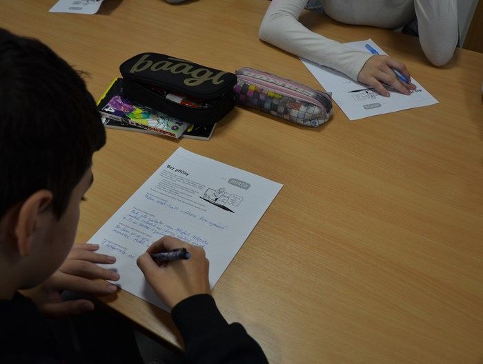 Na závěr workshopu si žáci mohli vyzkoušet krátké tvůrčí psaní – měli vymyslet pokračování hororu.