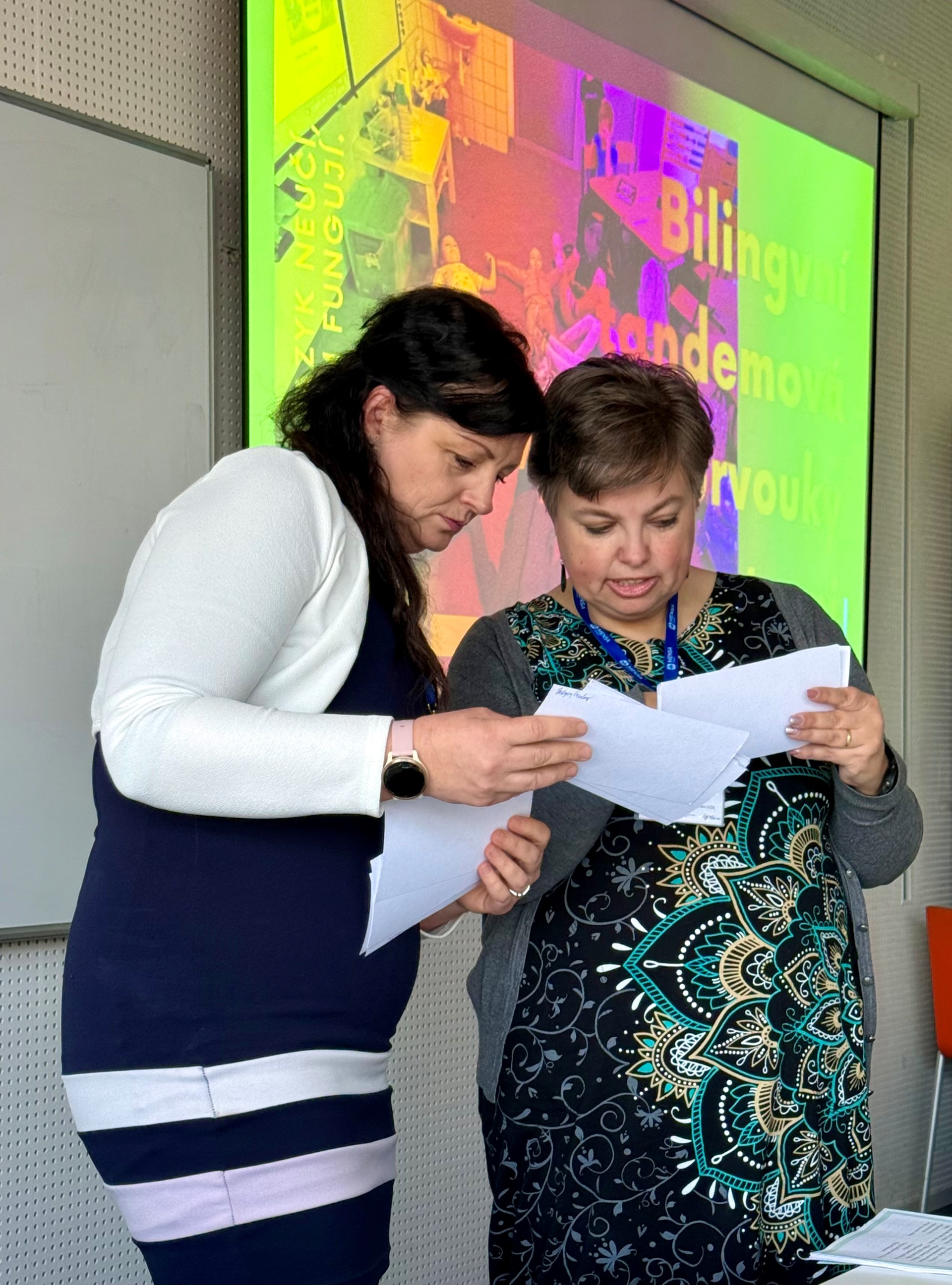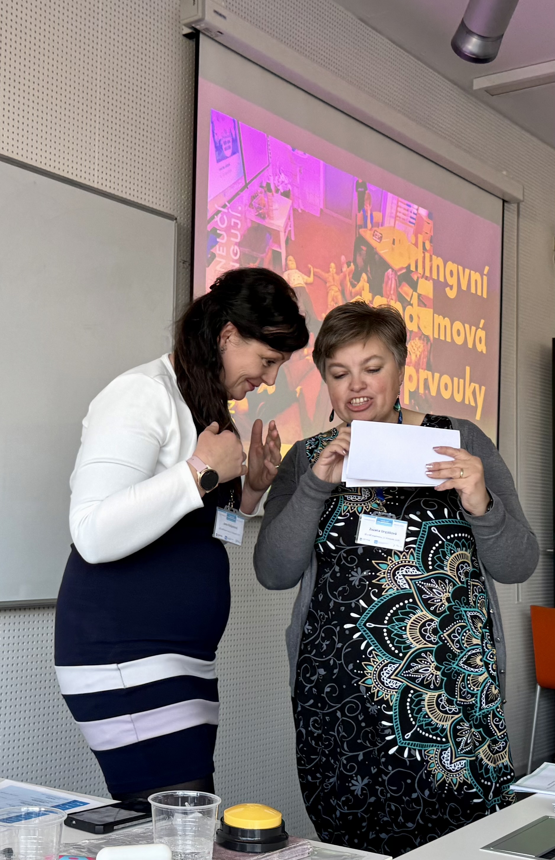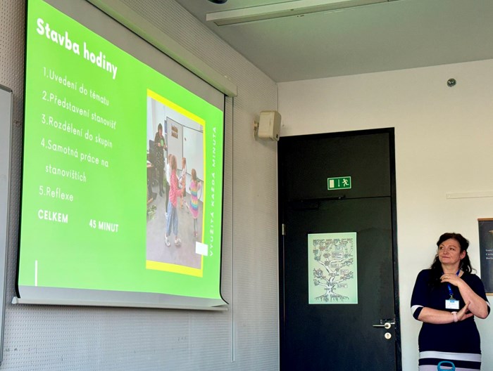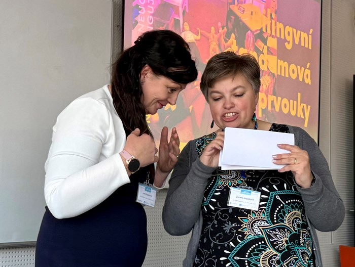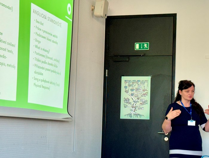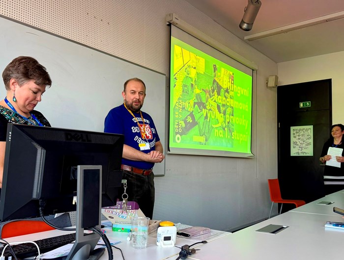 Máme velkou radost, ze mezi desítkami přednášejících byly také dvě paní učitelky naší školy. Paní Mgr. Zuzana Dryjáková a p. Mgr. Jana Kašparová byly organizátory osloveny, aby na této konferenci prezentovaly svůj vlastní nápad - tandemovou výuku v 1. třídě, kterou vedou v předmětu prvouka hned ve dvou jazycích současně. Díky propojení českého a anglického jazyka si žáci rozšiřují jak znalosti z oblasti přírody, tak související slovní zásobu. Celé učení probíhá hravou formou ve skupinkách na stanovištích.