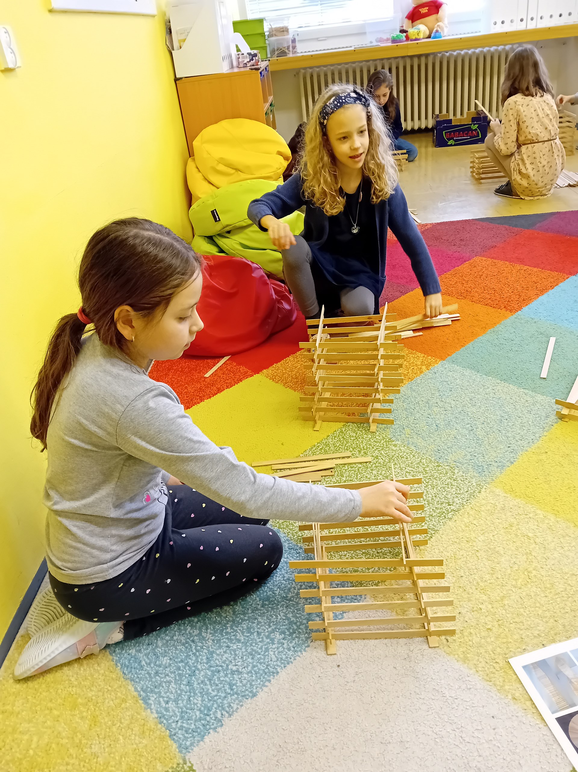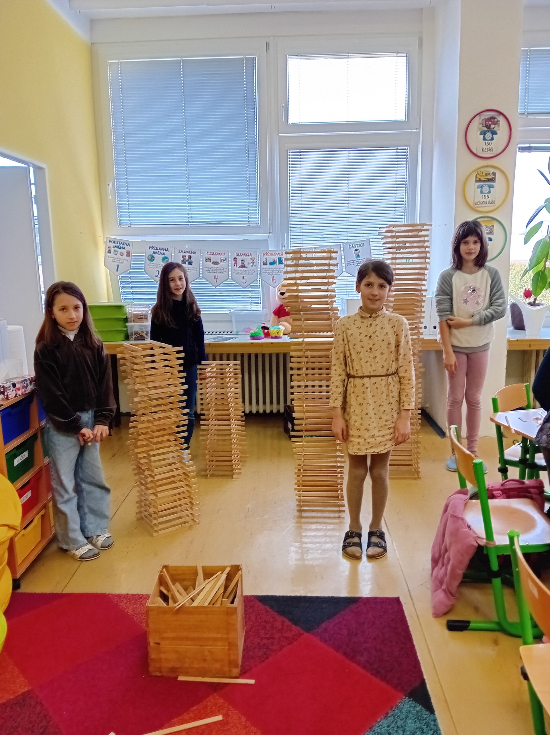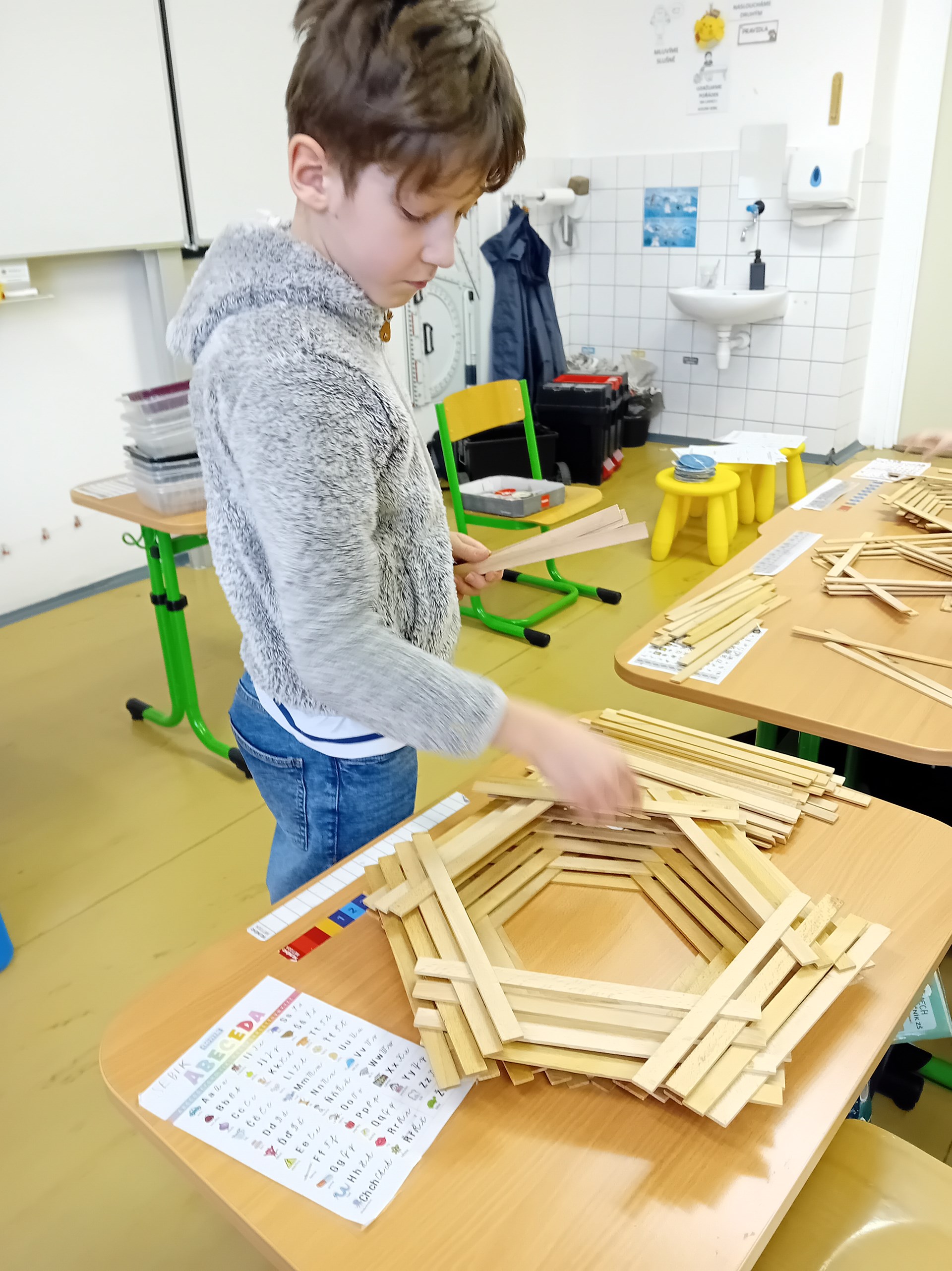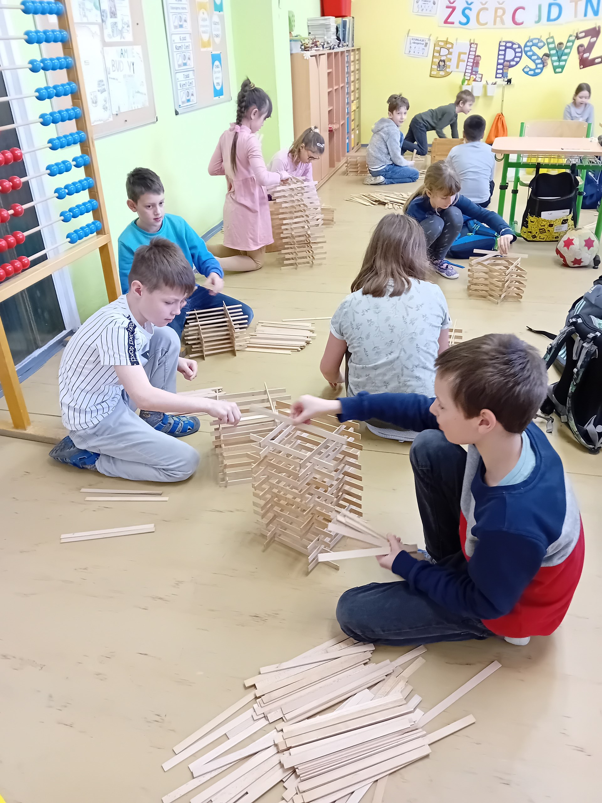 Žáci ze 3. A zažili jedno nevšední páteční dopoledne. Do třídy zavítal pan Samuel Fojtů s krabicemi plnými dřevěných lišt.