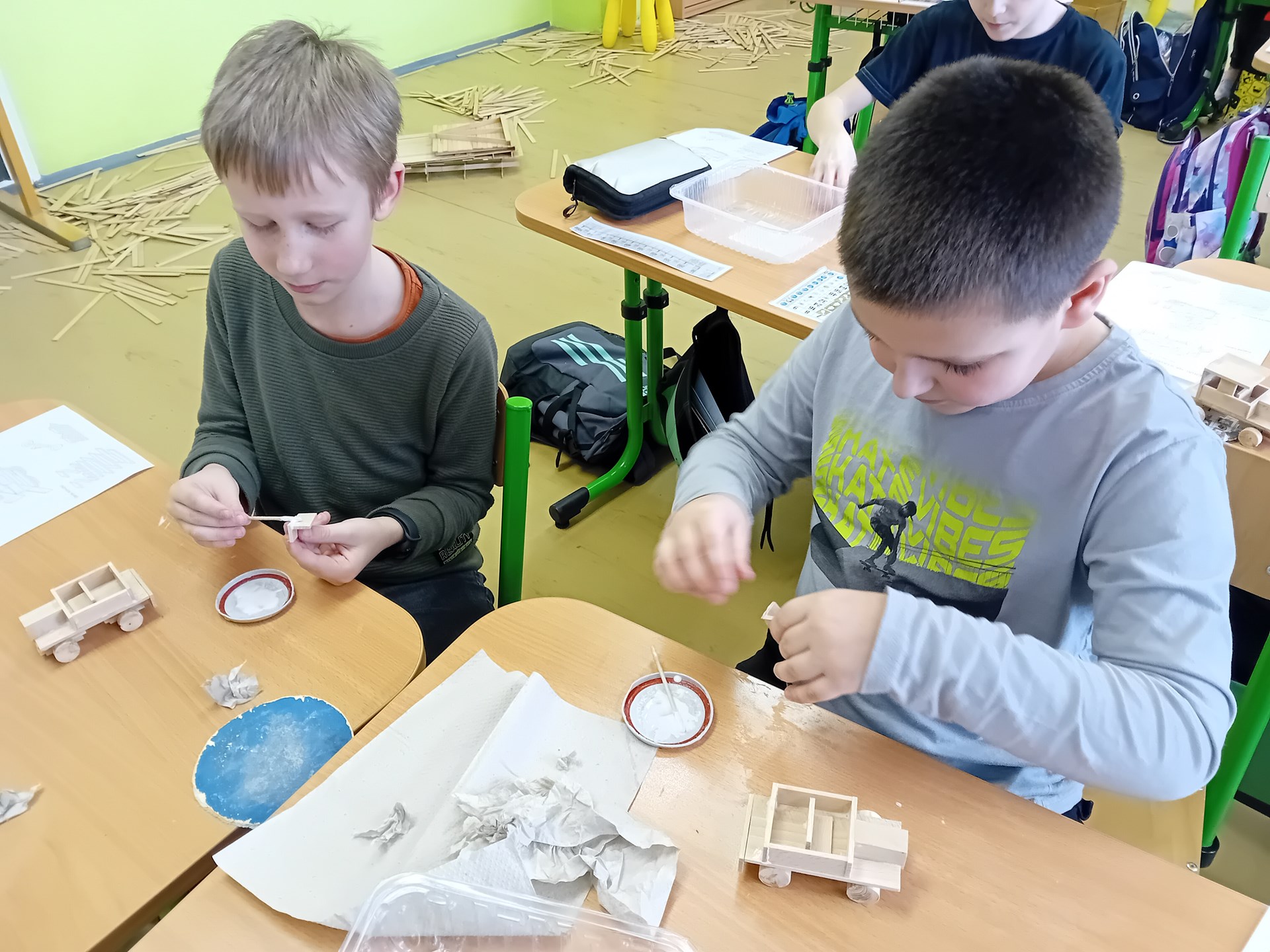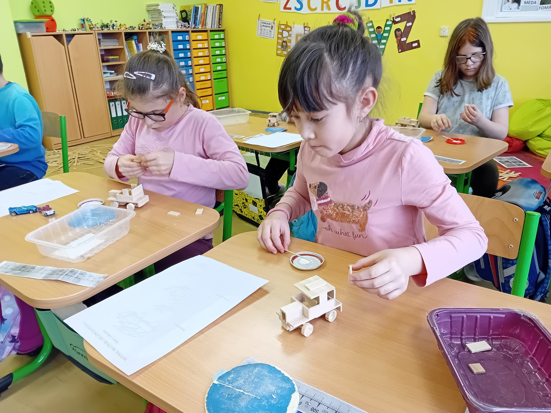 Žáci ze 3. A zažili jedno nevšední páteční dopoledne. Do třídy zavítal pan Samuel Fojtů s krabicemi plnými dřevěných lišt. Během výborně připraveného programu dětem vysvětlil, jak se zpracovává dřevo a pak již nastalo sestavování a lepení autíček - bugatek podle plánu. Ukázalo se, že jsou naši třeťáci velmi zruční, proto ještě vyrobili šperkovnici. Největší výzva však byla stavba věží a také jejich následné bourání. Děti byly z celého programu nadšené a radostně si domů odnášely vlastnoručně slepené modely.