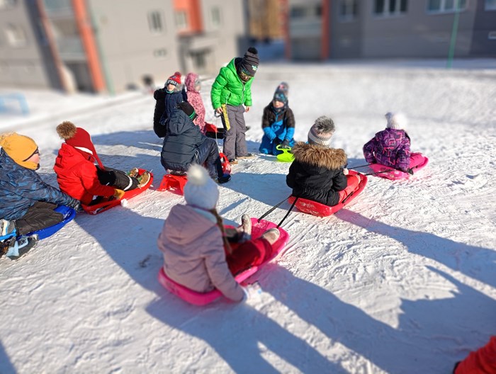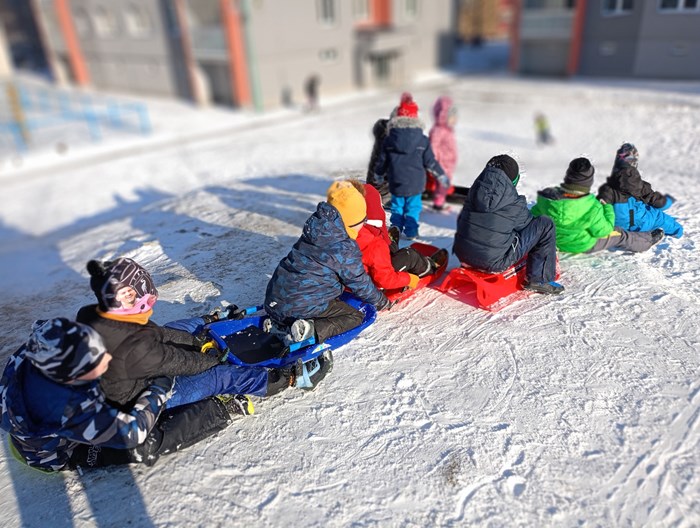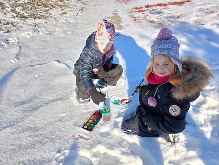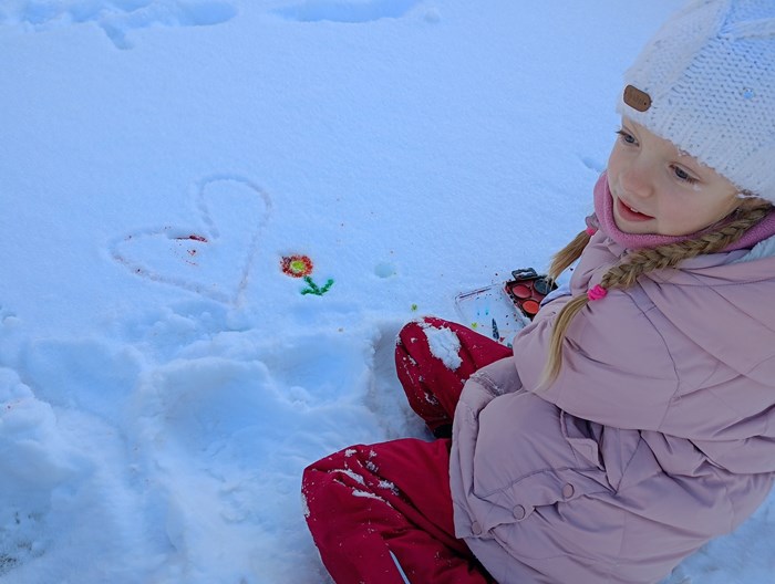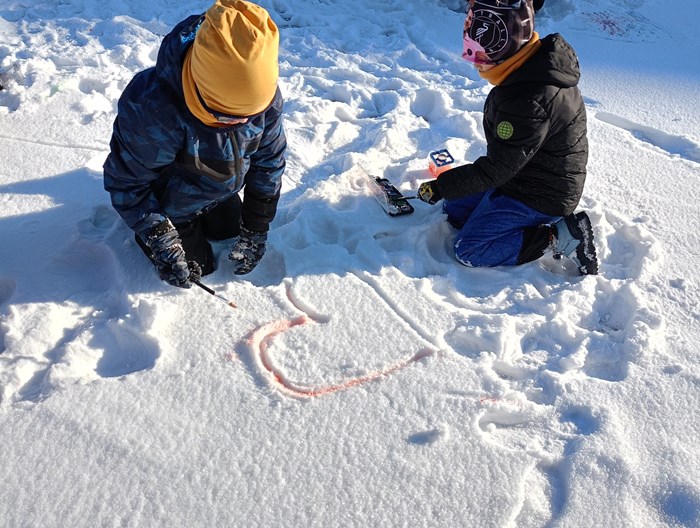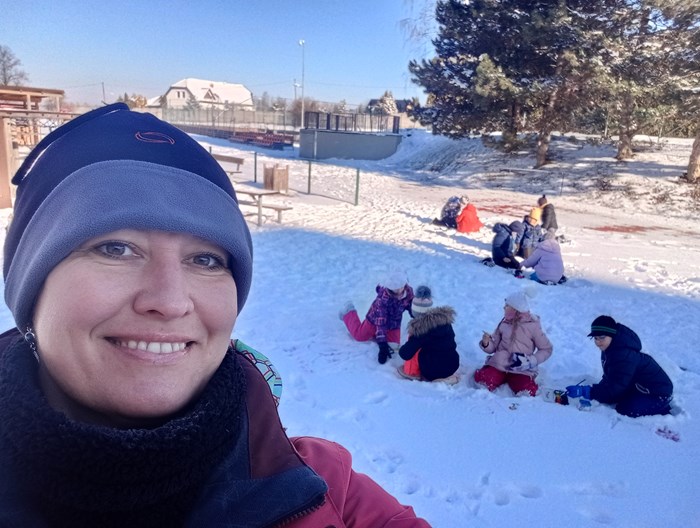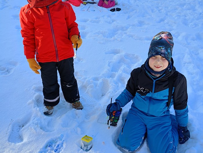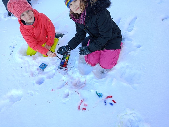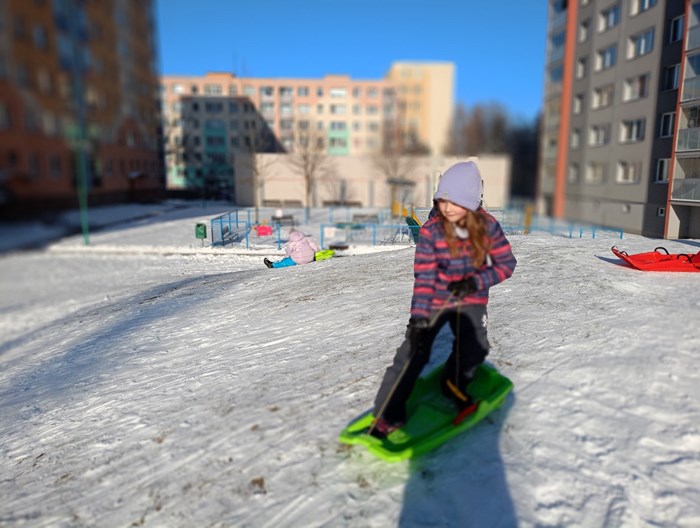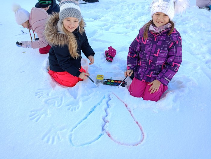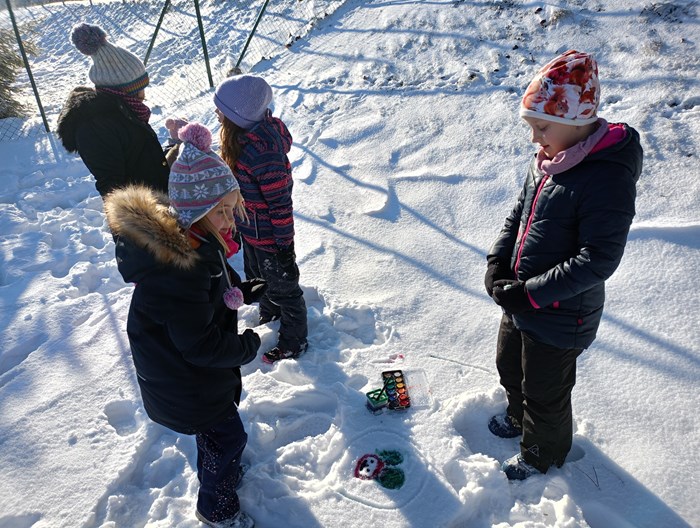 Kopřivnická 2.A využila krásné slunné počasí k posílení imunity výukou na čerstvém vzduchu - malování na sněhu, bobování a sáňkování.