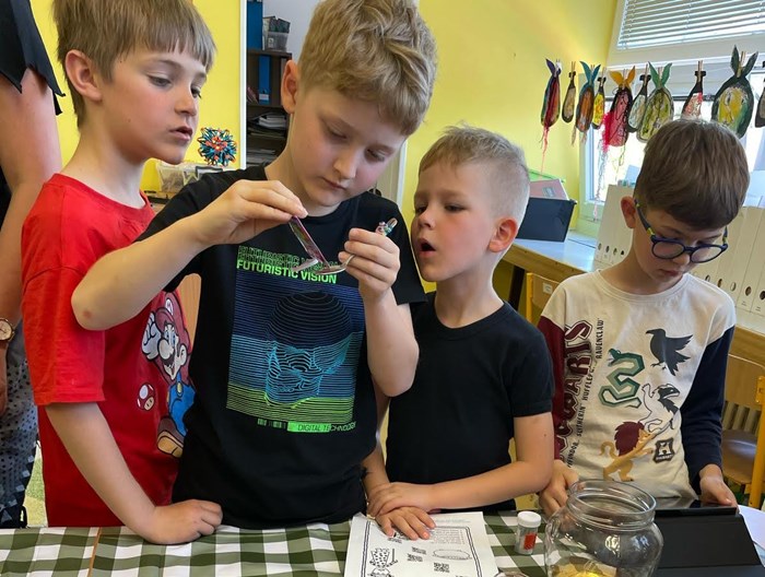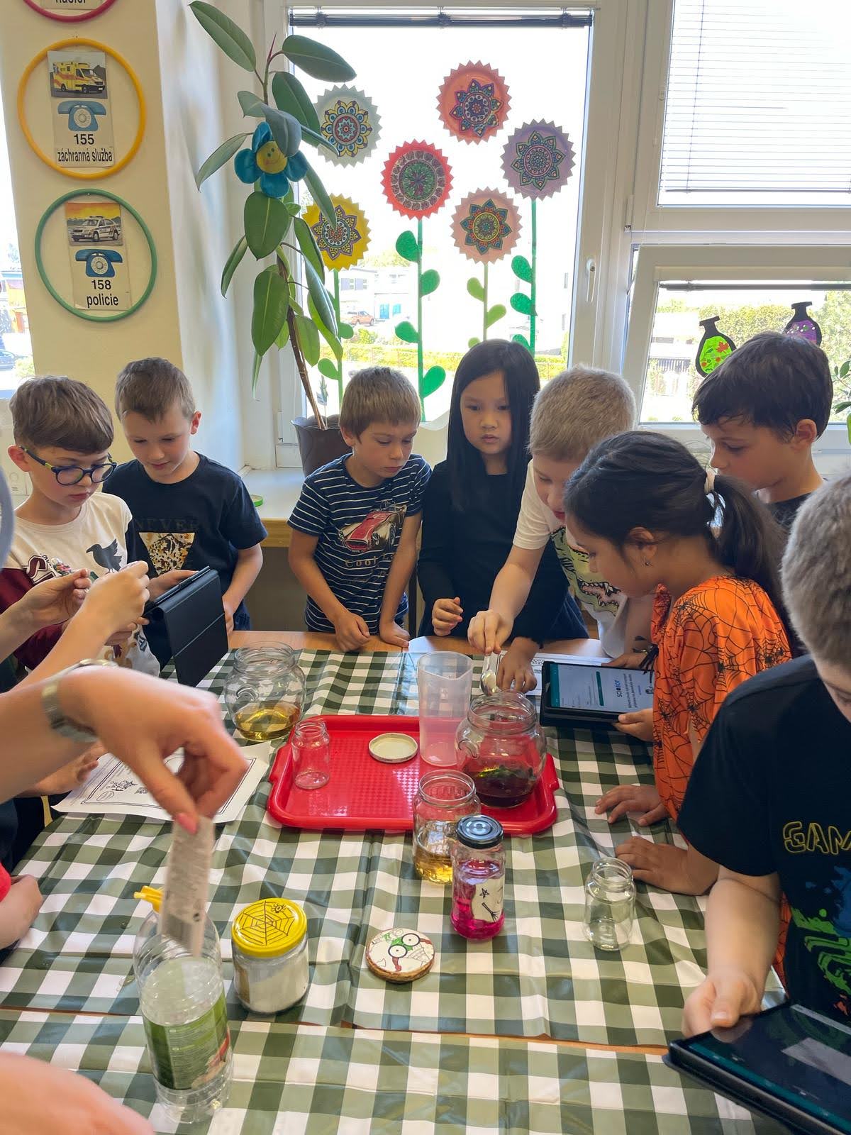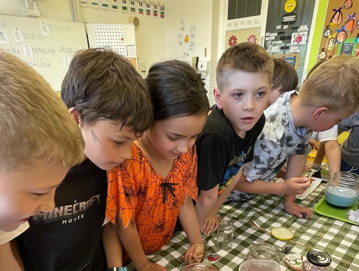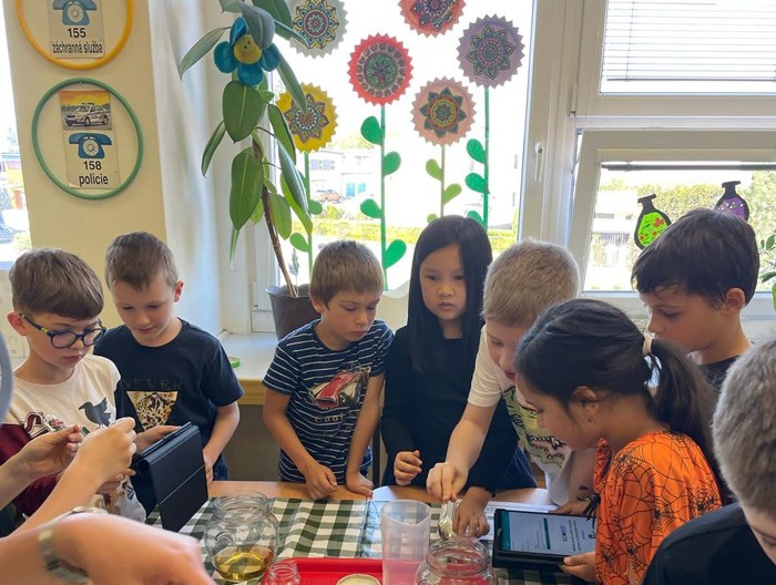 Kombinace práce s tabletem (čtení QR kódu) a surovinami (soda, ocet, třpytky, barvivo) vedla ve třídě k velkému nadšení.