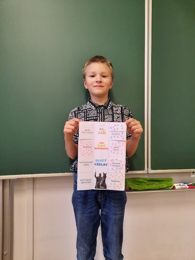 Žáci napříč třídami během dne plnili mnoho zajímavých úkolů. Pracovali s textem, plnili svatováclavskou stezku s tajenkou, vyhledávali informace na internetu, vyrobili si papírovou Svatováclavskou korunu, poslechli si chorál a téma výtvarně zpracovali. Práce skupinek i jednotlivců byly velmi povedené.