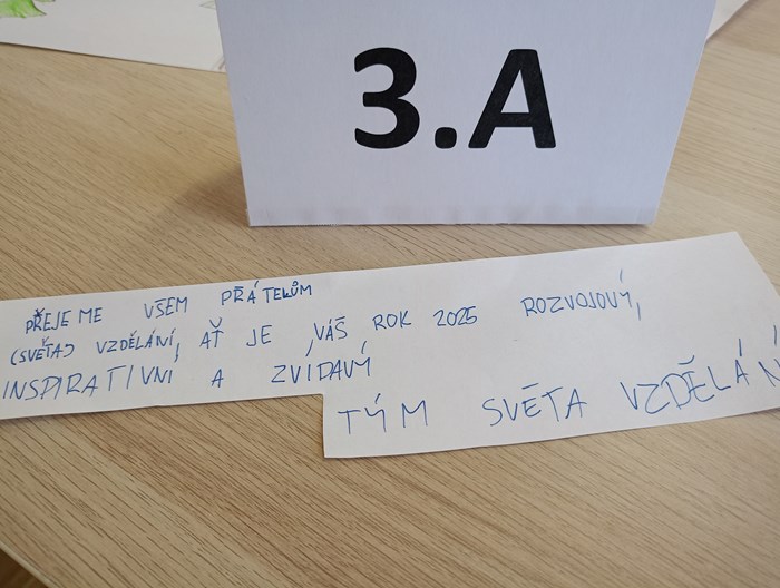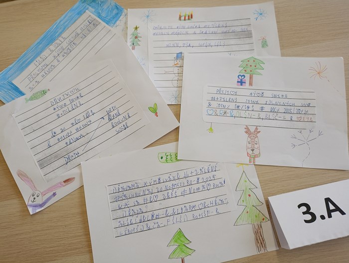 Třída 3.A se rozhodla přání PF 2025, které nám zašifrované poslal Svět vzdělání rozluštit a ve skupinkách napsat svoje přáníčka, opět zašifrovaná.