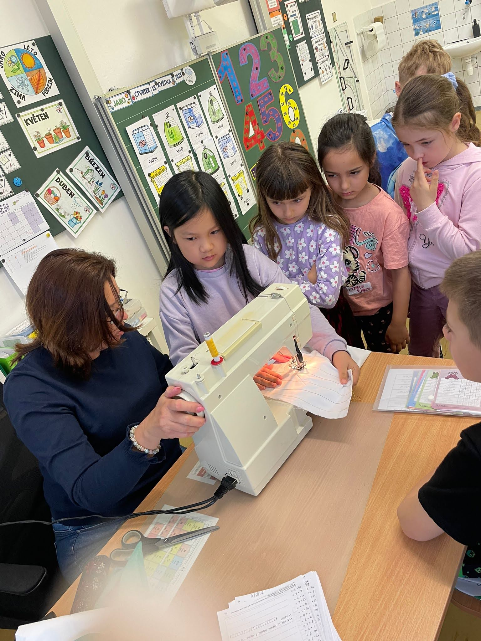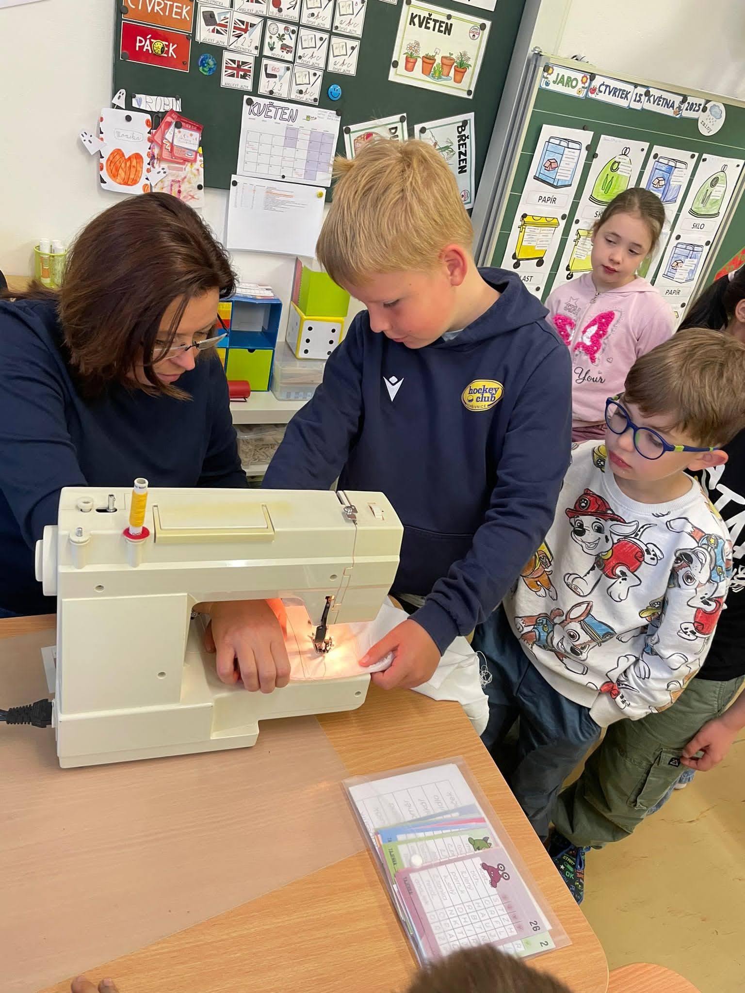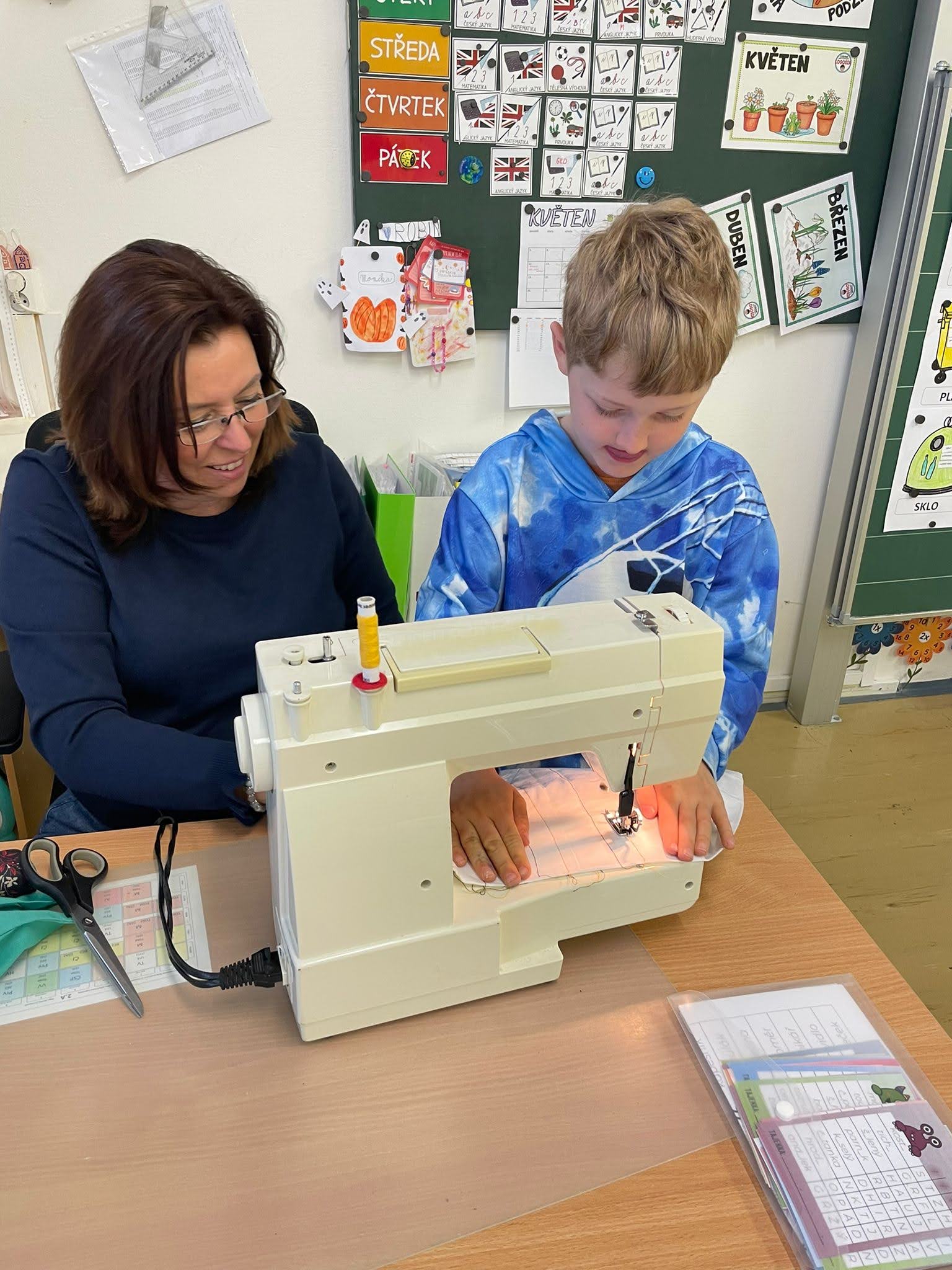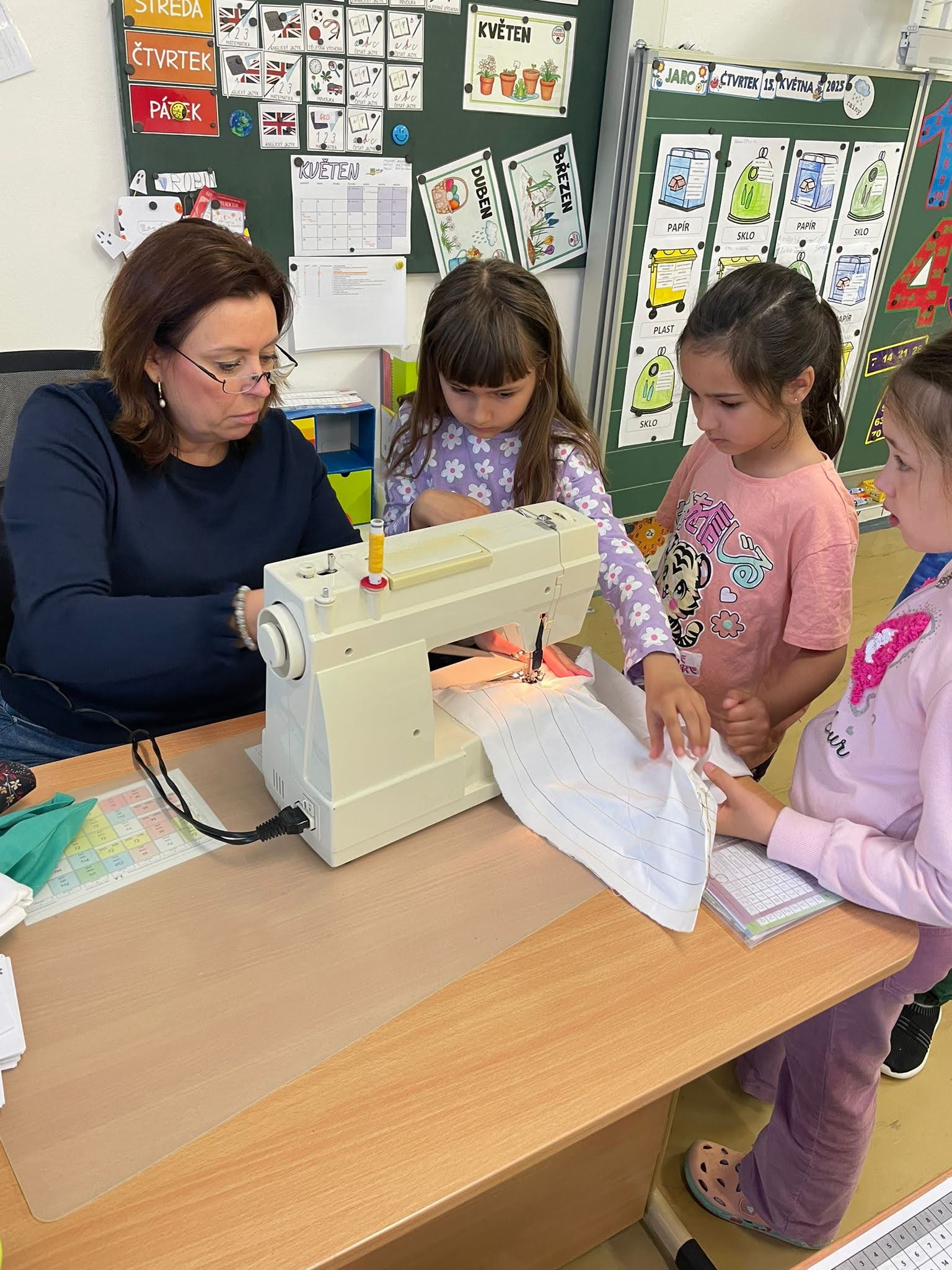 V českém jazyce se učíme o slovních druzích. Poznáváme slovesa podle obrázků. Co to ta paní dělá? Šije? Nebo tká? A problém je na světě. Mnohé děti neznají, jak vypadá a funguje šicí stroj. Nastupuje tedy činnostní učení, a tak paní učitelka vybavená šicím strojem ukazuje, jaké jsou součásti stroje, kde se navlékají nitě a děti se pouštějí do šití. Dnes jen kousek rovného stehu, ale brzy ušijeme svůj první výrobek - pytlíky na drobnosti z prázdnin. Už se nemůžeme dočkat!