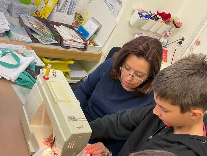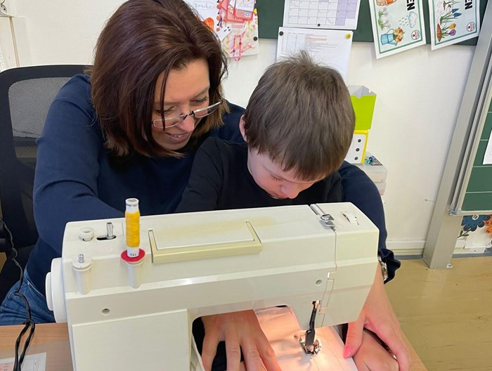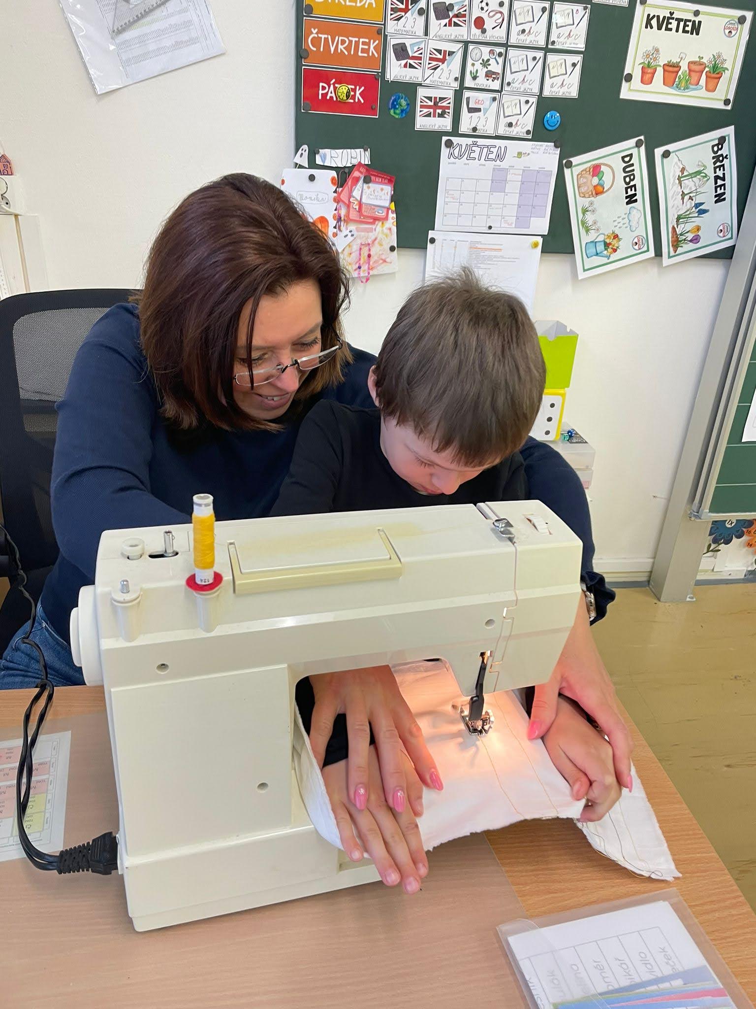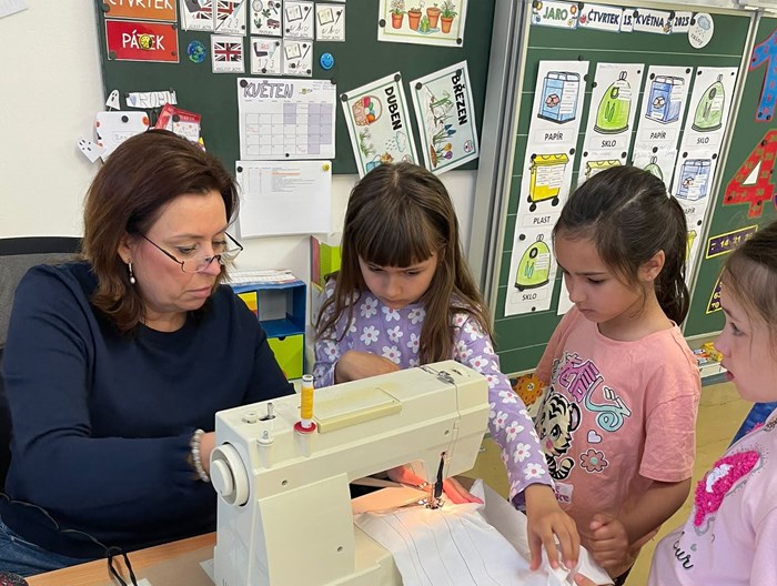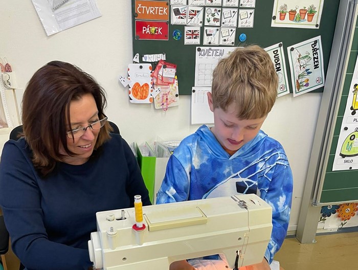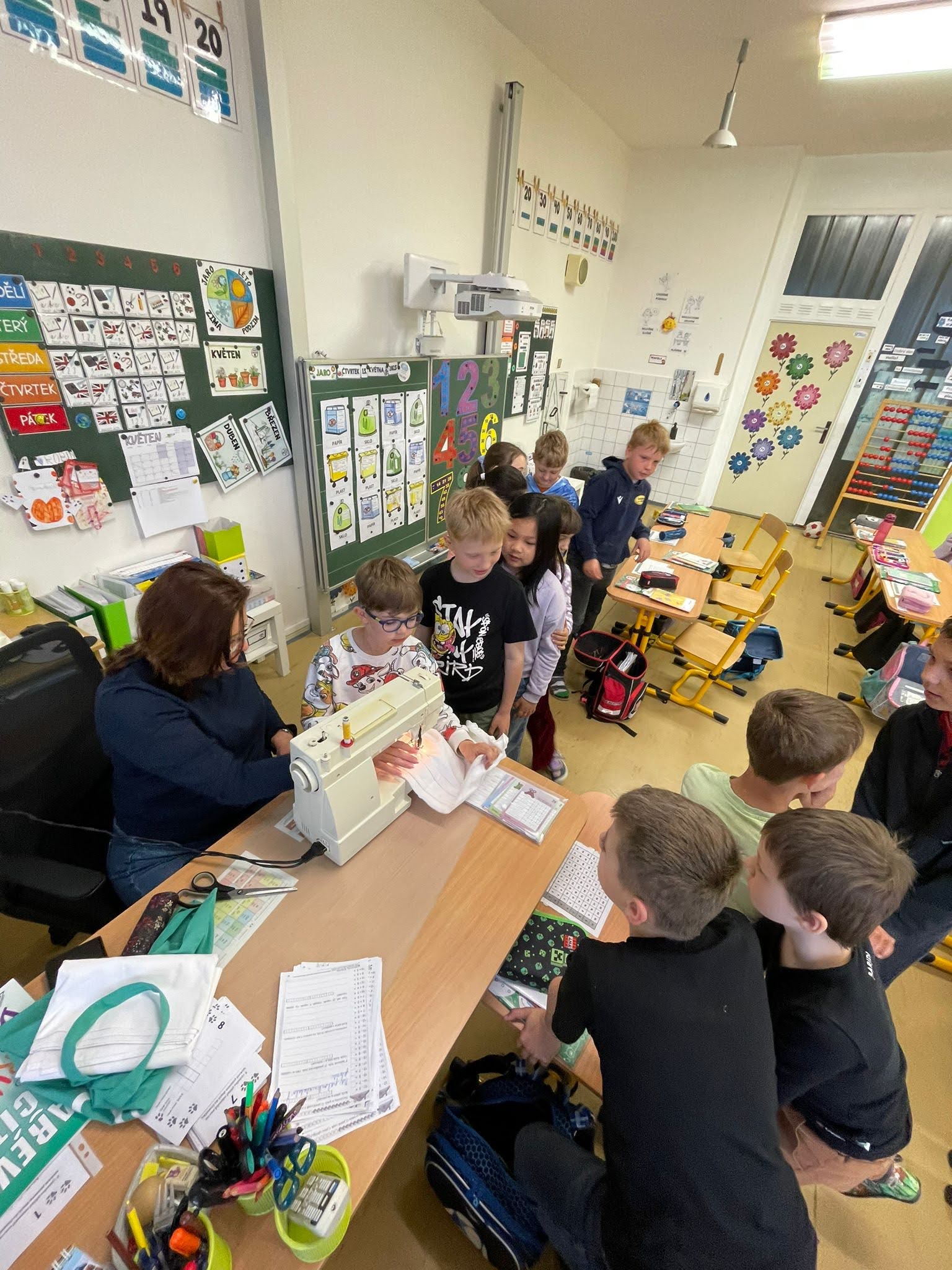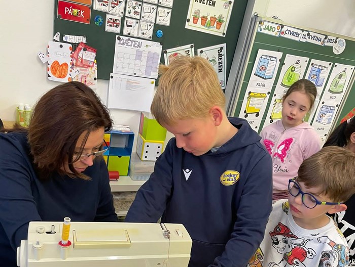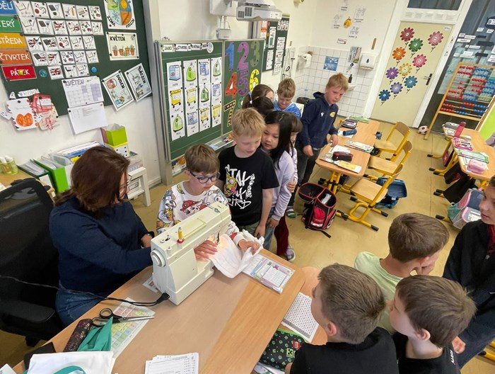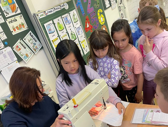 V českém jazyce se učíme o slovních druzích. Poznáváme slovesa podle obrázků. Co to ta paní dělá? Šije? Nebo tká? A problém je na světě. Mnohé děti neznají, jak vypadá a funguje šicí stroj. Nastupuje tedy činnostní učení, a tak paní učitelka vybavená šicím strojem ukazuje, jaké jsou součásti stroje, kde se navlékají nitě a děti se pouštějí do šití. Dnes jen kousek rovného stehu, ale brzy ušijeme svůj první výrobek - pytlíky na drobnosti z prázdnin. Už se nemůžeme dočkat!