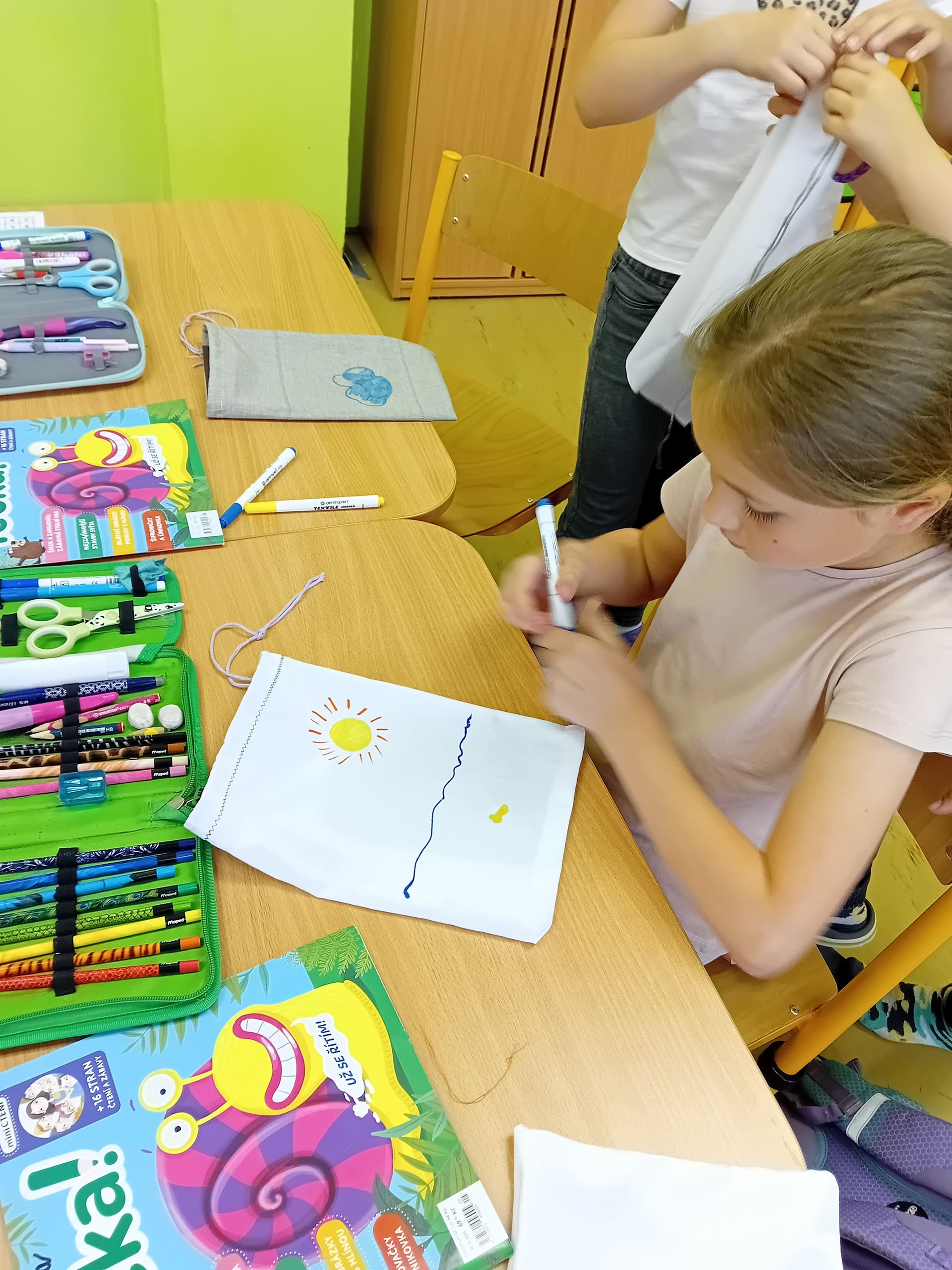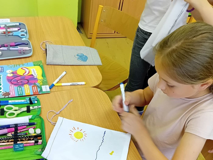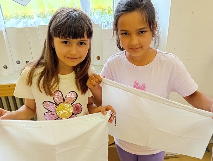 Děti se nejdříve naučily navléct šňůrku do tunýlku a poté s dopomocí sešily strany látky tak, aby vznikl pytlík. Na závěr si je děti vyzdobily kresbami s motivy prázdnin.