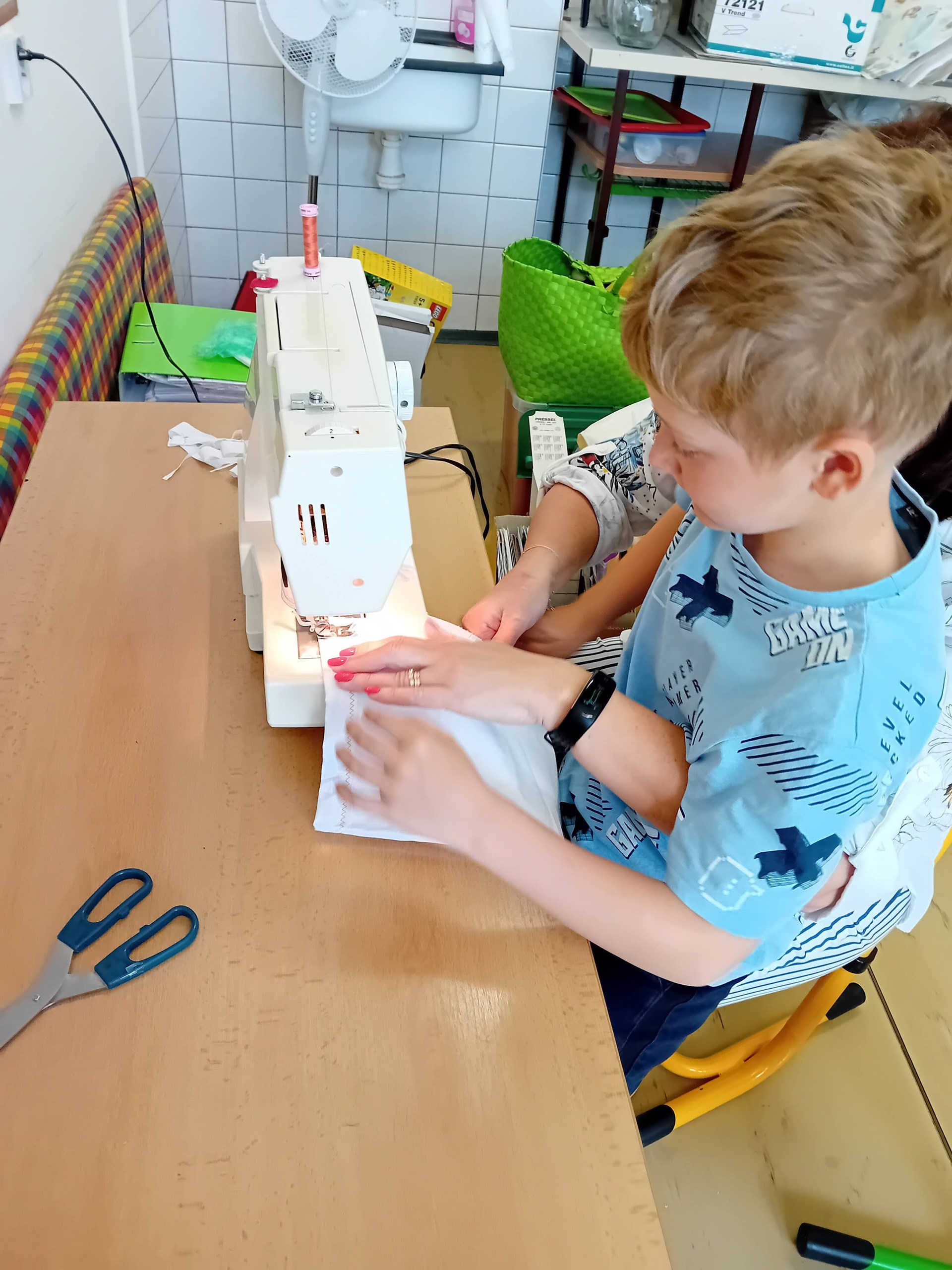 Vše odstartovalo dumání dětí nad tím, jak se šije pomocí stroje. Protože víme, že děti se lépe učí praxí a vnímáním světa okolo více smysly, tak byly seznámeny s opravdovým šicím strojem.