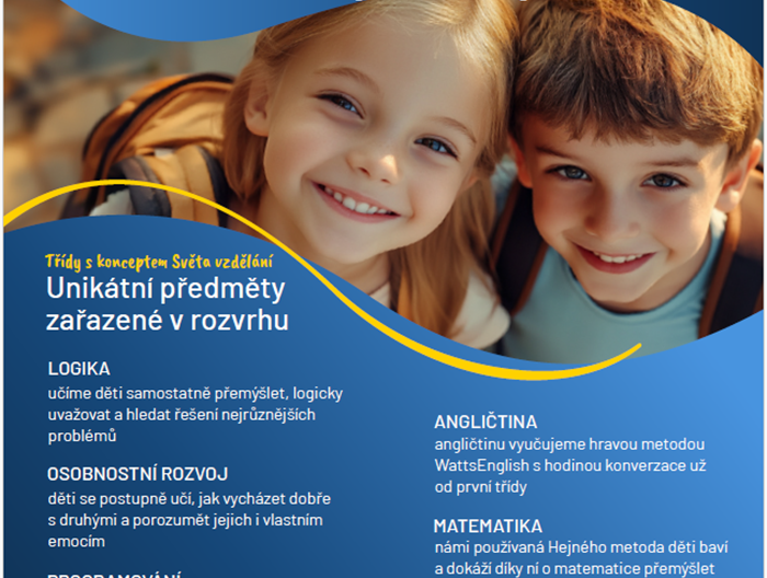 V září 2026 budeme v naší škole ve spolupráci se Světem vzdělání, z. s. otevírat další třídu s rozšířenou výukou od prvního ročníku ZŠ (letos již posedmé).
