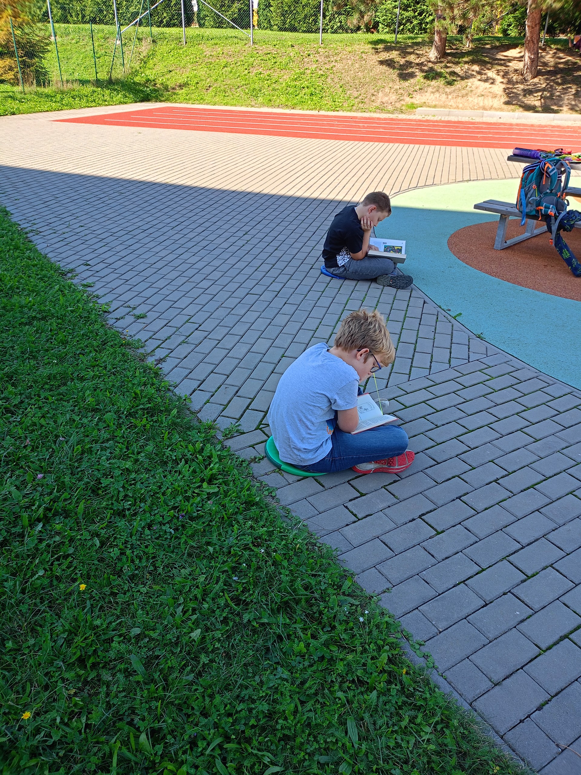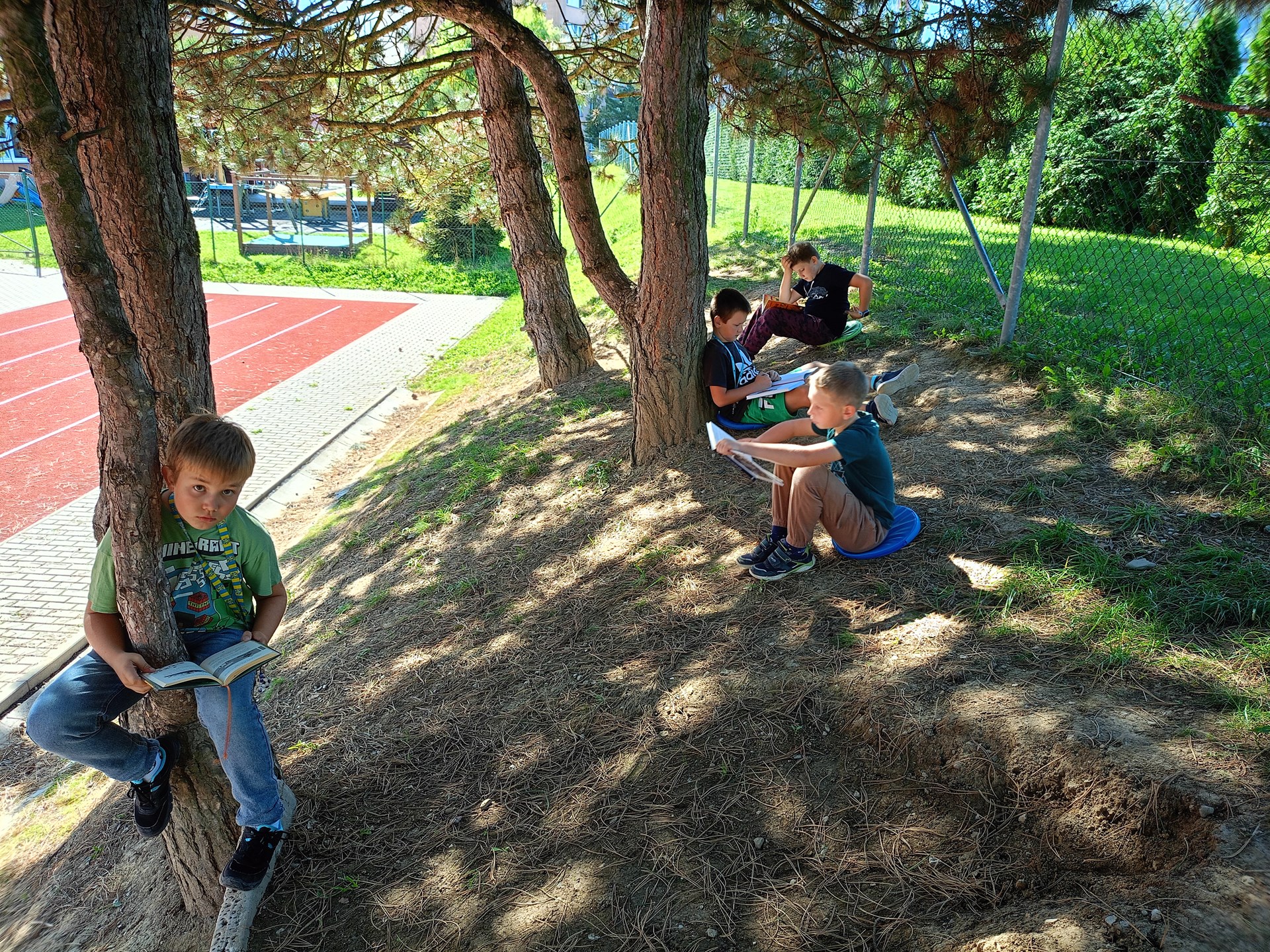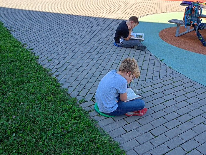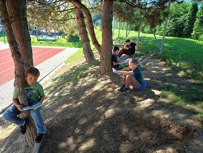 Je krásně, a tak proč být ve třídě, když můžeme být venku? Třída 4. A se rozhodla tvůrčím způsobem opakovat zlomky, o přestávce si zacvičit na průlezkách a poté si v klidu číst ve vonném stínu borovic zajímavou knihu ze školního knižního boxu.